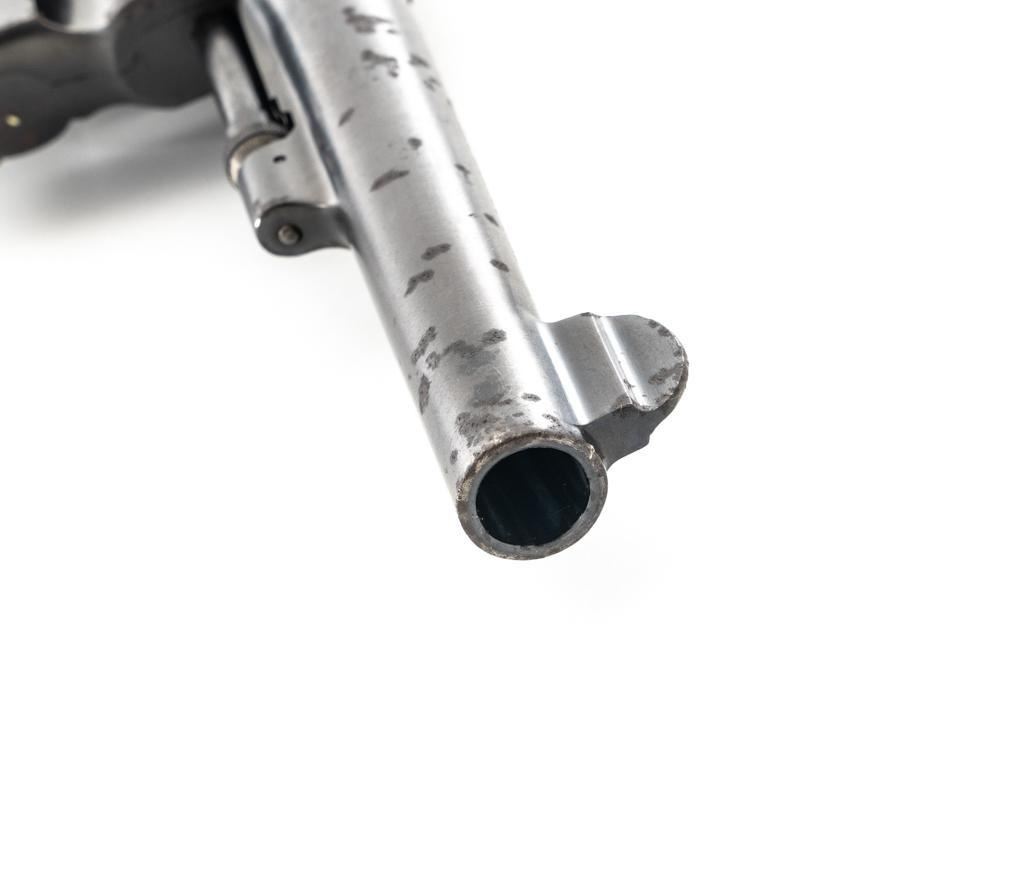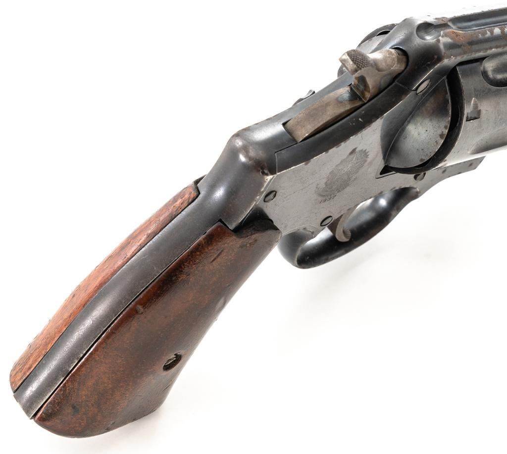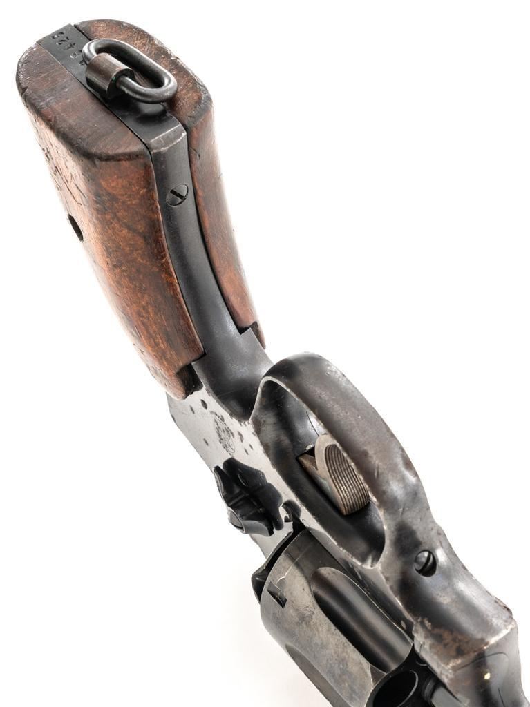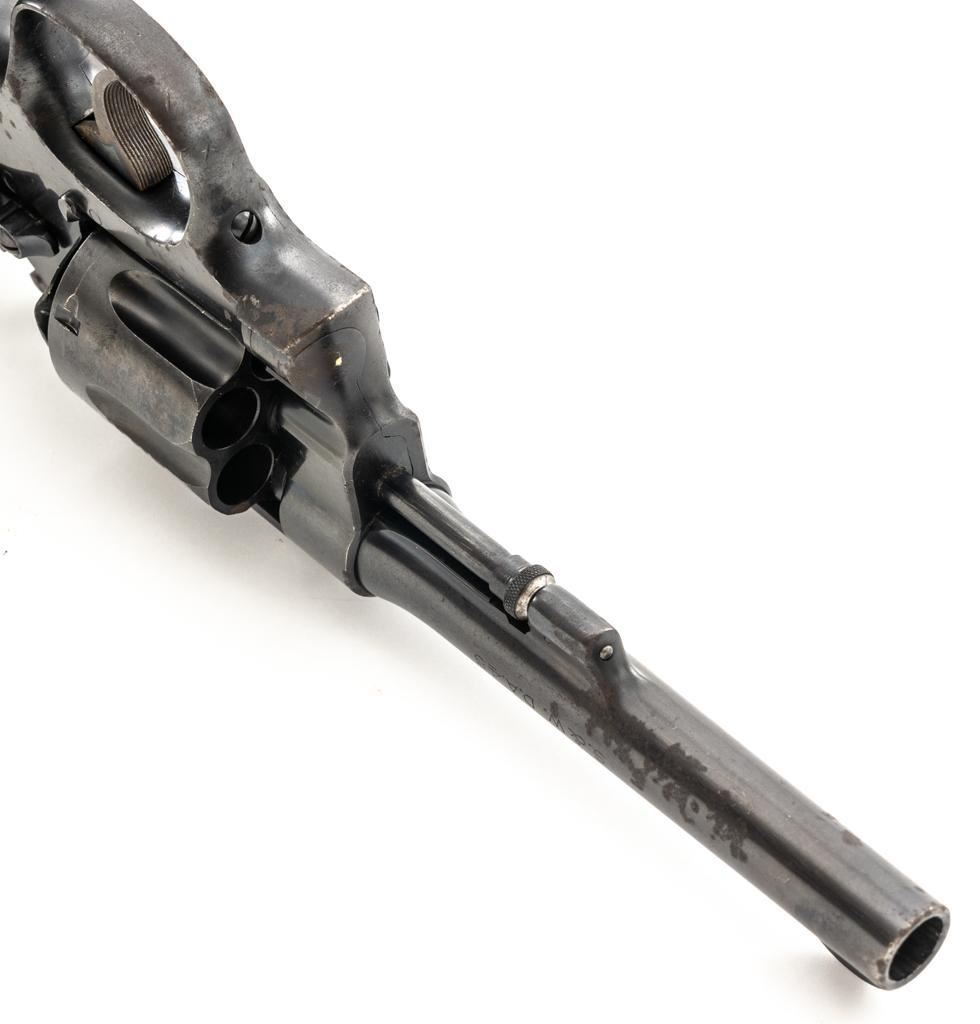 Brazilian Contract Smith & Wesson Model of 1917 .45 Hand Ejector Double Action Revolver, #208425, .45 ACP cal., 5.5" barrel, blue finish, smooth walnut two-piece grips, lanyard ring, 5-screw frame, half-round blade front and fixed square notch rear sight, with color case hardened hammer and trigger. Factory markings are clear, with a crisp Brazilian National Crest on the right side of the frame, dated 1937. Import marked on the left side of the grip frame, under the panel. Matching serial numbers on the cylinder, barrel, and frame. Revolver is in very good overall condition, retaining approx. 84%-86% thinning factory finish, showing moderate wear at the muzzle, light to moderate scattered spots of surface rust and corrosion. Top strap shows heavier rust due to poor storage. Trigger and hammer display muted color case hardening. Grips are in good condition, with dents and impressions consistent with service use and wear around the bases. Action fuctions well. Bore is good, with scattered light corrosion and defined rifling. Est.: $400-$700. (C&R/PPT)