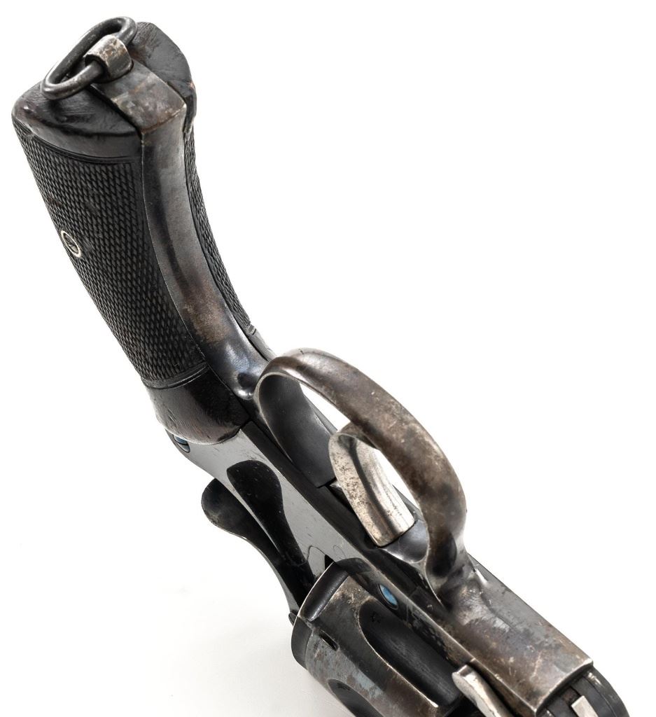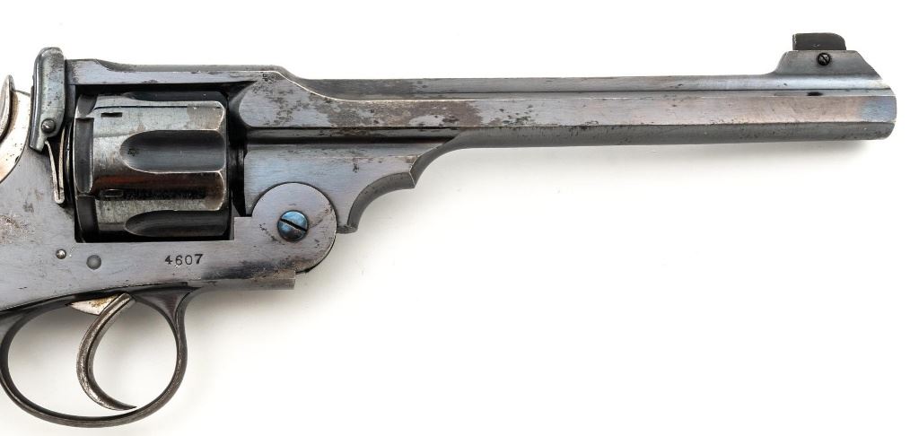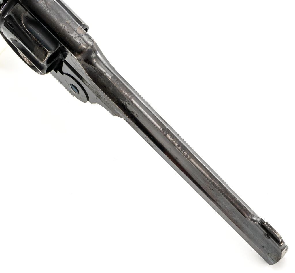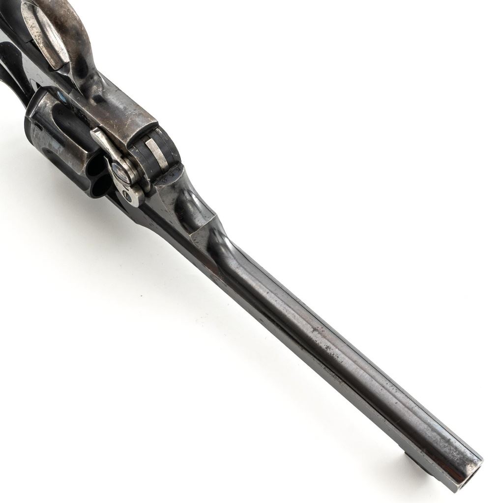 Webley WG Army Double Action Revolver, #4607, .45 ACP cal., 7.5" flat sided barrel, blued finish with bright hammer, trigger, and cam mechanism; checkered walnut grips, pinned blade front sight, fixed rear sight with "U"-notched groove, with swiveling lanyard loop. Left side of the frame marked "WEBLEY PATENTS" with a "(Winged Bullet)/W&S" trademark logo. Left side of the barrel is stamped with a crowned "BV" view stamp. No other markings except serial number. Barrel is numbered but does not match. Revolver was importer converted to .45 ACP cal. by machining off the rear of the cylinder. Condition overall is very good, retaining approx. 70% blue, showing general flaking, and patina. Grips appear to be period replacements and have been reshaped along the lower outside edge, now with general handling marks and flattening to the checkering detail. Action locks up, cycles, and extracts smoothly. Bore and chambers have some scattered spots of patina, rifling is good. Est.: $800-$1,100. (C&R)