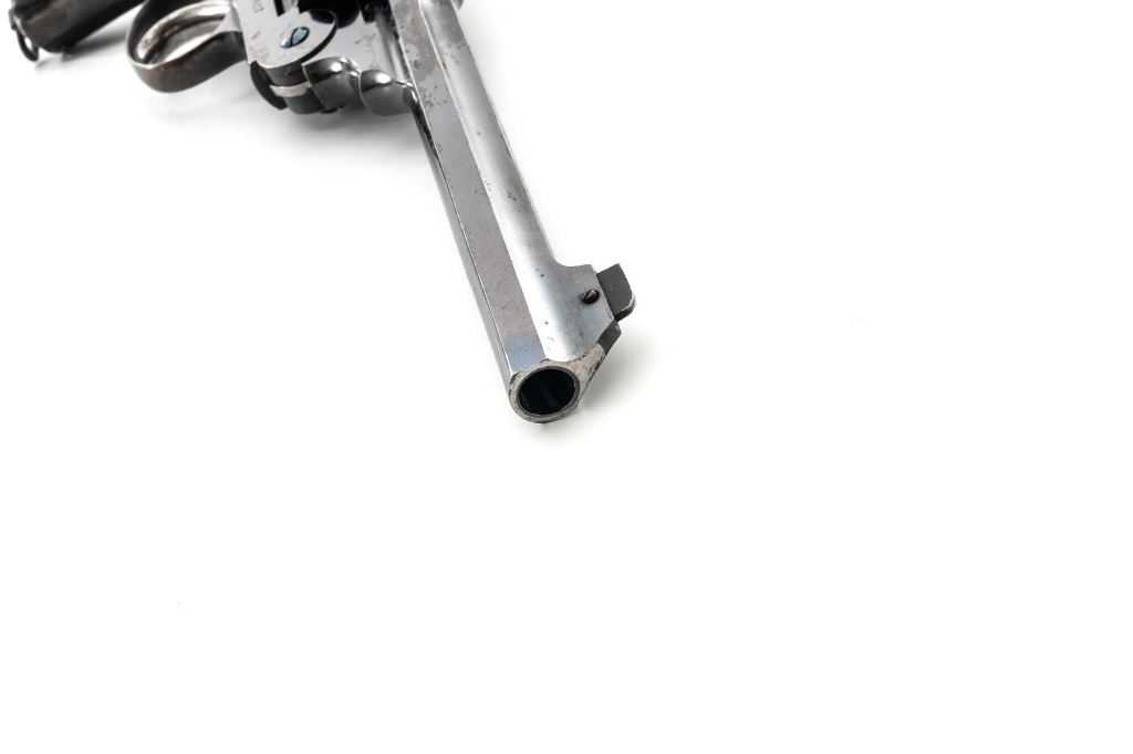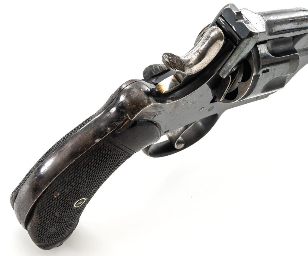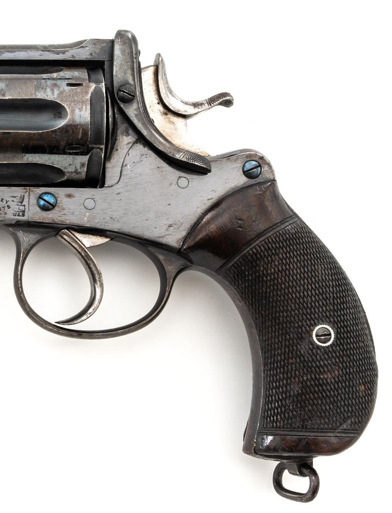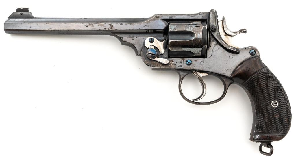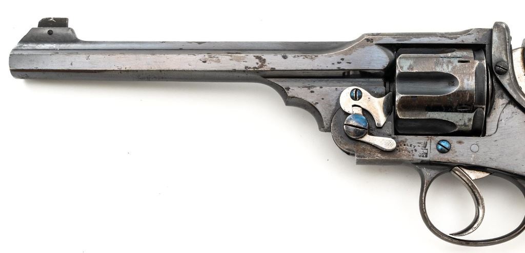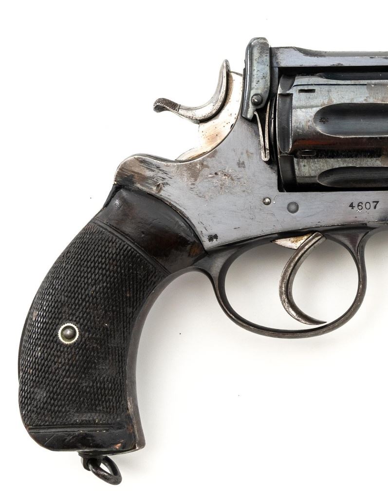 Webley WG Army Double Action Revolver, #4607, .45 ACP cal., 7.5" flat sided barrel, blued finish with bright hammer, trigger, and cam mechanism; checkered walnut grips, pinned blade front sight, fixed rear sight with "U"-notched groove, with swiveling lanyard loop. Left side of the frame marked "WEBLEY PATENTS" with a "(Winged Bullet)/W&S" trademark logo. Left side of the barrel is stamped with a crowned "BV" view stamp. No other markings except serial number. Barrel is numbered but does not match. Revolver was importer converted to .45 ACP cal. by machining off the rear of the cylinder. Condition overall is very good, retaining approx. 70% blue, showing general flaking, and patina. Grips appear to be period replacements and have been reshaped along the lower outside edge, now with general handling marks and flattening to the checkering detail. Action locks up, cycles, and extracts smoothly. Bore and chambers have some scattered spots of patina, rifling is good. Est.: $800-$1,100. (C&R)