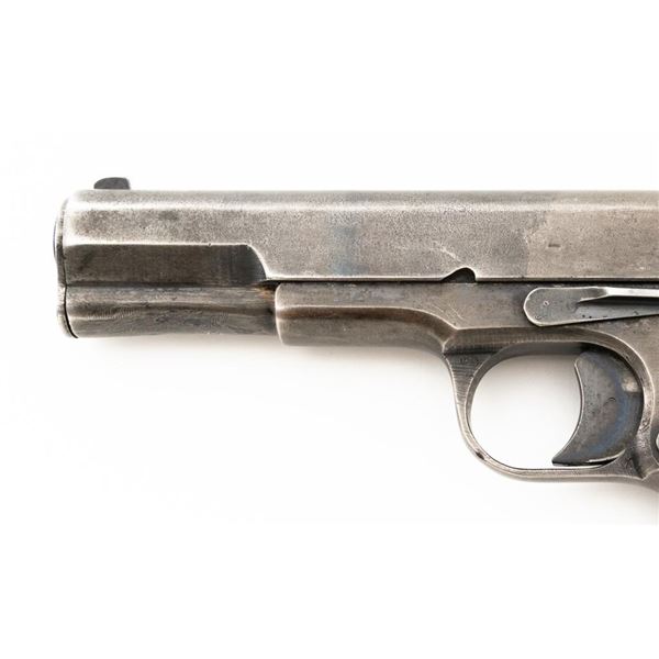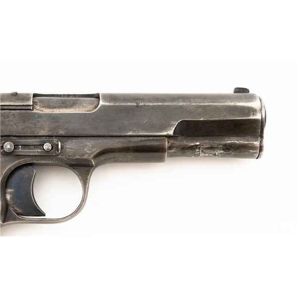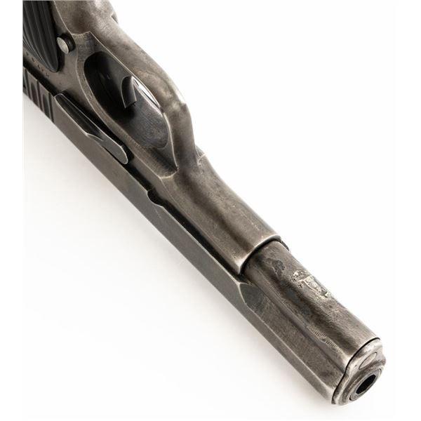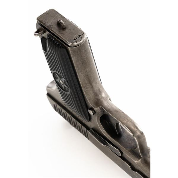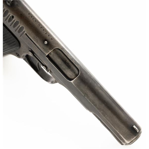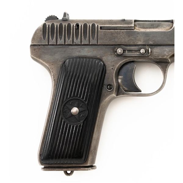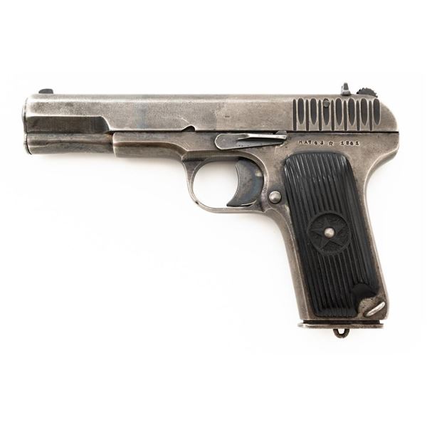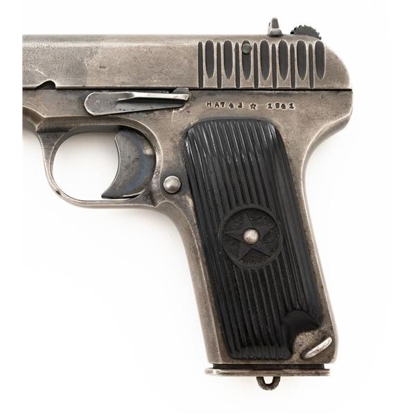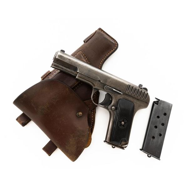 Soviet TT-33 Tokarev Semi-Automatic Pistol with Two (2) Magazines & Holster, #HA743, 7.62x25mm cal., 4.6" barrel, blued finish, grooved black plastic grips embossed with five pointed stars surrounded by "CCCP" on each side, blade front sight, fixed rear sight with "U"-notched groove, and lanyard loop. Magazine #1 has a gray phosphate finish and is stamped with a matching number "HA743", in fair condition showing with wear and patina. Magazine #2 has a blued finish and is stamped with a mismatched number "2689", in very good condition, with toning to the finish. Both magazines have lanyard loops on their base plates. Brown leather Soviet holster is unmarked under the flap. Condition is fair with cuts to the leather, showing general age and wear, all stitching and fittings are intact. Pistol is marked "HA743(five pointed star)1941" on left side of the frame and on top of the slide. No visible import marks. Condition overall is fair, retaining approx. 30% thinning and toning blue, now with a mottled appearance, showing general light pitting. There is a damaged area to the bottom right side of the slide, that has been repaired by welding and filing. Grips are good, showing wear and handling marks. Slide opens smoothly but returns slowly into battery, slide stop will not lock into place and hold open. Bore rates fair with darkening in the grooves, rifling is visible. Est.:$500-$700. (C&R)