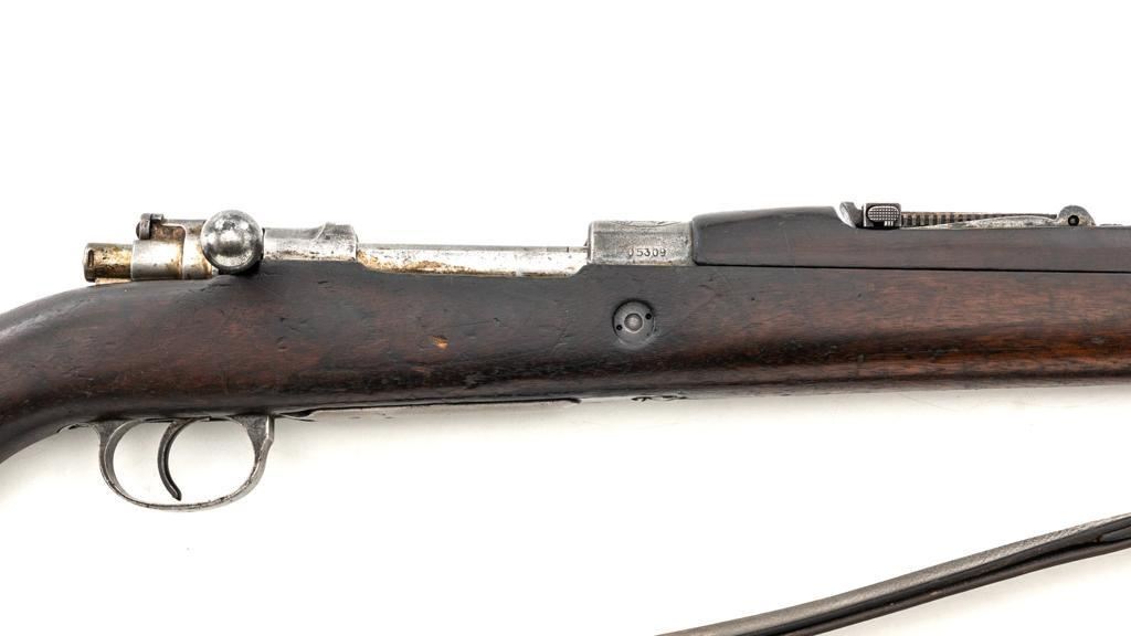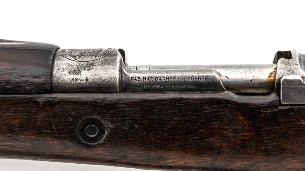 FN Columbian Model 1930 (Model 1950) Mauser Bolt Action Short Rifle, #05309, .30-06 cal., 23.5" barrel, blued finish, hardwood stock and handguard, dovetailed inverted-"V" front sight, and adjustable tangent rear sight with "V"-notched groove, graduated to 2000 meters. Includes a brown leather sling, in good used condition. No cleaning rod. Rifle was arsenal converted to .30-06 cal. and is marked ".30" on the rear receiver bridge. Front of the receiver has been relieved to accommodate the longer .30-06 cartridge. Top of the receiver ring is marked with the Columbian crest surrounded by "COLOMBIA FUERZAS MILITARES" and the left side receiver rail is marked "FAB.NAT.DARMES de GUERRE/HERSTAL-BELGIQUE". Matching numbered bolt. There is no number stamped on the stock as it is probably a contemporary replacement. No visible import marks. Condition overall is good, almost all of the bluing has worn or been cleaned from the metal, and most parts show toning, and patina. There are dents to the toe of the buttplate. Wood is good with general marks to the dark finish. Action operates smoothly. Bore is bright with very good rifling. Est.: $300-$500. (C&R)
