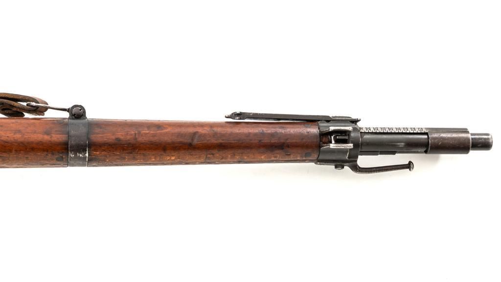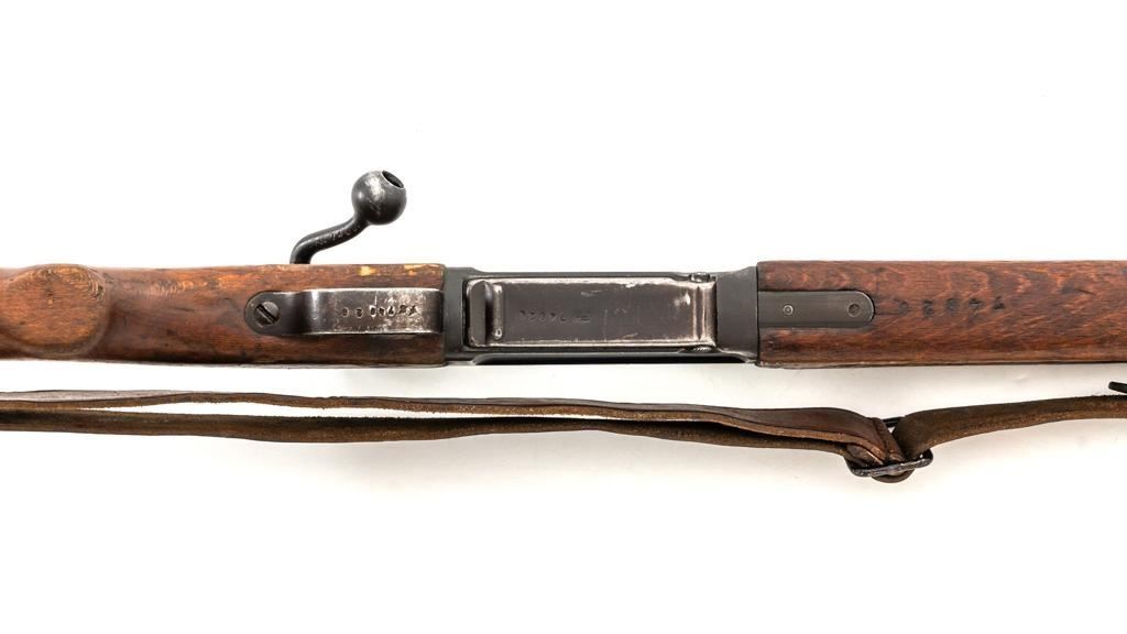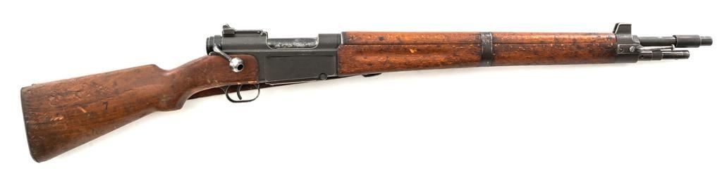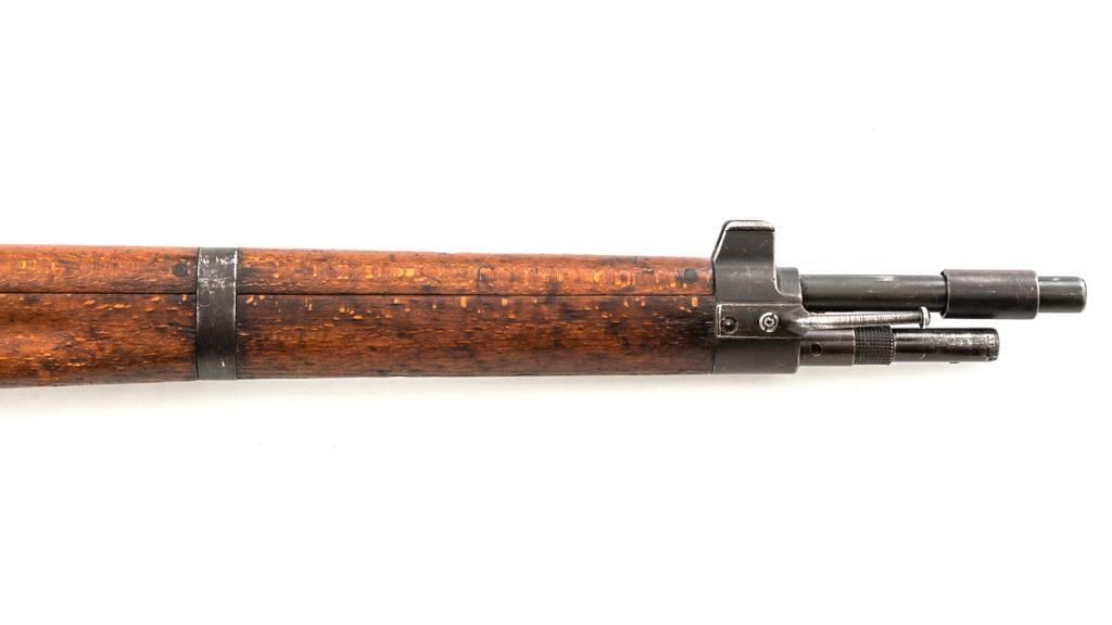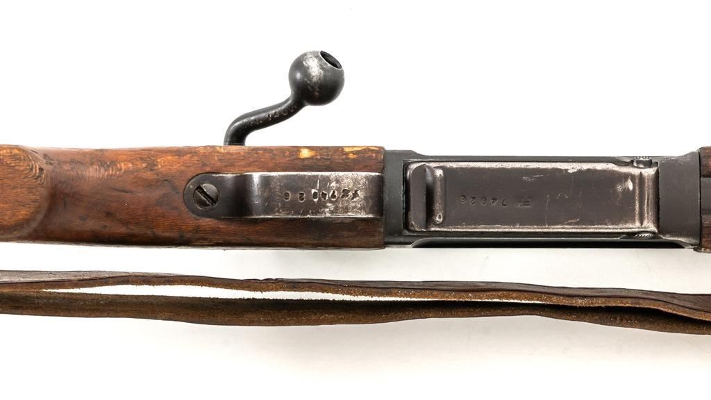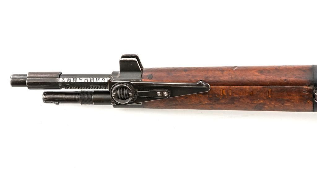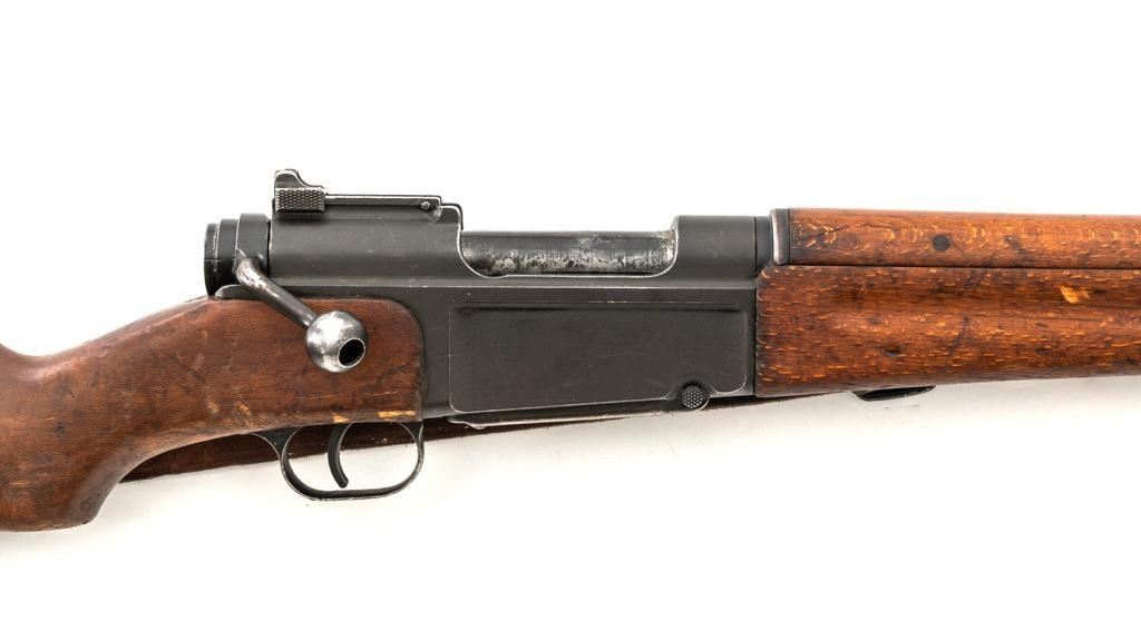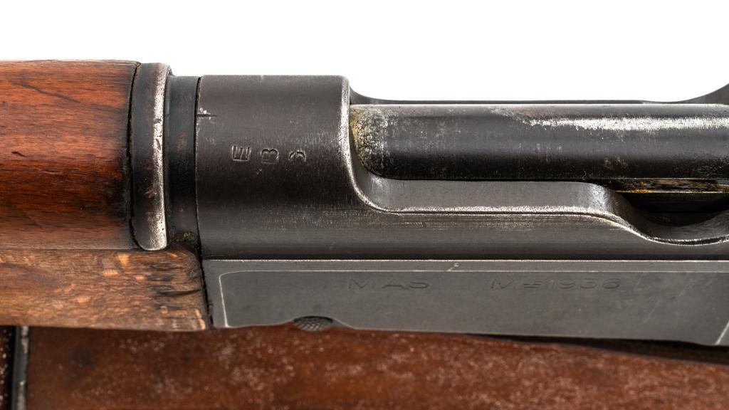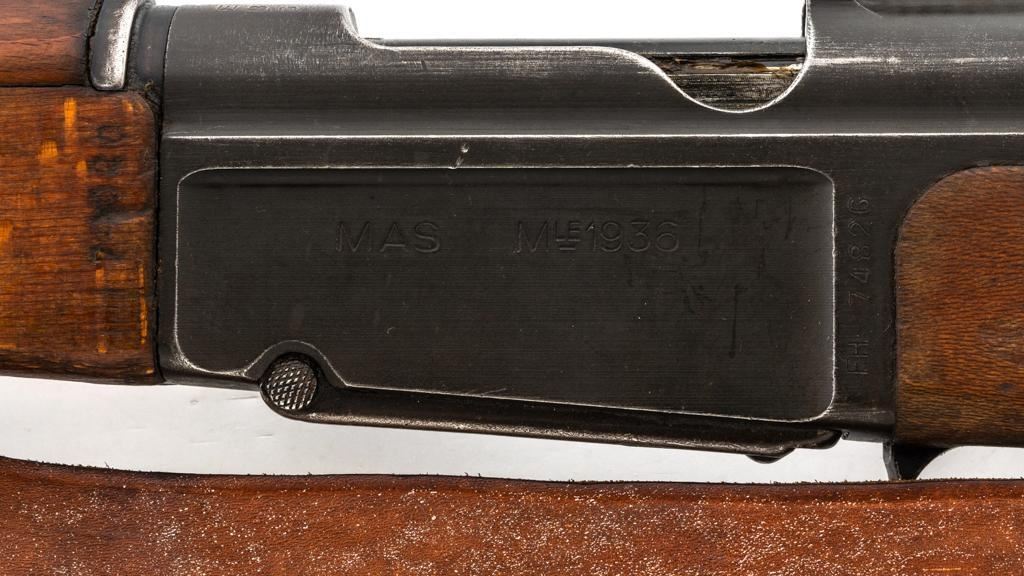 Rare French MAS 36 LG48 Bolt Action Rifle with Bayonet, #FH74826, 7.5x54mm cal., 23" barrel, parkerized finish, hardwood stock and hand guard, inverted-"V" front sight with protectors, and adjustable aperture on ramp rear sight, graduated to 1200 meters. Original bayonet is in very good condition and locks into place smoothly. Includes a brown leather French sling, in good used condition. Left side of the receiver is marked "MAS MLE 1936" and stamped "EBG" on left side of the receiver ring. "7" is marked on right side of the buttstock. Matching numbers. No visible import marks. Rifle was French arsenal converted into its present configuration by fitting an adjustable sleeve over the barrel, attaching a launcher sight, and new nose cap assembly. Condition overall is very good, retaining approx. 80%-85% toning parkerized finish, showing some edgewear, handling marks to the trigger guard and magazine, and patina to the buttplate. Wood is about good, with bruises and handling marks, especially to right side of the buttstock. Action operates smoothly. Bore is heavily greased but appears to be in at least very good condition. Est.: $600-$900. (C&R)