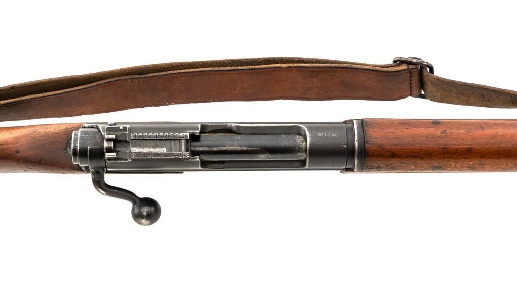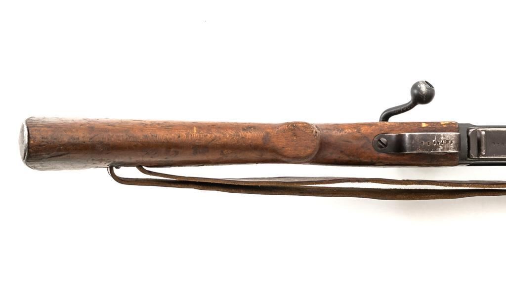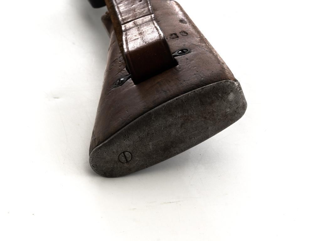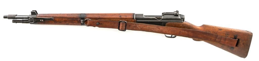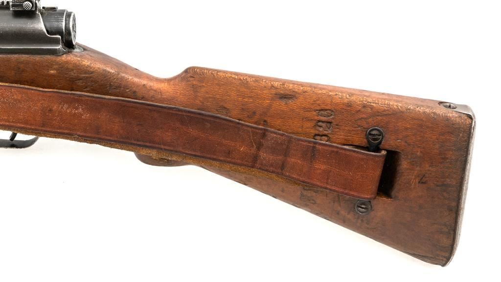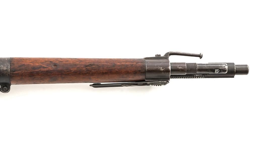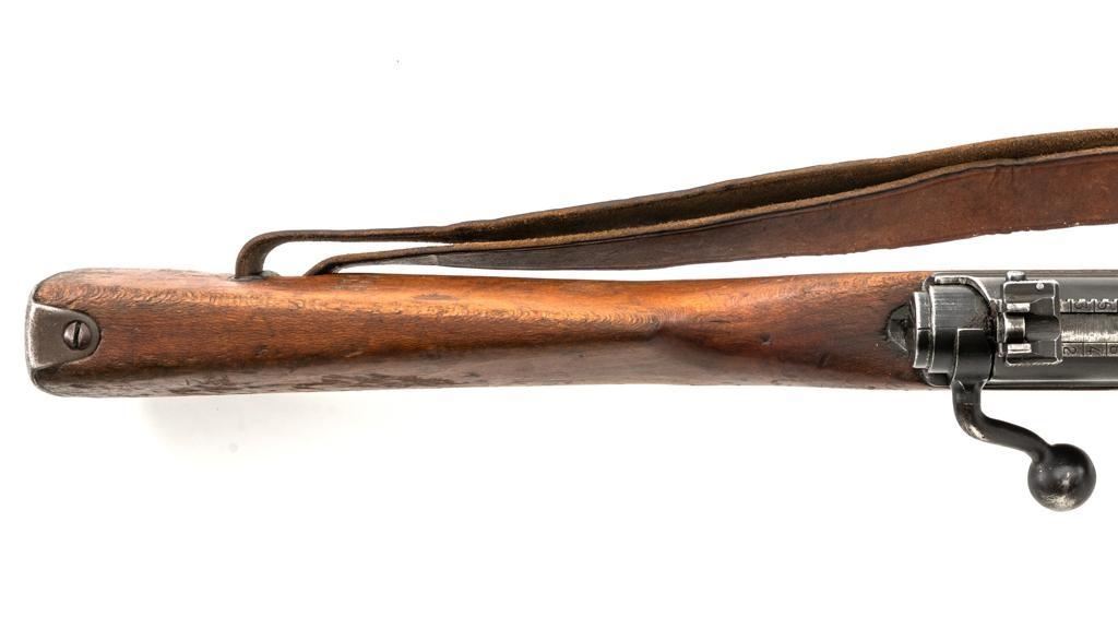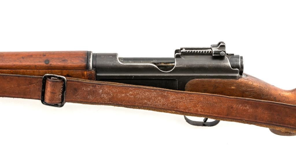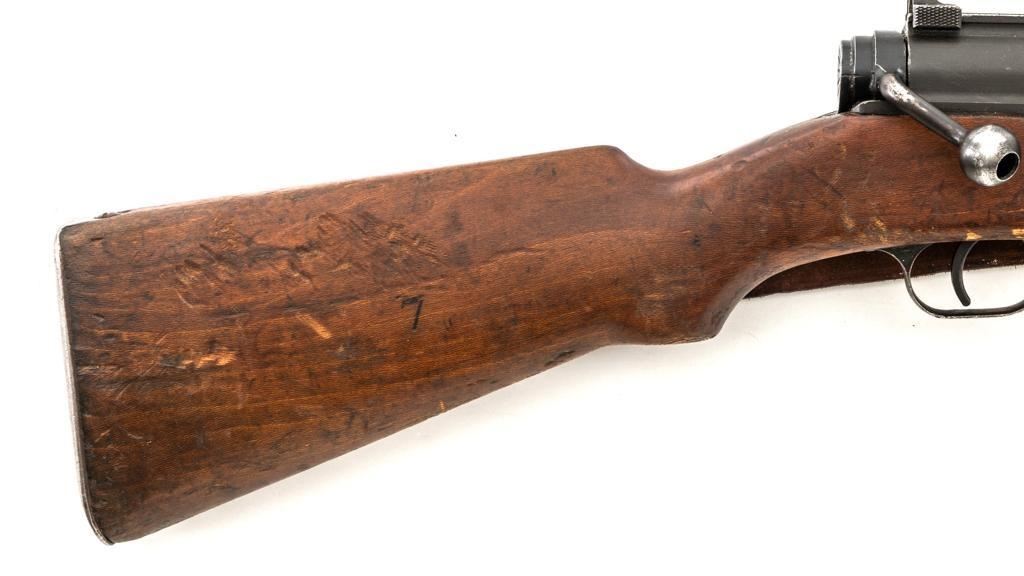 Rare French MAS 36 LG48 Bolt Action Rifle with Bayonet, #FH74826, 7.5x54mm cal., 23" barrel, parkerized finish, hardwood stock and hand guard, inverted-"V" front sight with protectors, and adjustable aperture on ramp rear sight, graduated to 1200 meters. Original bayonet is in very good condition and locks into place smoothly. Includes a brown leather French sling, in good used condition. Left side of the receiver is marked "MAS MLE 1936" and stamped "EBG" on left side of the receiver ring. "7" is marked on right side of the buttstock. Matching numbers. No visible import marks. Rifle was French arsenal converted into its present configuration by fitting an adjustable sleeve over the barrel, attaching a launcher sight, and new nose cap assembly. Condition overall is very good, retaining approx. 80%-85% toning parkerized finish, showing some edgewear, handling marks to the trigger guard and magazine, and patina to the buttplate. Wood is about good, with bruises and handling marks, especially to right side of the buttstock. Action operates smoothly. Bore is heavily greased but appears to be in at least very good condition. Est.: $600-$900. (C&R)