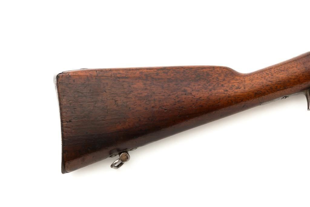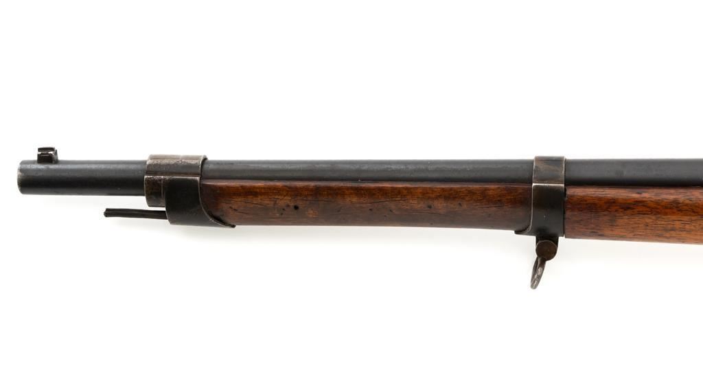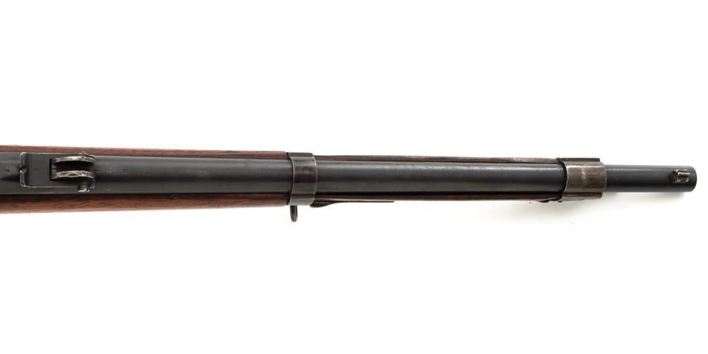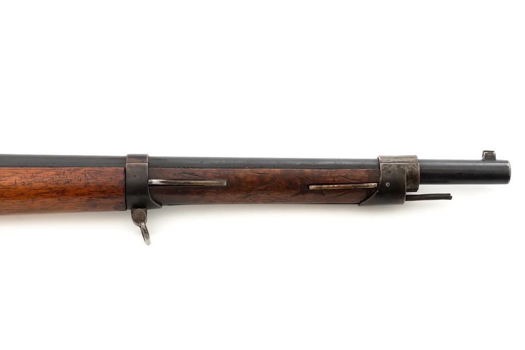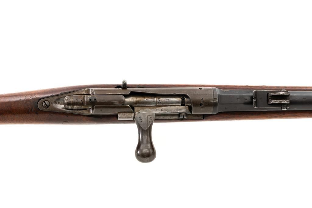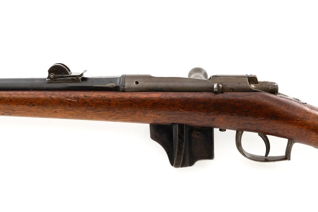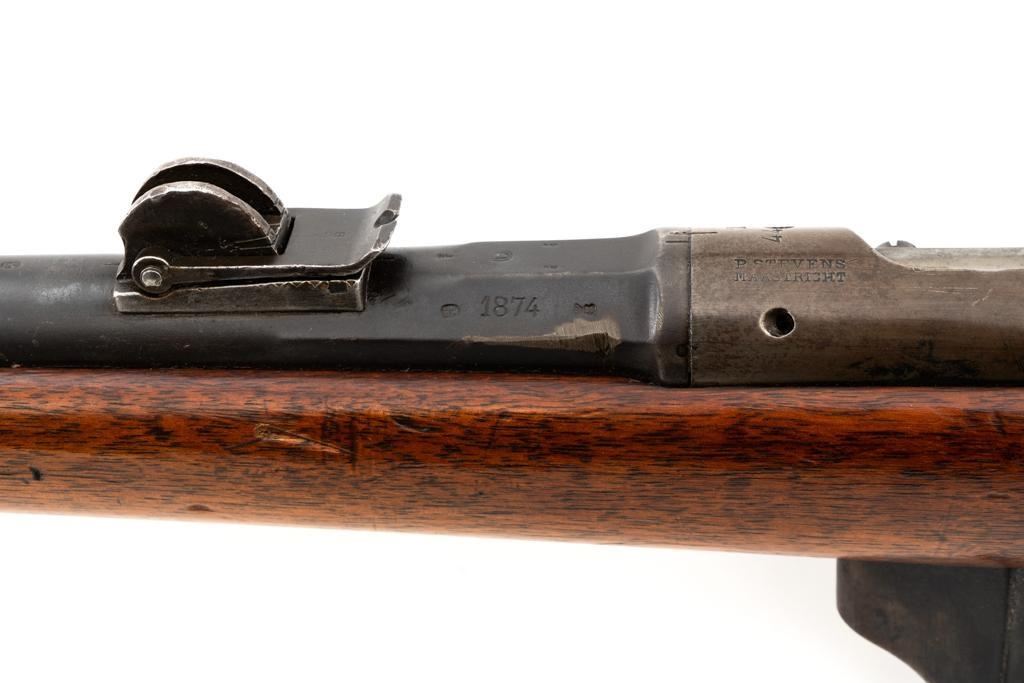 Antique Shortened Dutch M1871/88 Beaumont-Vitali Bolt Action Rifle, #NVSN, 11x52Rmm cal., 20.5" barrel, blued finish, hardwood stock, dovetailed blade front sight, and adjustable rear sight with "V"-notched groove, graduated to 700 meters. Tip of the steel cleaning rod is broken off. Left side of the receiver is marked "P.STEVENS/MAASTRICHT", with inspection marks and dated "1874" on the barrel shank. There are no markings on the buttstock. Matching part numbers (Z442) on the receiver and bolt assembly. Condition overall is good. Metal shows general thinning and brown toning. Except the barrel, which retains much of the blued finish. Wood is good, showing applied varnish, handling marks, and scratches. Action operates smoothly. There is an area of fouling at the chamber that may clean better, otherwise the bore rates good with defined rifling. Rifle was possibly shortened by the Dutch military for use in the East Indies. Est.: $300-$500. (Antique)
