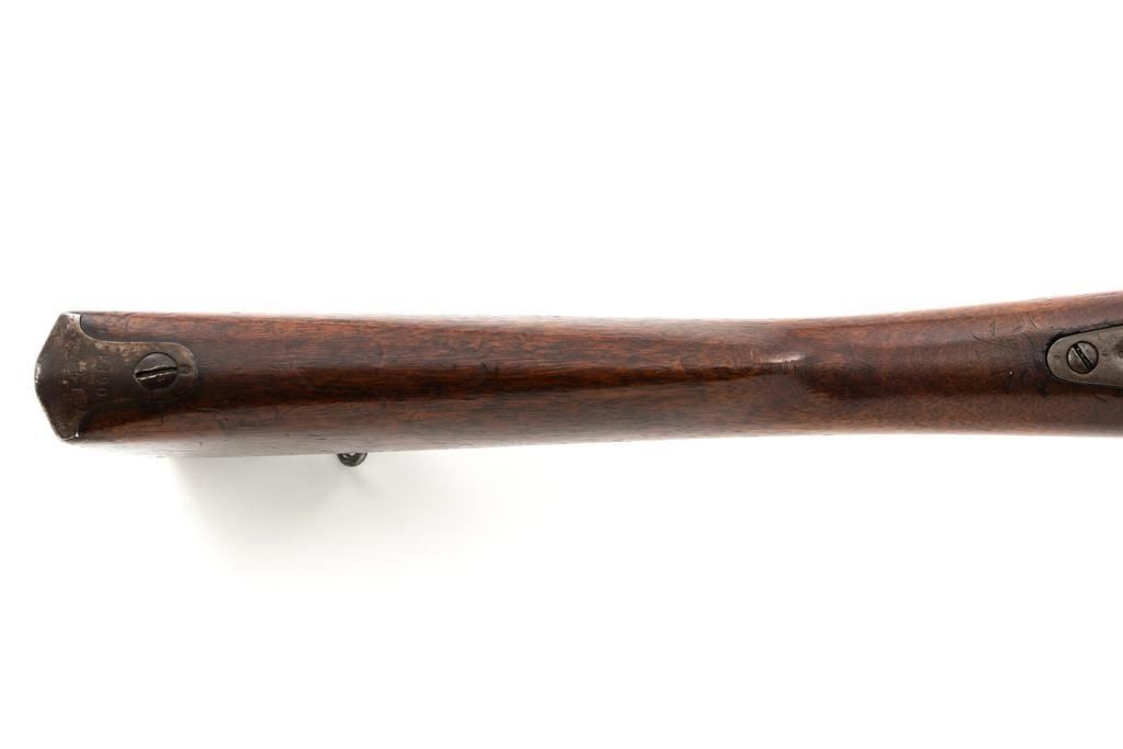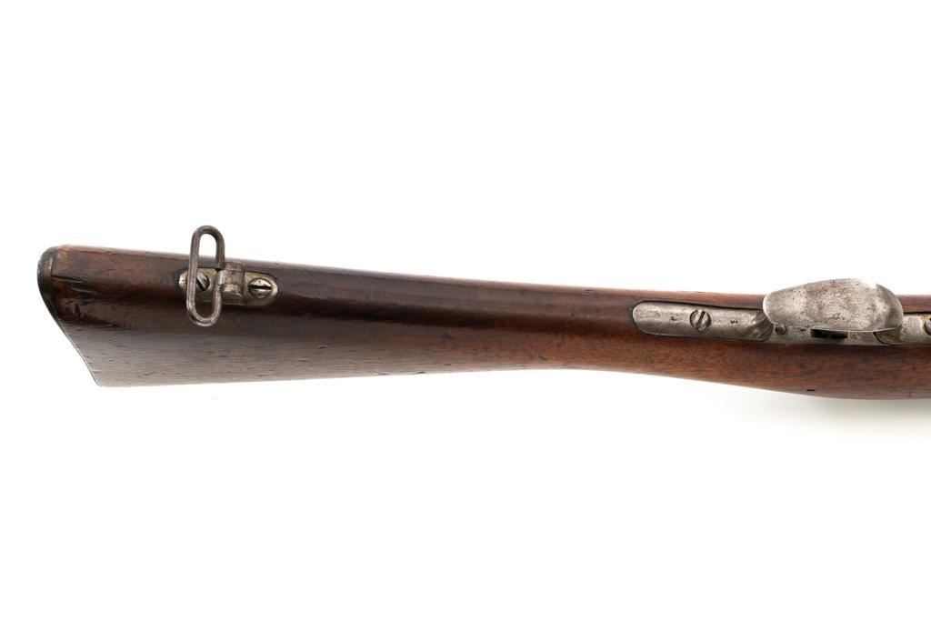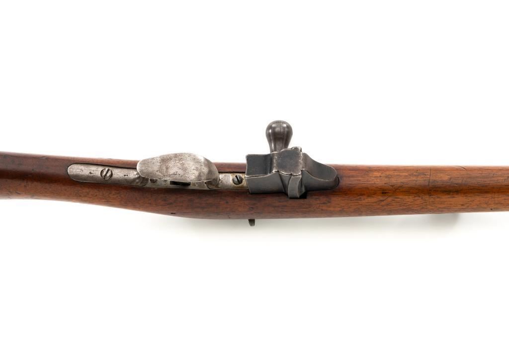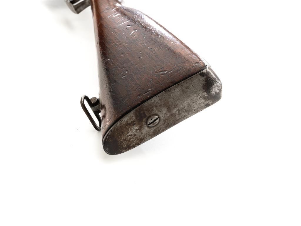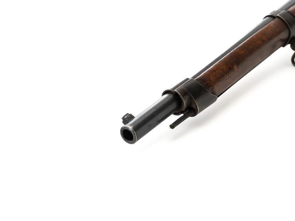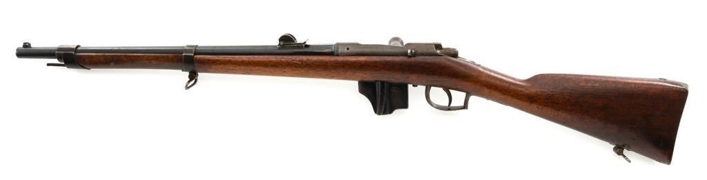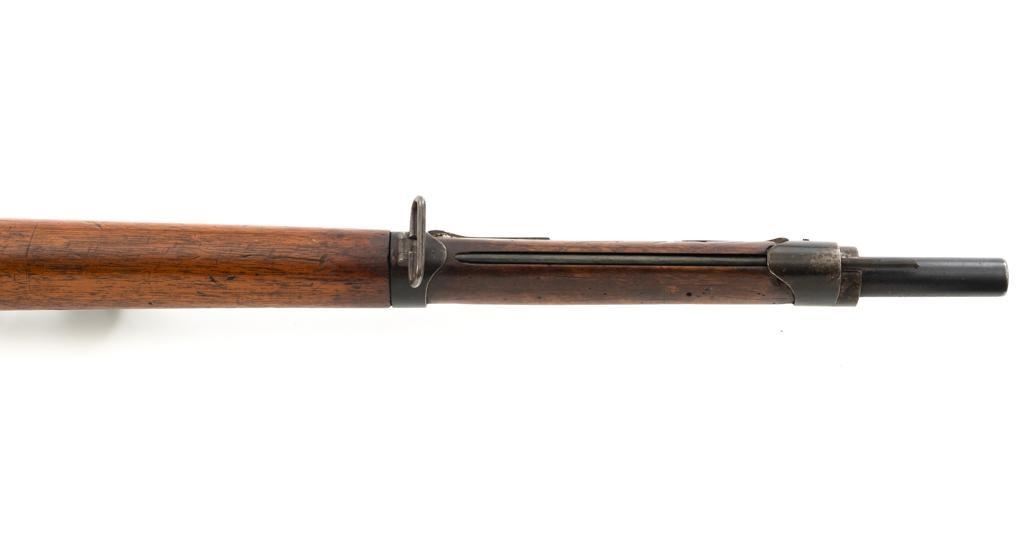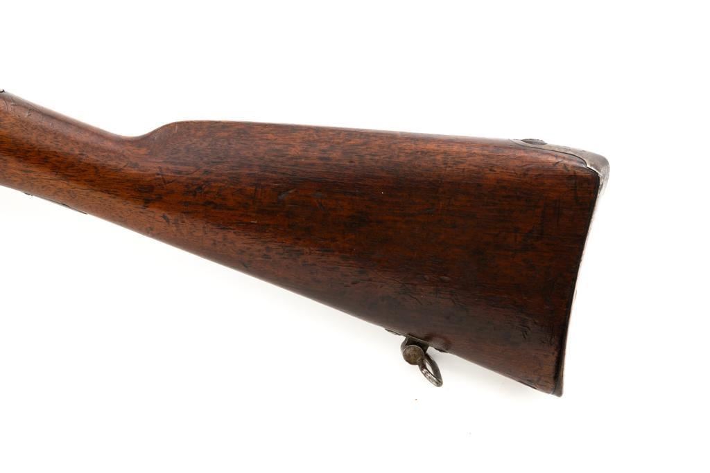 Antique Shortened Dutch M1871/88 Beaumont-Vitali Bolt Action Rifle, #NVSN, 11x52Rmm cal., 20.5" barrel, blued finish, hardwood stock, dovetailed blade front sight, and adjustable rear sight with "V"-notched groove, graduated to 700 meters. Tip of the steel cleaning rod is broken off. Left side of the receiver is marked "P.STEVENS/MAASTRICHT", with inspection marks and dated "1874" on the barrel shank. There are no markings on the buttstock. Matching part numbers (Z442) on the receiver and bolt assembly. Condition overall is good. Metal shows general thinning and brown toning. Except the barrel, which retains much of the blued finish. Wood is good, showing applied varnish, handling marks, and scratches. Action operates smoothly. There is an area of fouling at the chamber that may clean better, otherwise the bore rates good with defined rifling. Rifle was possibly shortened by the Dutch military for use in the East Indies. Est.: $300-$500. (Antique)