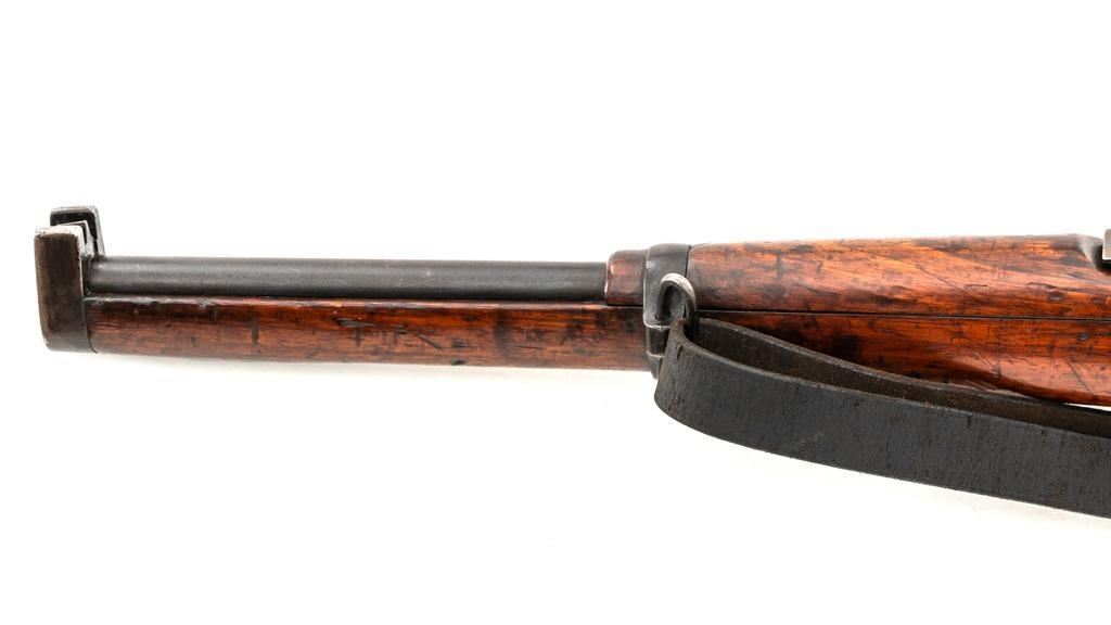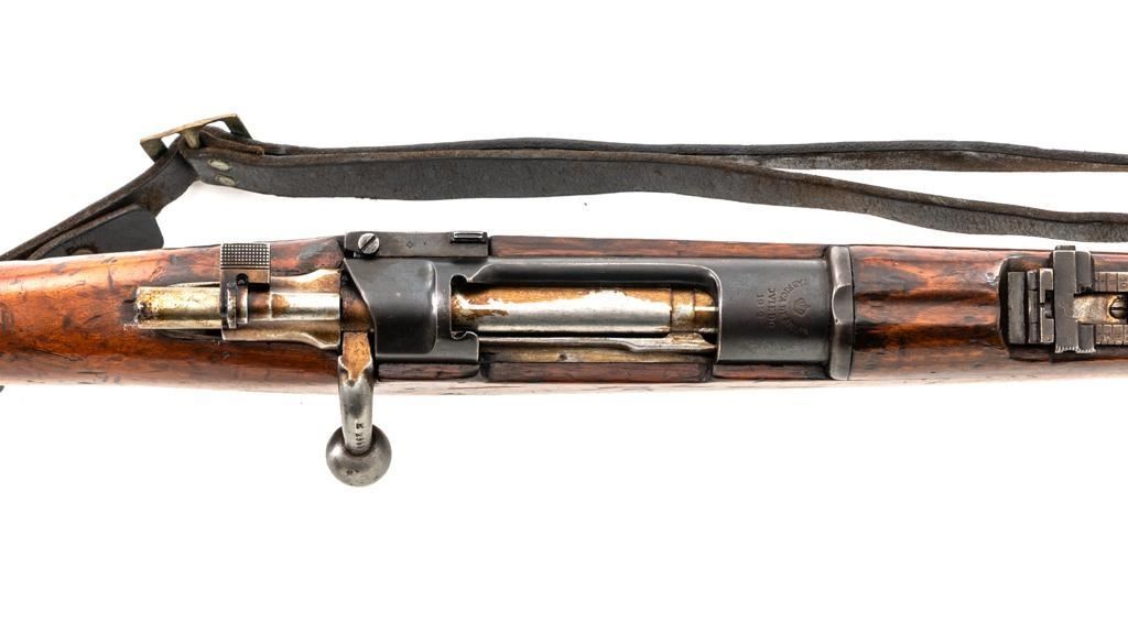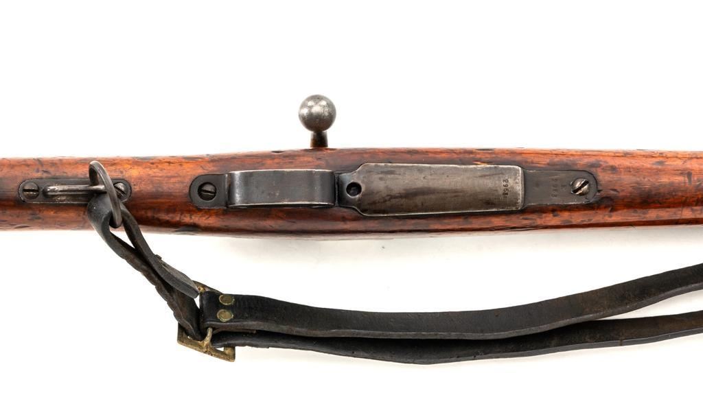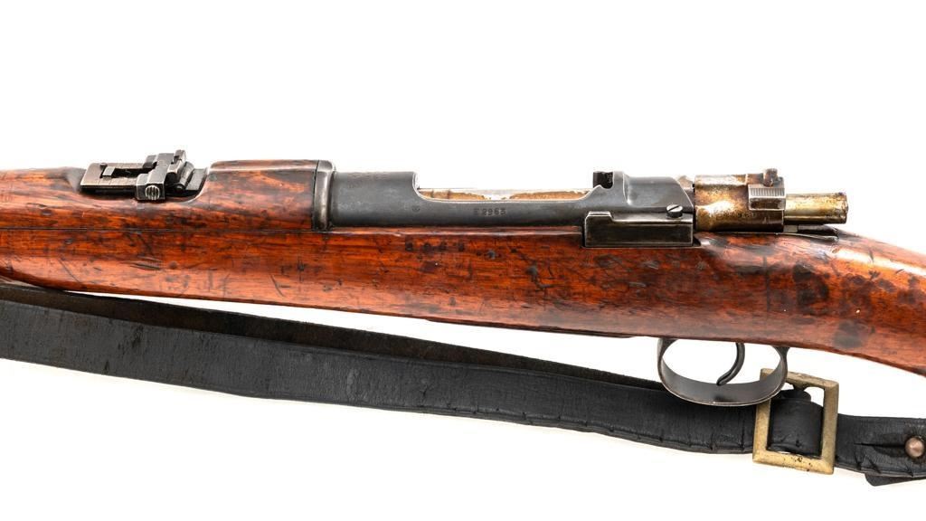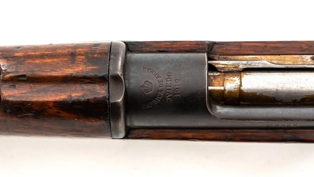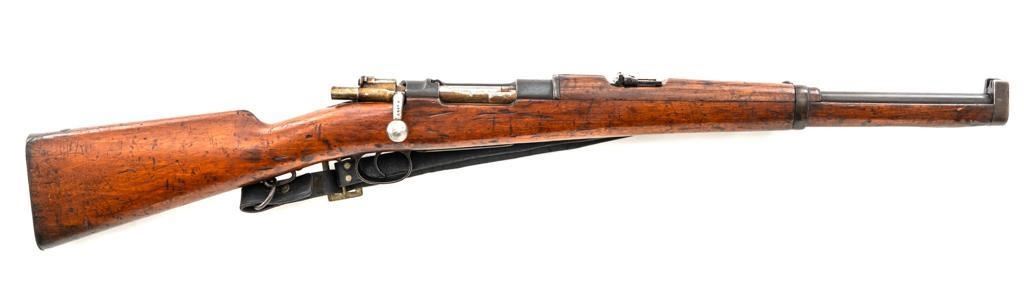 Spanish Model 1895 Mauser Bolt Action Carbine, #E2963, 7x57mm cal., 17.75" barrel, blued finish, hardwood stock and handguard, inverted-"V" front sight with protectors, and adjustable folding leaf rear sight with "V"-notched groove, graduated to 1400 meters. Includes a black leather sling, in fair used condition. Top of the receiver ring is marked "(Spanish crown)FABRICA DE ARMAS/OVIEDO/1912". Matching numbers on the trigger guard, magazine floorplate, and rear sight. Bolt does not match. No visible import marks. Condition overall is good, retaining approx. 70% blue, balance shows dark toning. Bolt assembly has toned to gray. Wood is good with bruises and handling marks, especially to left side of the wrist and right side of the forend. Action operates smoothly. Bore rates fair with visible rifling. Est.: $500-$700. (C&R)