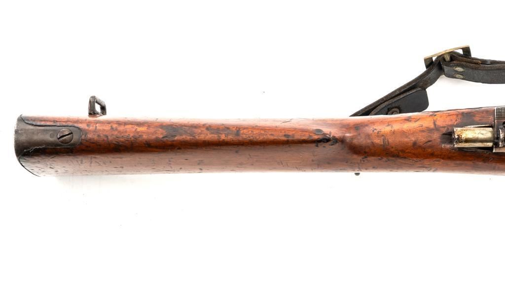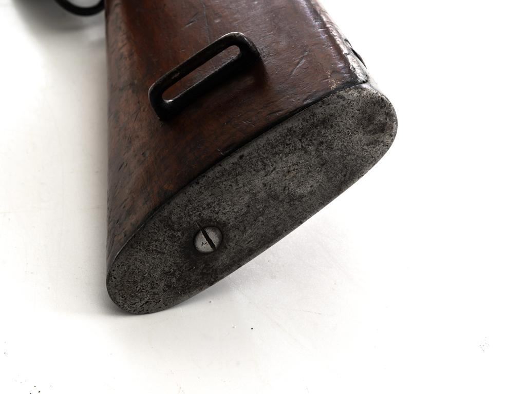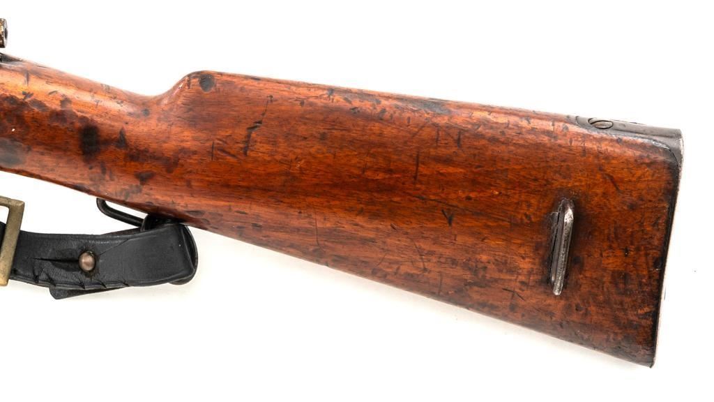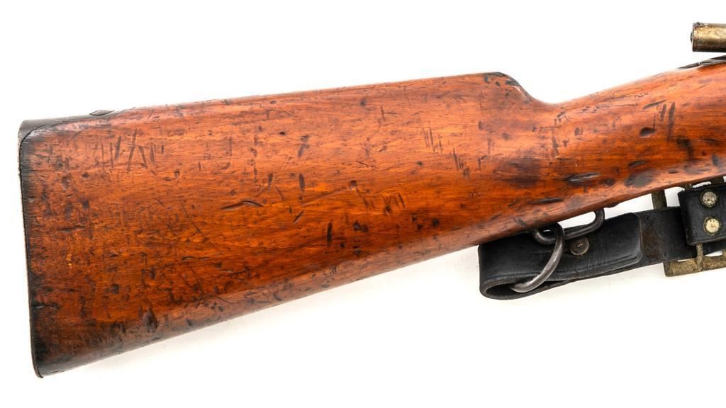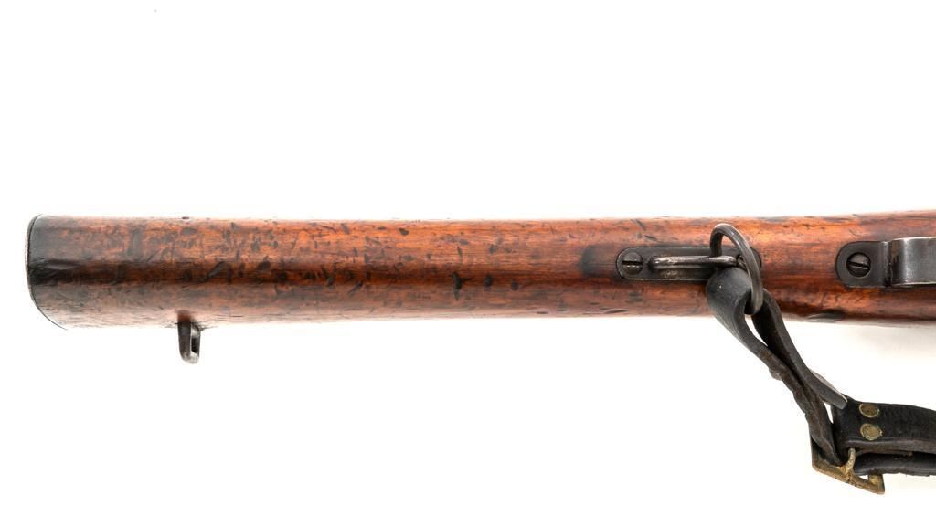 Spanish Model 1895 Mauser Bolt Action Carbine, #E2963, 7x57mm cal., 17.75" barrel, blued finish, hardwood stock and handguard, inverted-"V" front sight with protectors, and adjustable folding leaf rear sight with "V"-notched groove, graduated to 1400 meters. Includes a black leather sling, in fair used condition. Top of the receiver ring is marked "(Spanish crown)FABRICA DE ARMAS/OVIEDO/1912". Matching numbers on the trigger guard, magazine floorplate, and rear sight. Bolt does not match. No visible import marks. Condition overall is good, retaining approx. 70% blue, balance shows dark toning. Bolt assembly has toned to gray. Wood is good with bruises and handling marks, especially to left side of the wrist and right side of the forend. Action operates smoothly. Bore rates fair with visible rifling. Est.: $500-$700. (C&R)