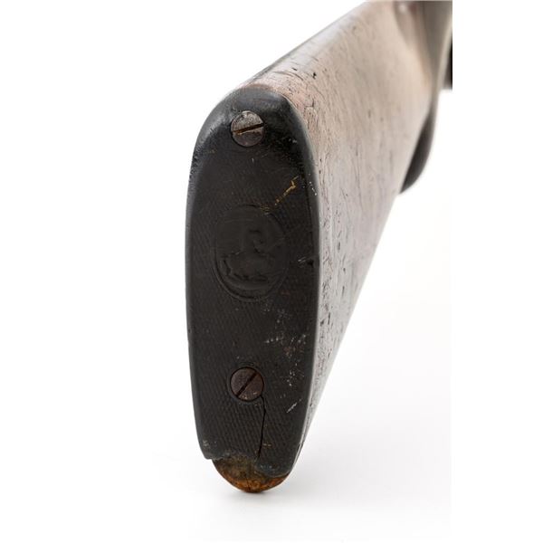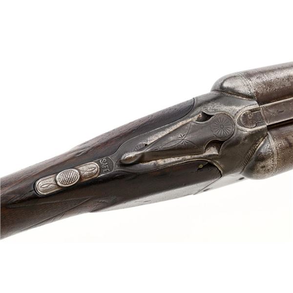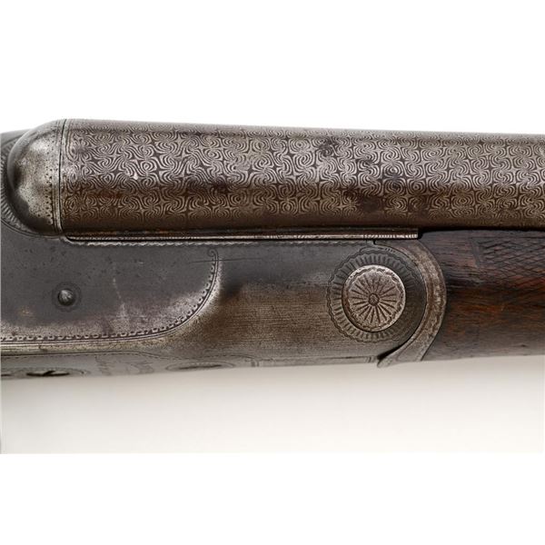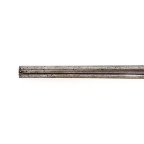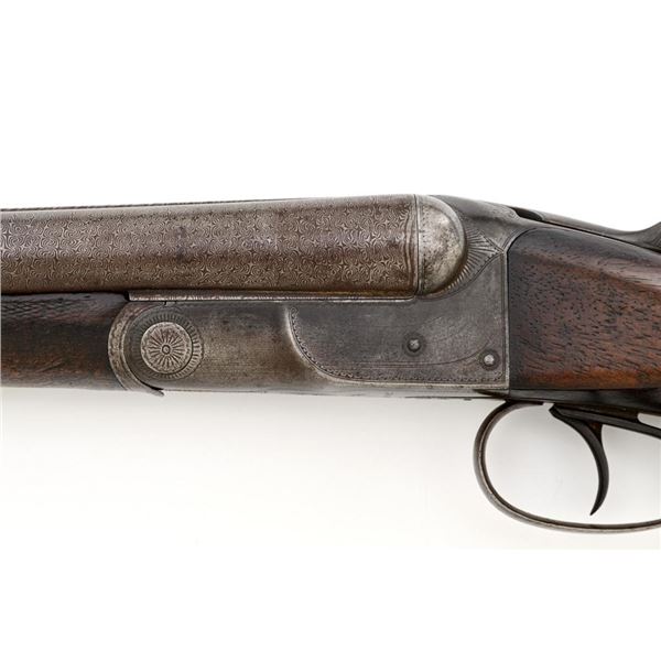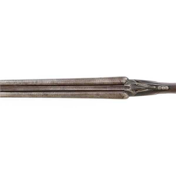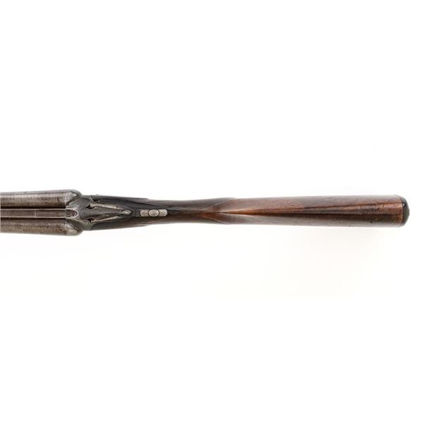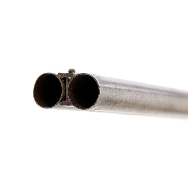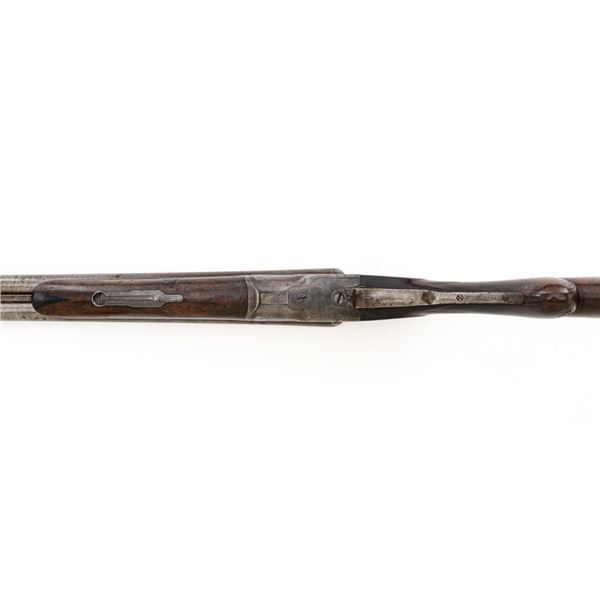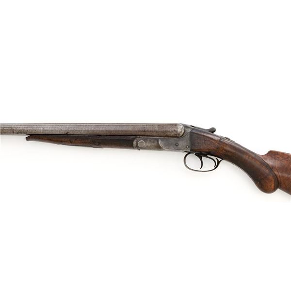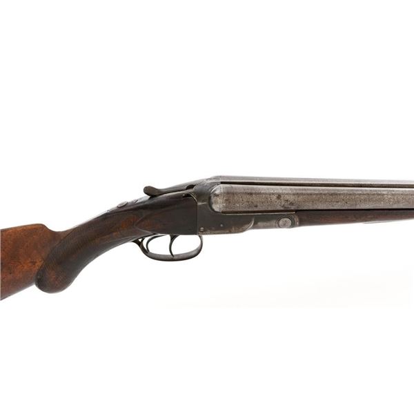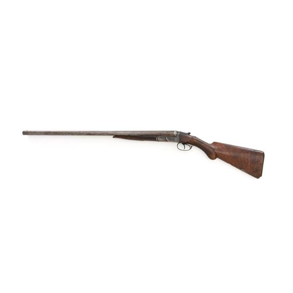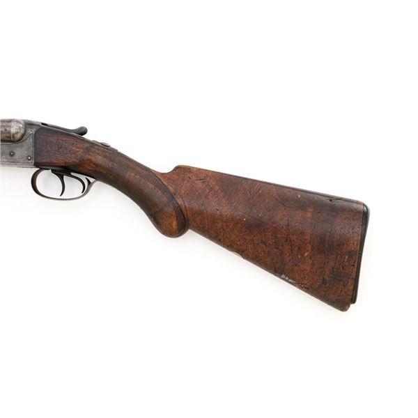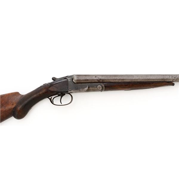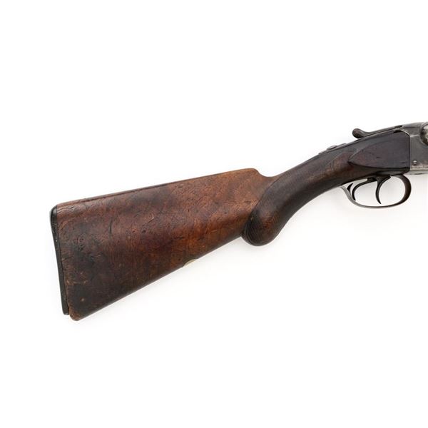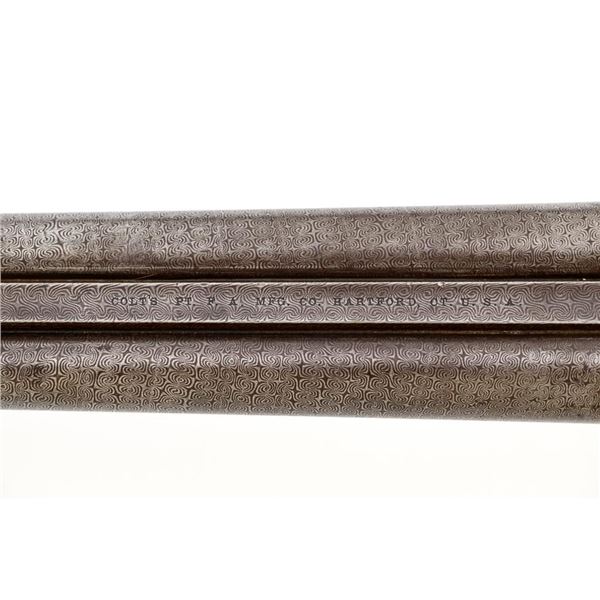 Antique Colt Model 1883 Hammerless Side-by-Side Shotgun, #2498, 12 ga., 27-1/8" solid rib Damascus barrels have double underlug plus a dolls head extension for lockup, and feature 2-3/4" chambers, with Mod and Cyl chokes. Boxlock action features double triggers and the receiver has minimal engraving. Splinter forend and round knob pistol grip buttstock are "B" grade American walnut, with very worn checkering and an original Rampant Colt buttplate. Stock dimensions are 14" x 2" x 3-3/4". Mfgd 1887. Condition is good but very well used. Gun shows extensive field use, with resultant marks to the wood and wear to checkering. Action still locks tight however, and boxlock seems to function correctly. Breechface closes tight and the bores are bright but show evidence of past pitting. This gun is a survivor. Est.: $750-$1,000. (Antique)