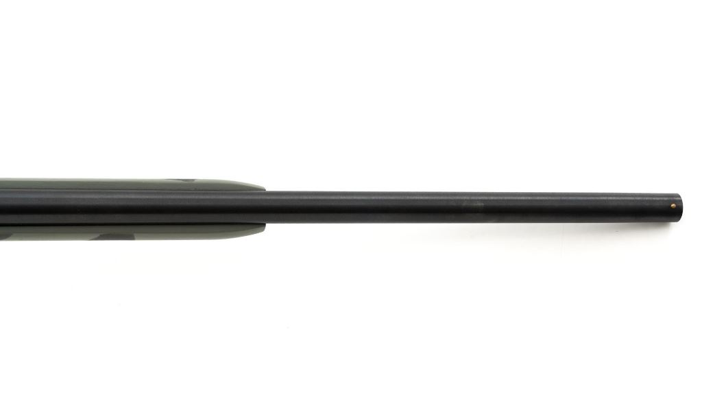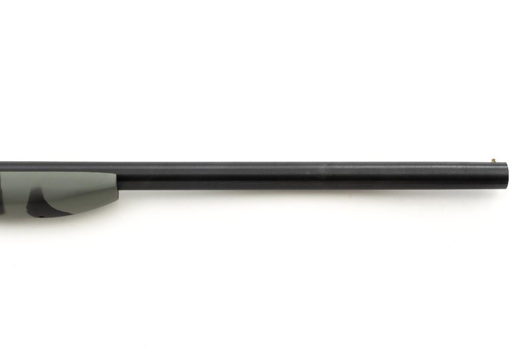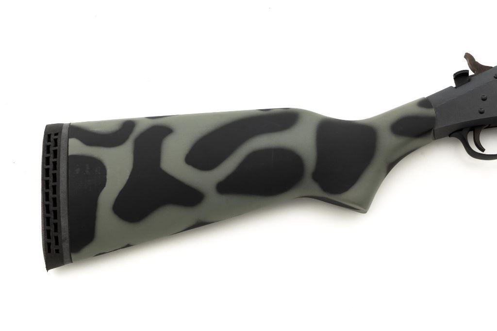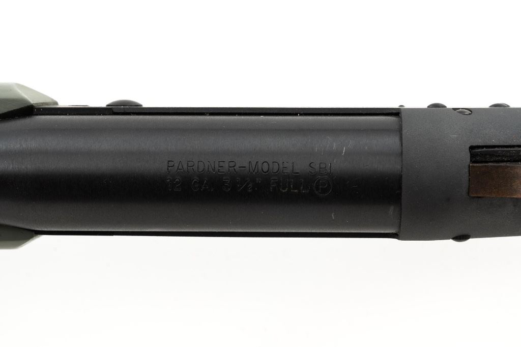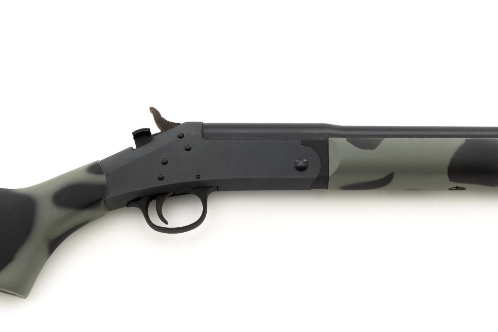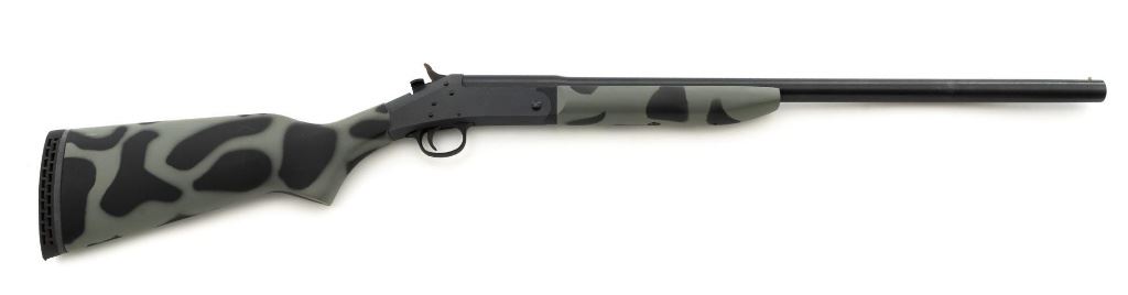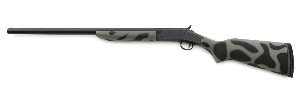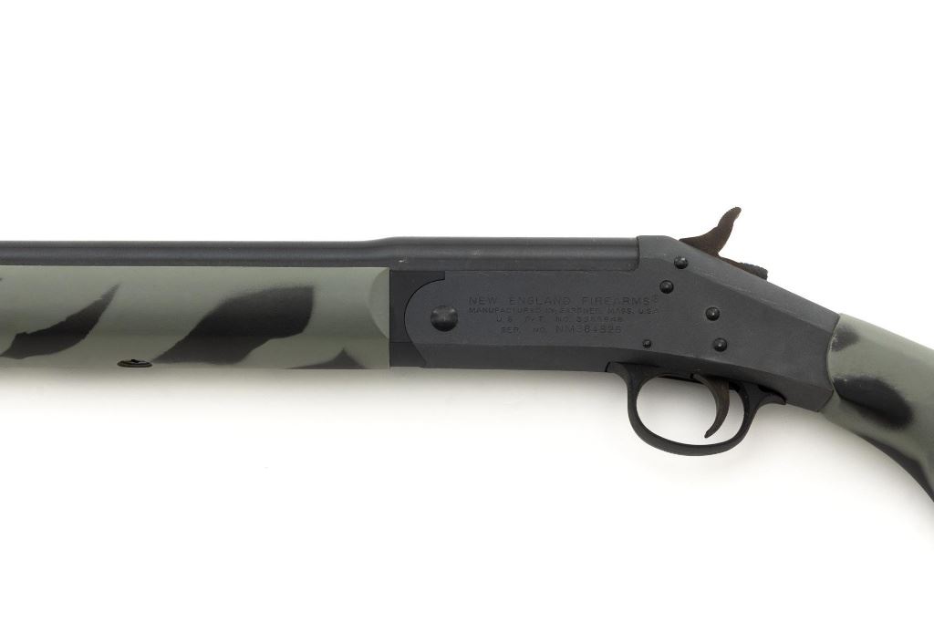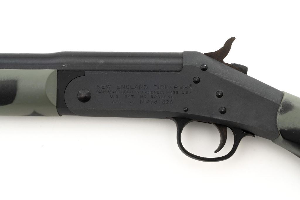 New England Firearms Pardner Model SB1 Single Shot Shotgun, #NM384826, 12 ga., 24" barrel with a 3.5" chamber and Full choke, blue and matte black finish, smooth camo synthetic pistol grip stock with a semi-beavertail forend, brass bead front sight, exposed hammer, extractor, and plastic trigger guard. Buttstock ends with a ventilated rubber recoil pad, providing a 14.25" LOP. Shotgun is in excellent overall condition, retaining approx. 98%-99% factory finish on the barrel with minor handling marks. Stock is in excellent condition with only small handling marks. Action functions well and locks up securely. Bore is excellent. Est.: $150-$300. (Modern)