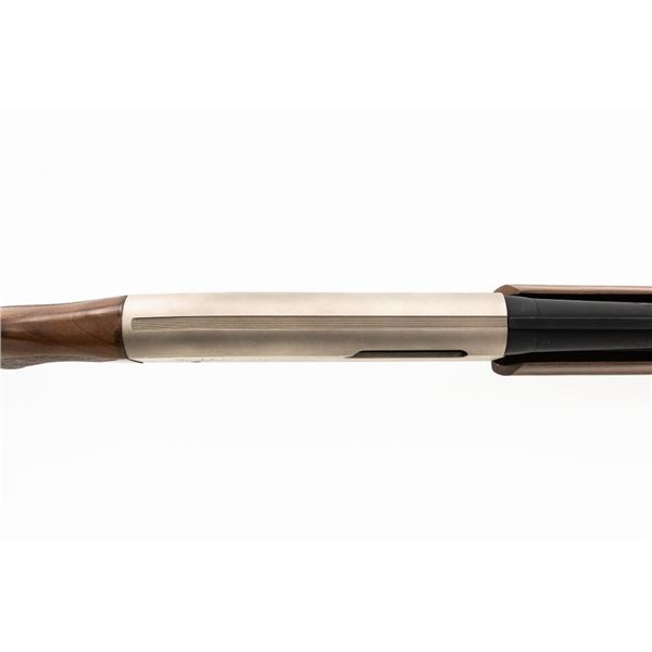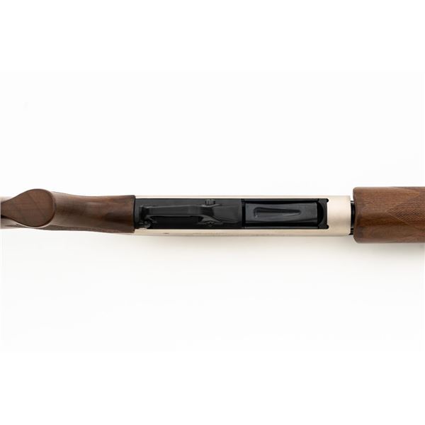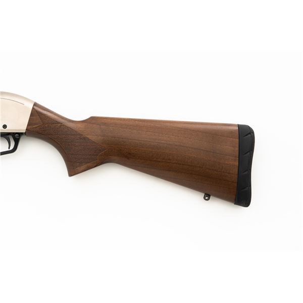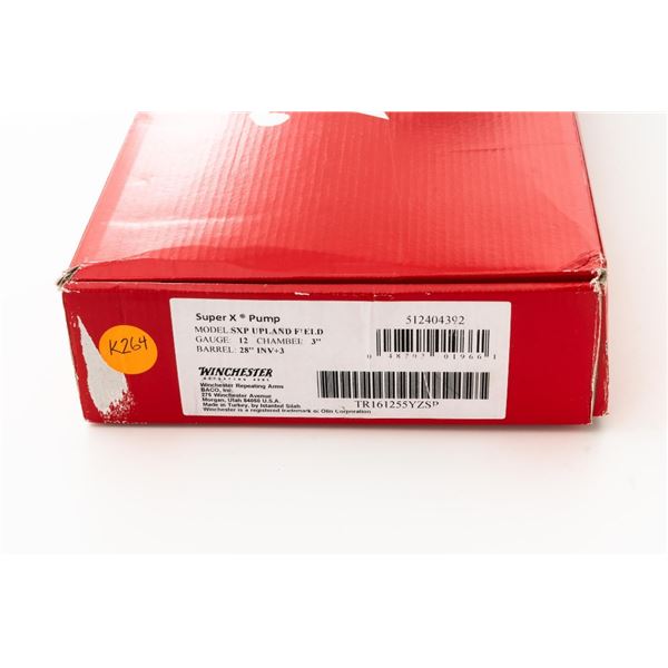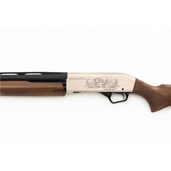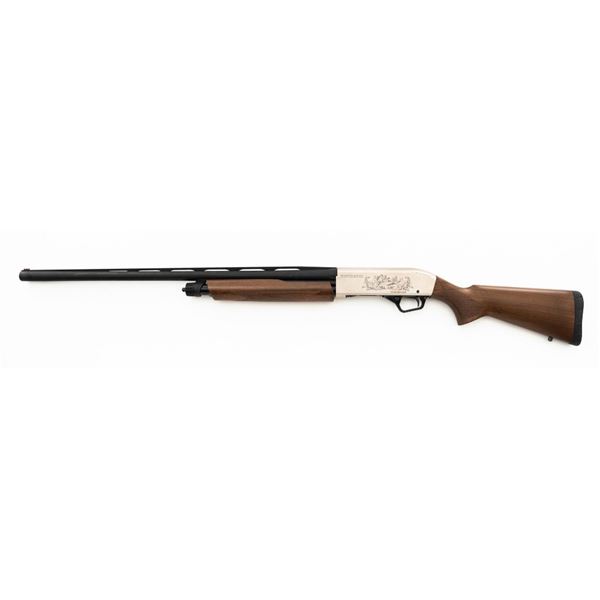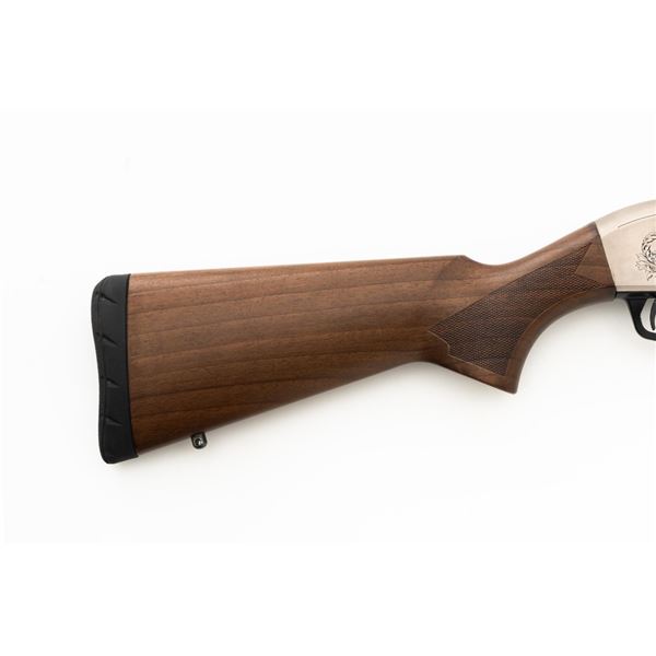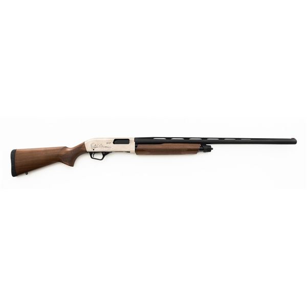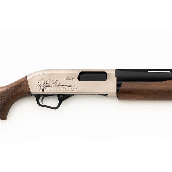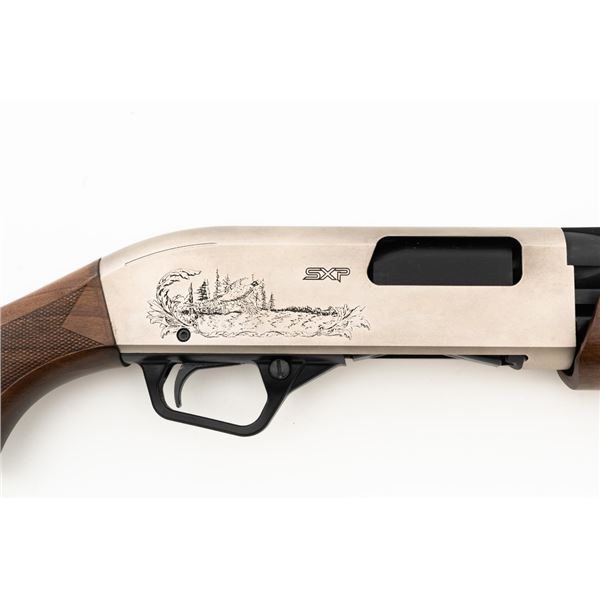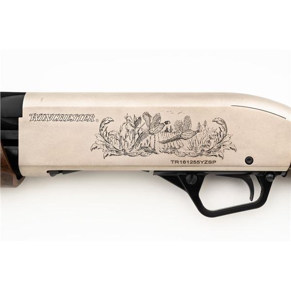 Winchester Model SXP Upland Field Slide Action Shotgun, #TR161255YZSP, 12 ga., 28" vent rib barrel with 3" chamber and screw-in IM choke tube, blue finish on the barrel and French Gray receiver, machine engraved with game scenes, checkered walnut pistol grip stock and forend. Buttstock ends with a solid rubber recoil pad, providing a 14" LOP. With red fiber optic front sight. Includes factory box with matching end label, instruction manual, warranty card, four (4) choke tubes (Mod, IC, Cyl, Full), and associated packaging materials. Shotgun is in excellent overall condition, appearing as new in the factory box. Barrel retains 99% factory finish. Stock has only a few light storage marks. Action functions smoothly. Bore is mirror bright. Est.: $400-$600. (Modern)