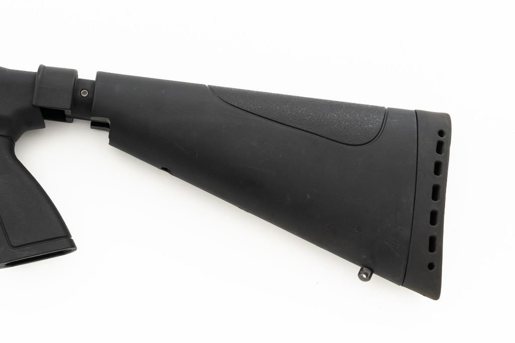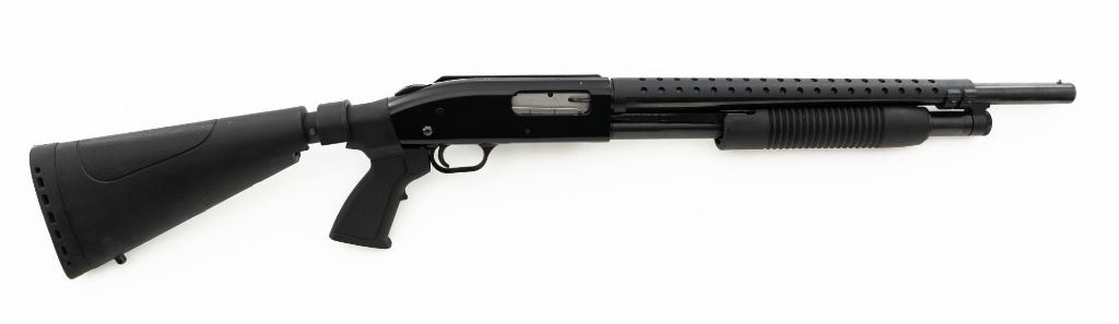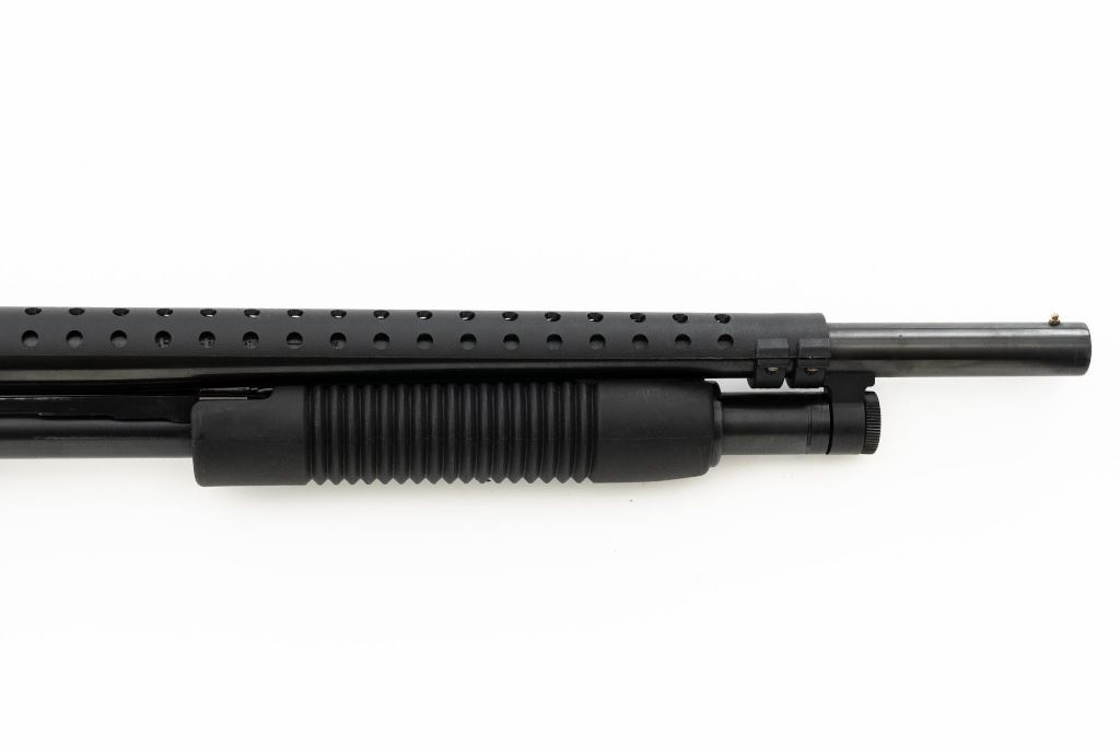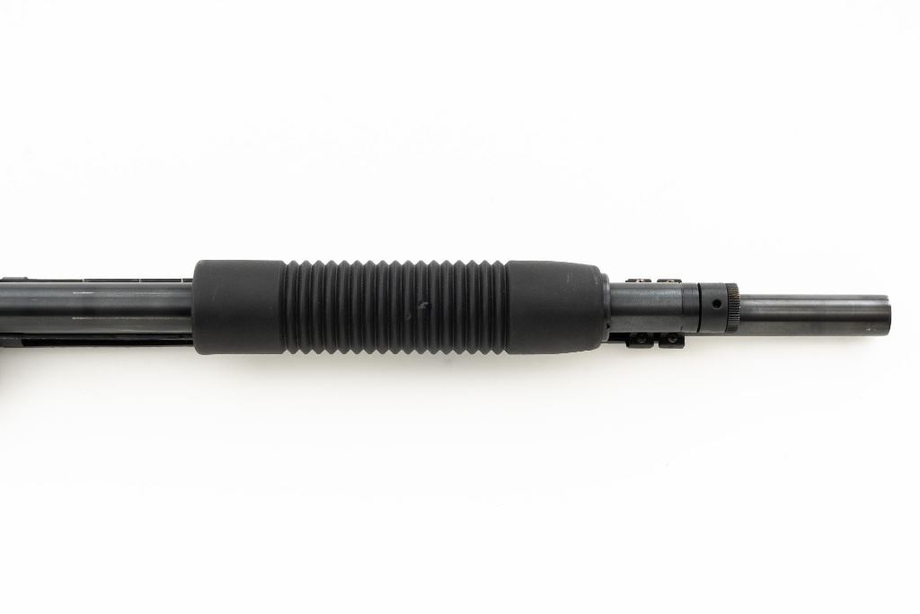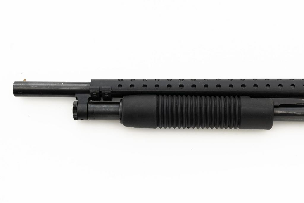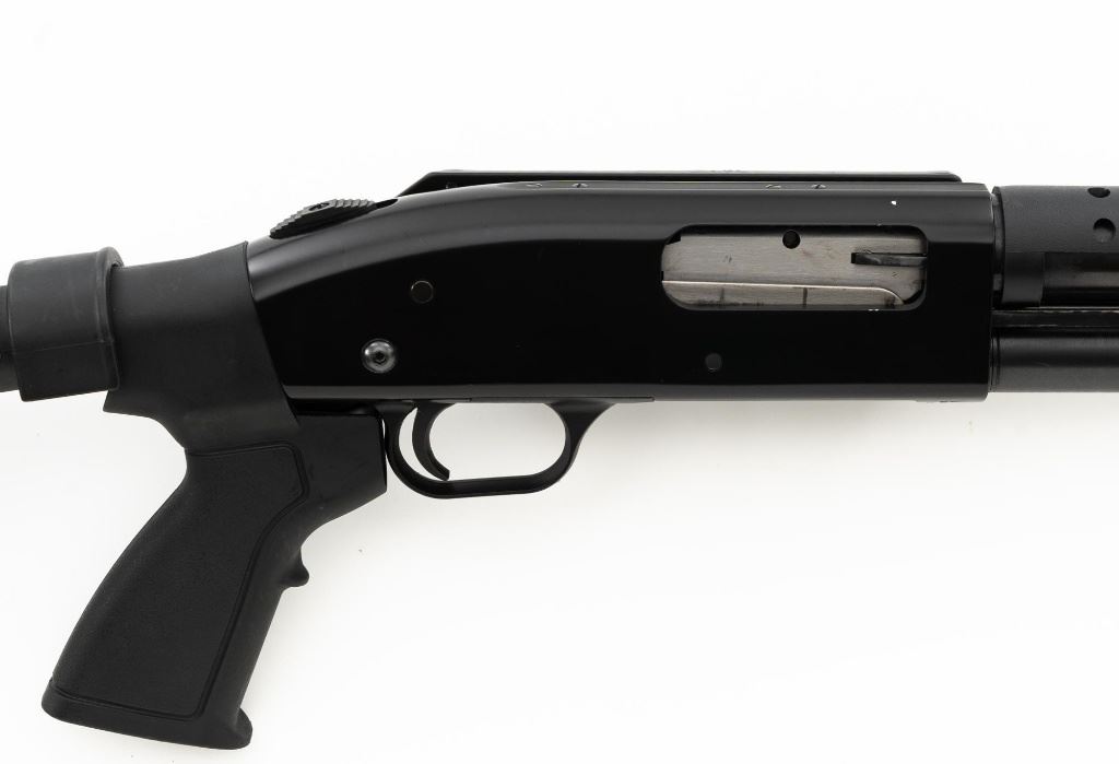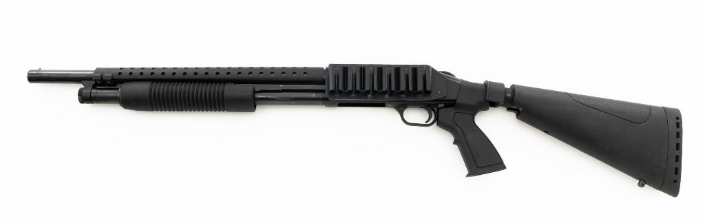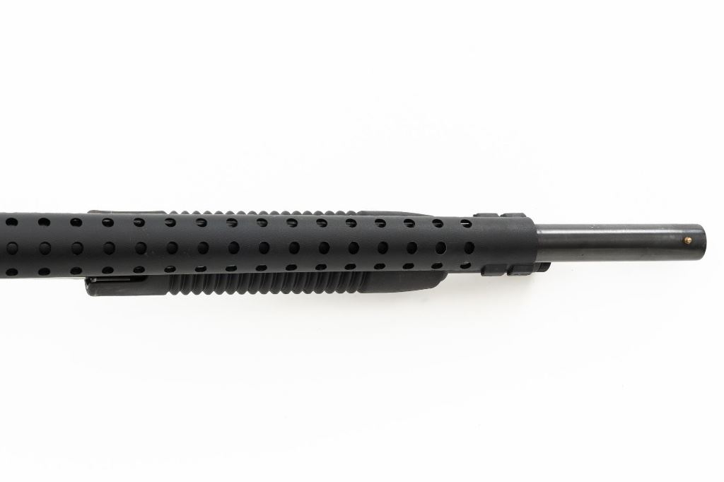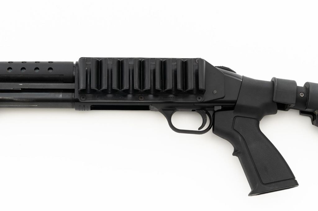 Mossberg 500A Slide Action Shotgun, #P802401, 12 ga., 18.5" barrel with Cylinder choke, 13.75" ventilated heat shield, blue finish, TacStar Industries 6-rd. side saddle, black plastic pistol grip stock and forend. Condition is very good. There light handling marks and freckling to the metal surfaces. Stock with light scuffs. Action is crisp with a bright bore. This shotgun appears to have been fired very little but displays storage related cosmetic blemishes. Est.: $200-300. (Modern)