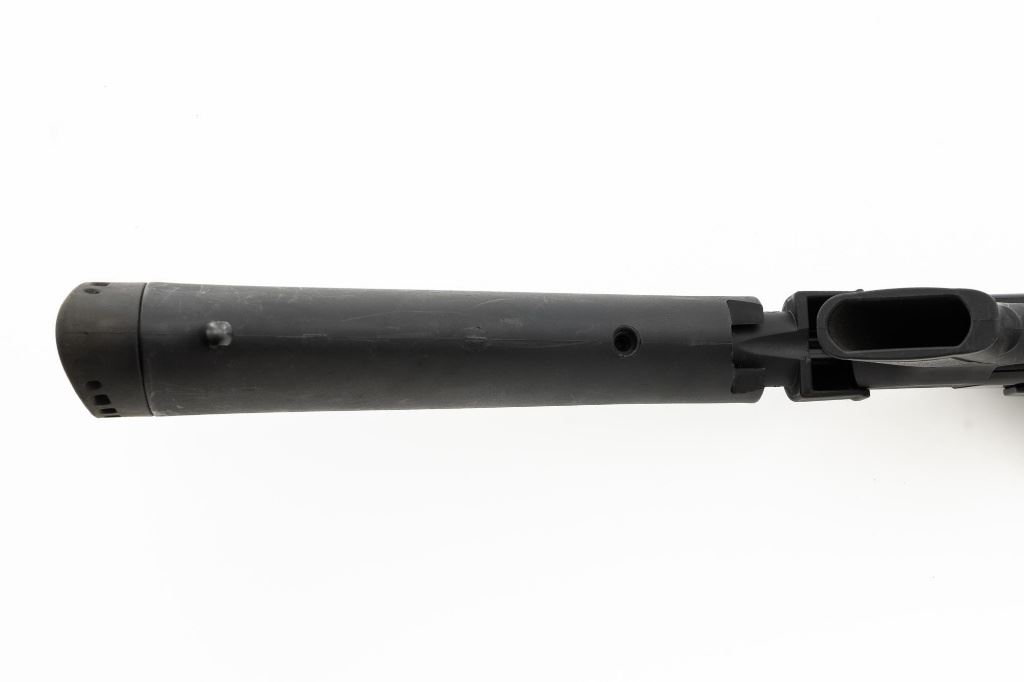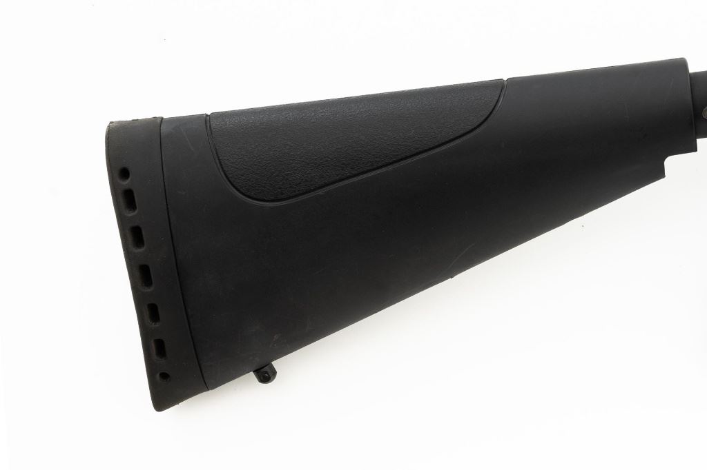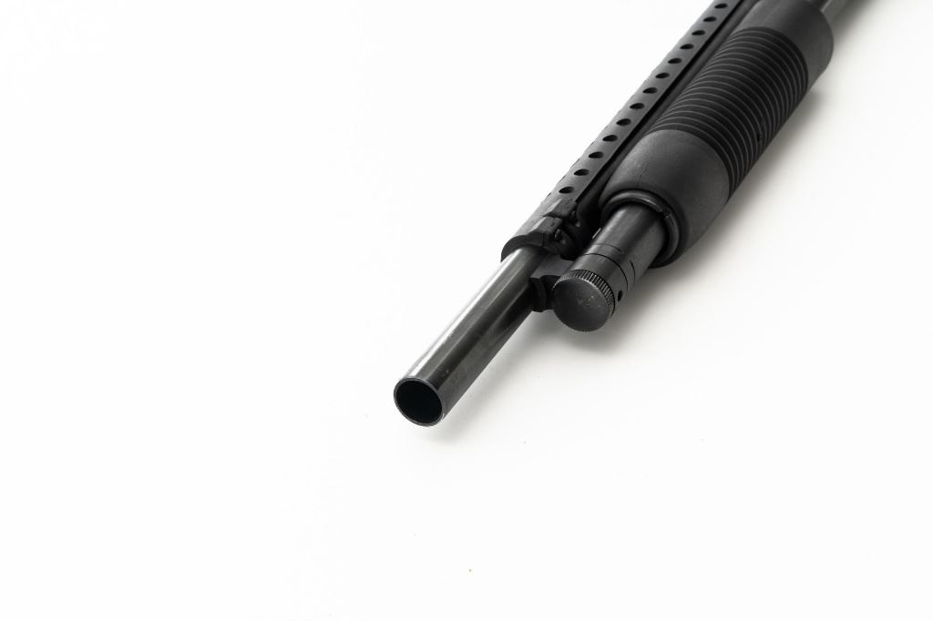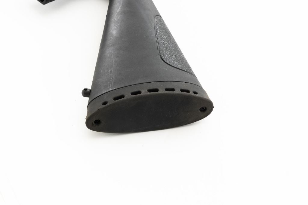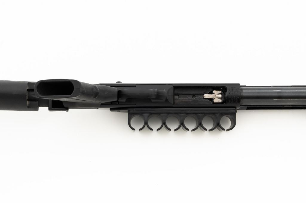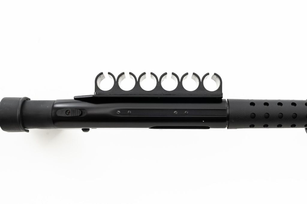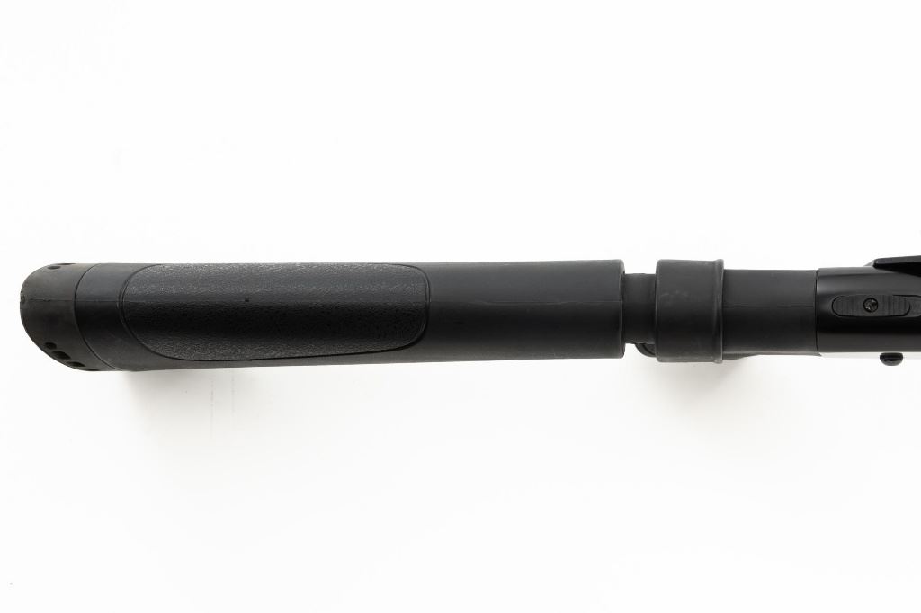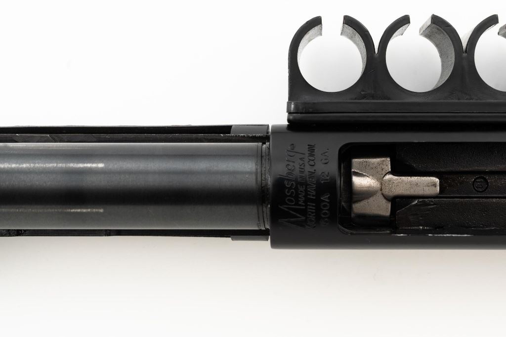 Mossberg 500A Slide Action Shotgun, #P802401, 12 ga., 18.5" barrel with Cylinder choke, 13.75" ventilated heat shield, blue finish, TacStar Industries 6-rd. side saddle, black plastic pistol grip stock and forend. Condition is very good. There light handling marks and freckling to the metal surfaces. Stock with light scuffs. Action is crisp with a bright bore. This shotgun appears to have been fired very little but displays storage related cosmetic blemishes. Est.: $200-300. (Modern)