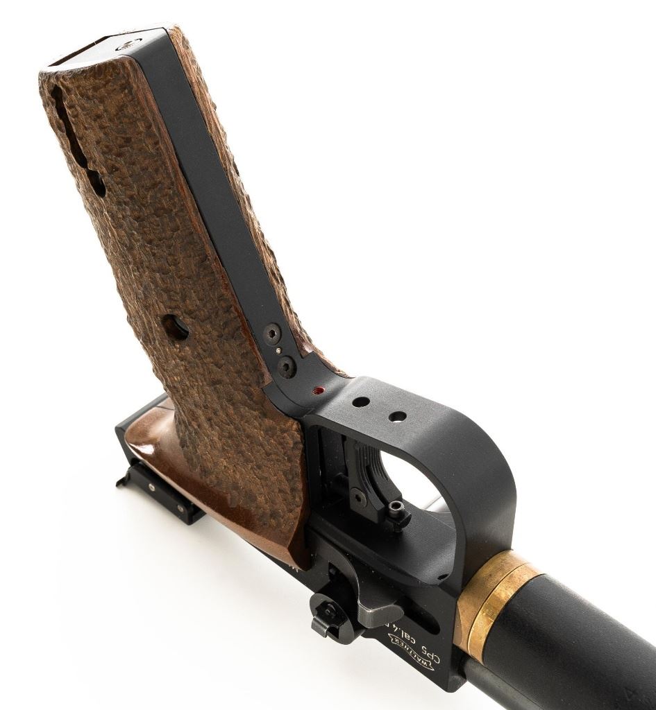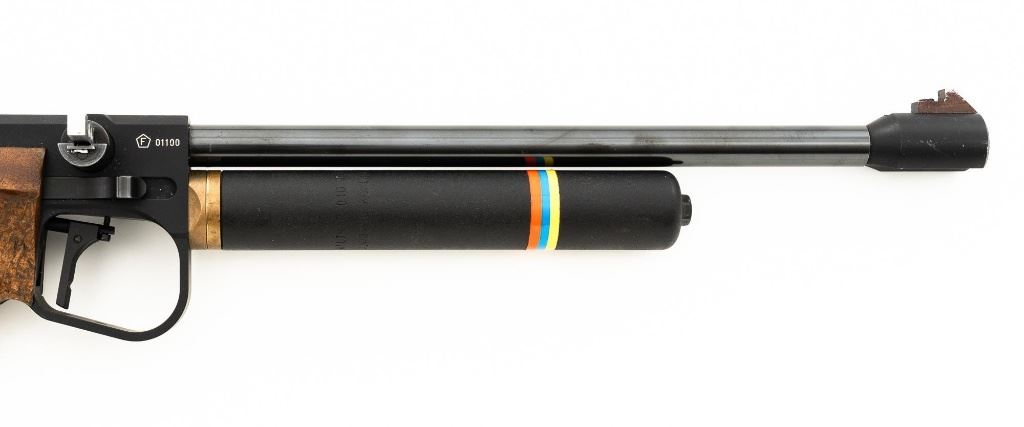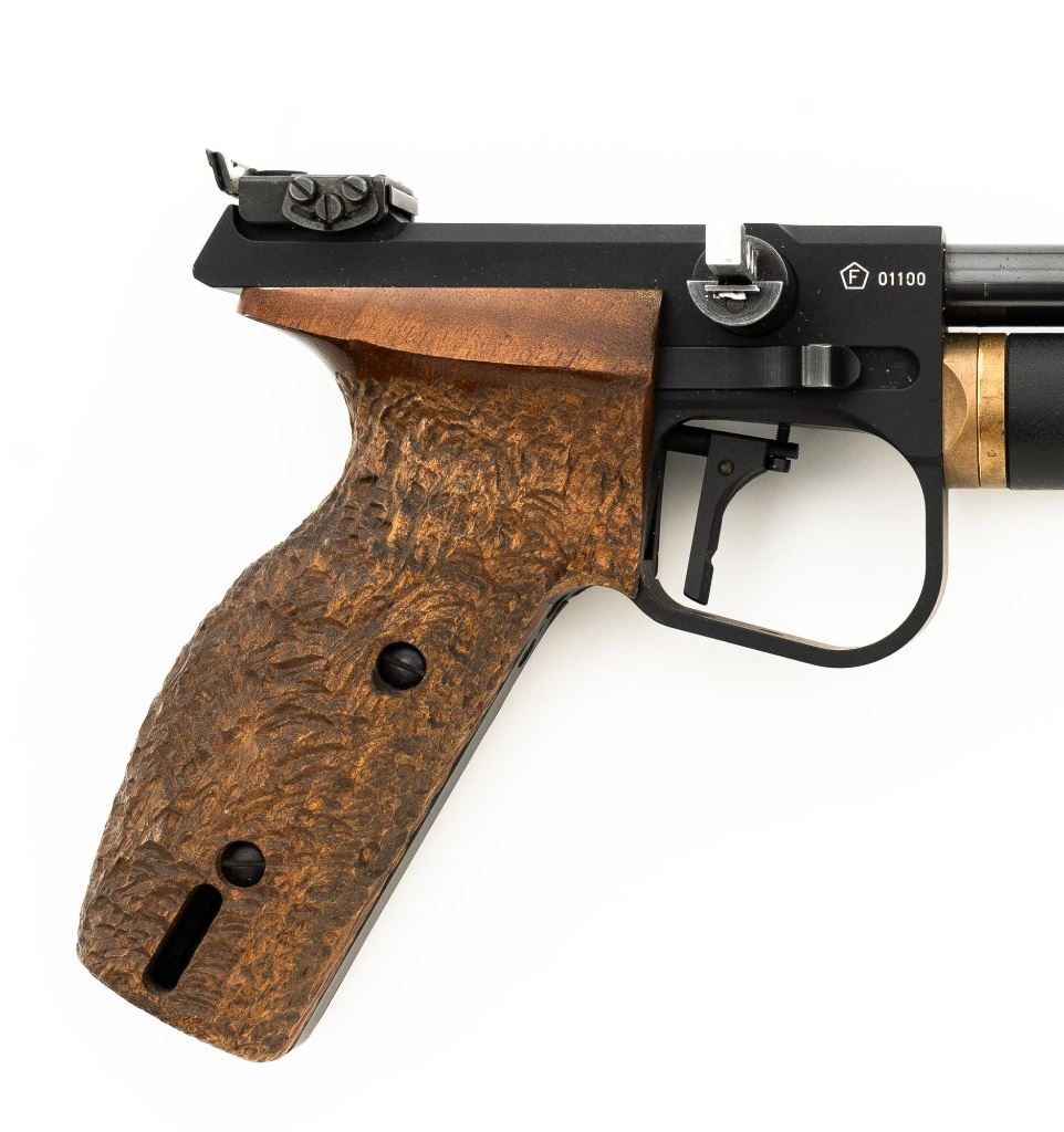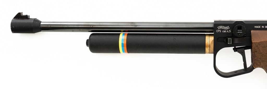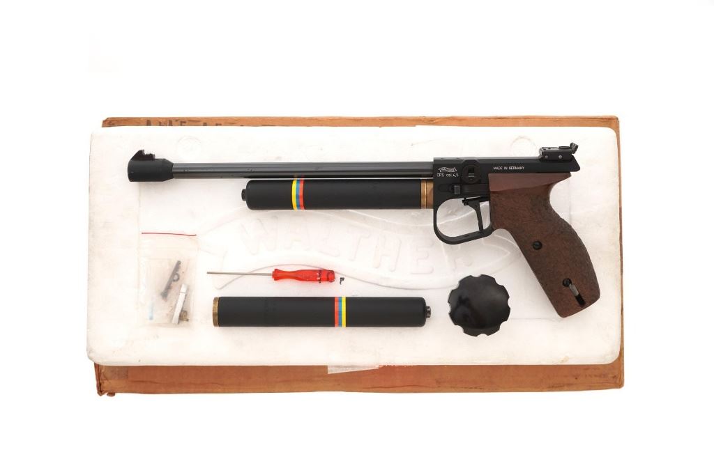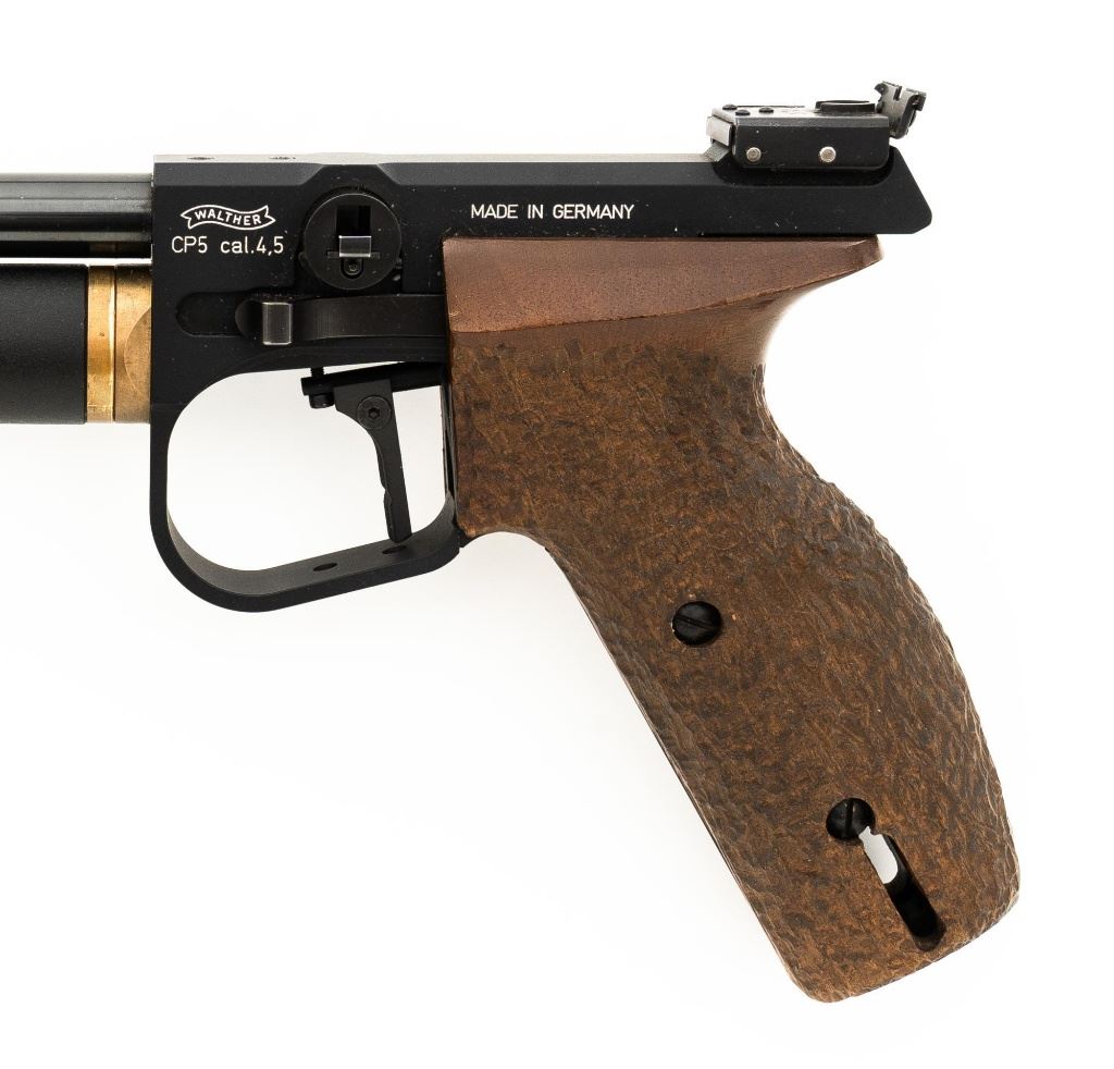 Walther CP5 Rapid Fire Semi-Automatic CO2 Air Pistol, #01100, .177 cal., 12" barrel, blued finish, hardwood grips, electronic trigger, with target sights (front sight post is missing). Includes two (2) air tanks, two (2) magazines, tool for removing air tank, misc. small parts, factory Styrofoam shipping container, and outer shipping box that is missing one of the end flaps. Pistol is in near excellent condition. Metal surfaces have intermittent minor marks consistent with use and handling. Factory grips have been re-contoured, and a rough carved texture has been applied. Action operates smoothly but the pistol has not been test fired. Est.: $500-$750.