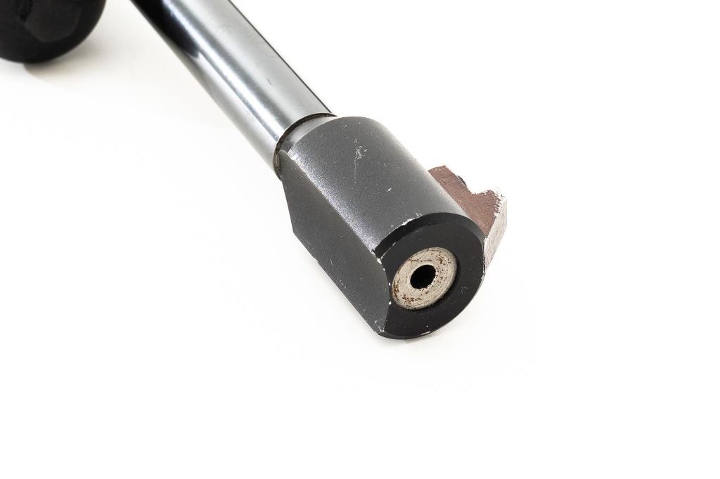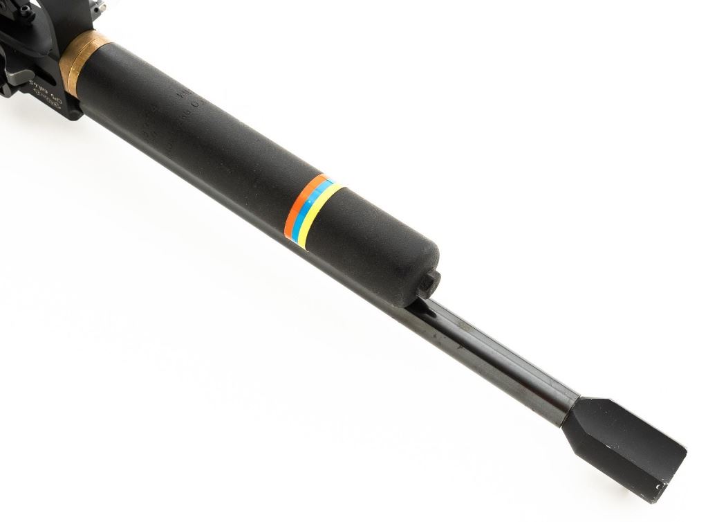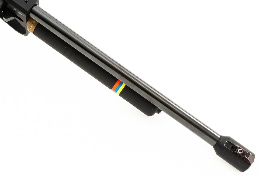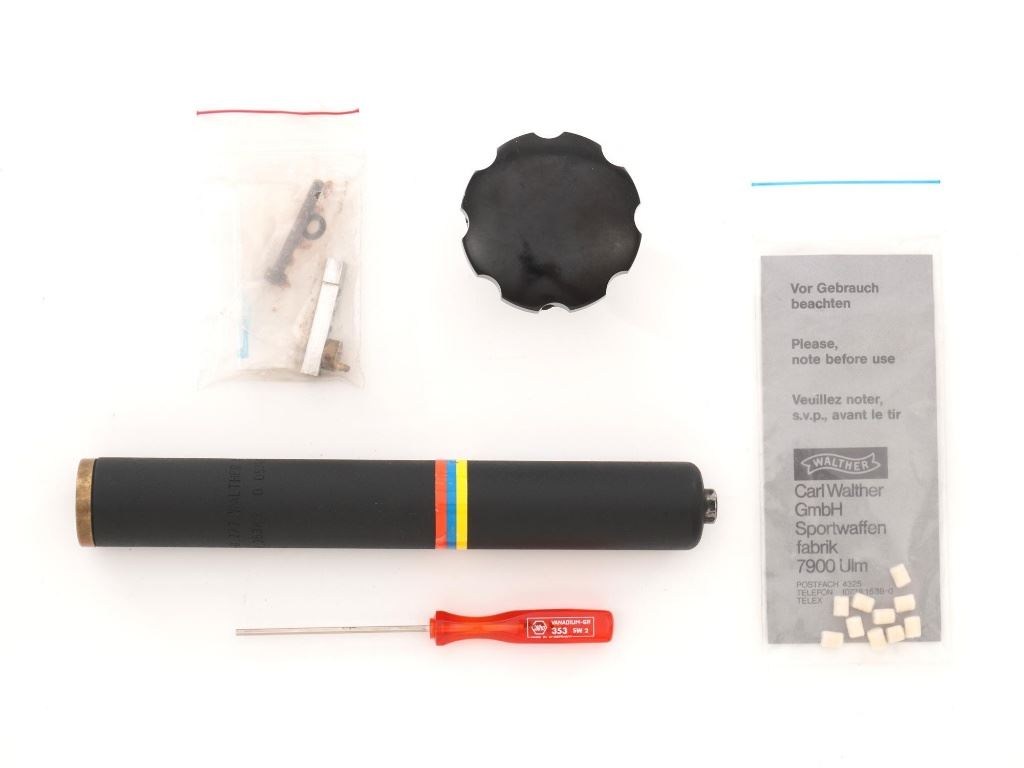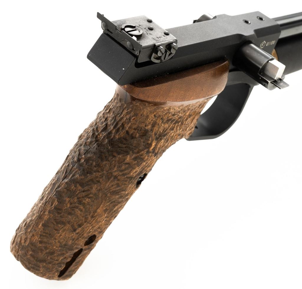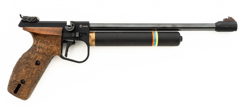 Walther CP5 Rapid Fire Semi-Automatic CO2 Air Pistol, #01100, .177 cal., 12" barrel, blued finish, hardwood grips, electronic trigger, with target sights (front sight post is missing). Includes two (2) air tanks, two (2) magazines, tool for removing air tank, misc. small parts, factory Styrofoam shipping container, and outer shipping box that is missing one of the end flaps. Pistol is in near excellent condition. Metal surfaces have intermittent minor marks consistent with use and handling. Factory grips have been re-contoured, and a rough carved texture has been applied. Action operates smoothly but the pistol has not been test fired. Est.: $500-$750.