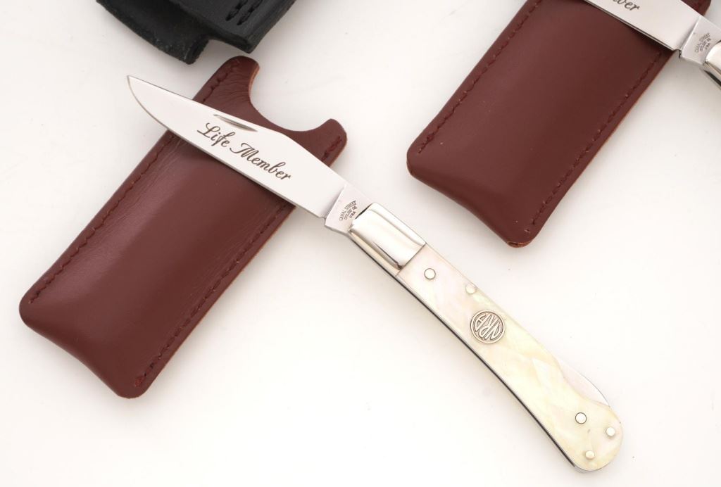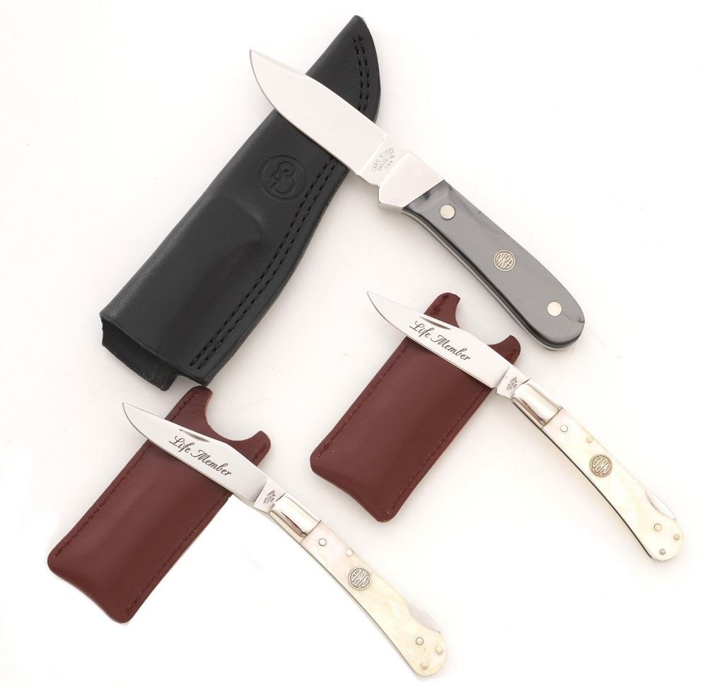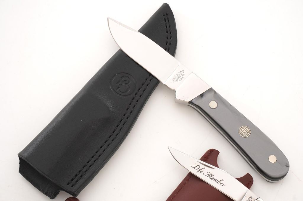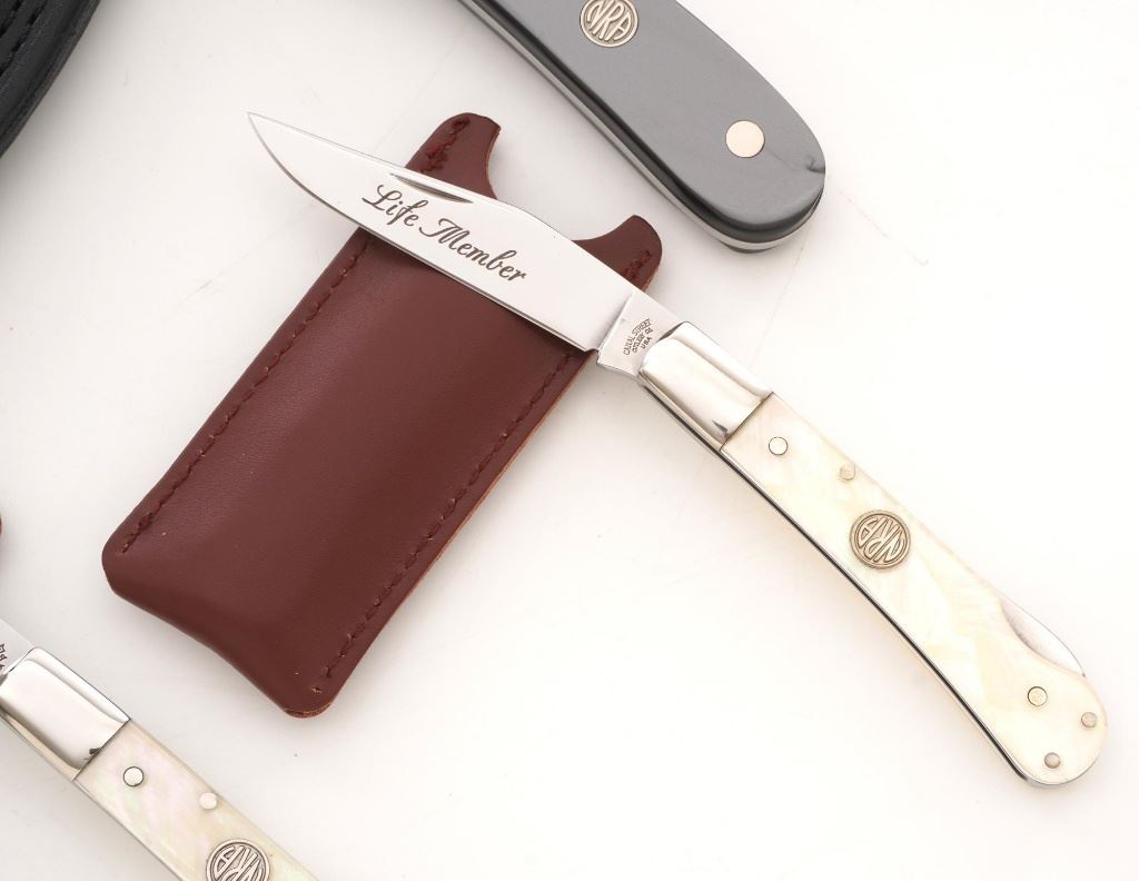 Lot of Three (3) Canal Street Cutlery NRA Edition Knives: 1.) Drop Point Hunter fixed blade knife with original black leather sheath, 3.4" blade, gray synthetic handles with NRA medallion, #021 on the bolster. Knife and sheath are in excellent condition, unused, with a few handling marks on the mirror polished bolster. 2/3.) Lockback folding knives, 3" blades are marked "Life Member", pearl scales with NRA medallion, each with "NRA Life Member" slip case. Knives are in excellent condition, with light handling marks to the bolsters. Est.: $300-$400/lot.