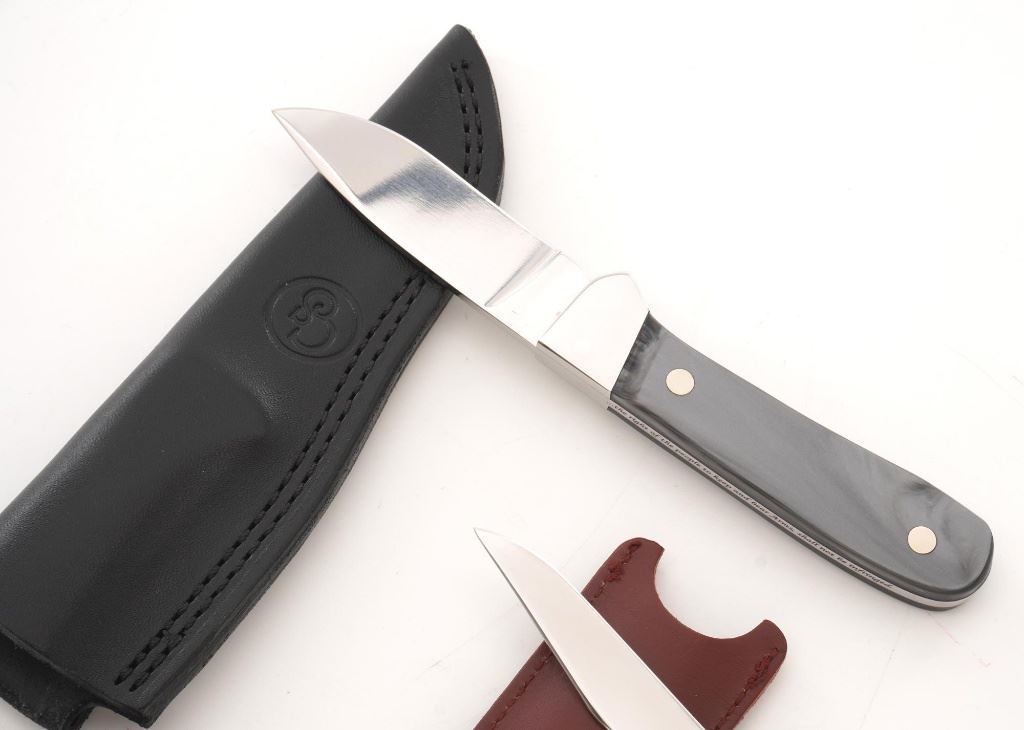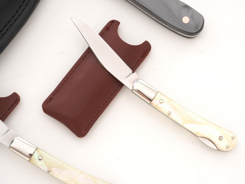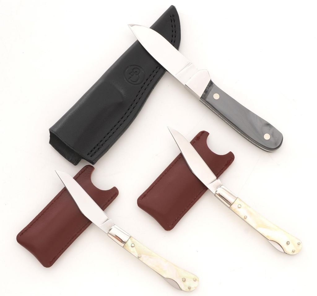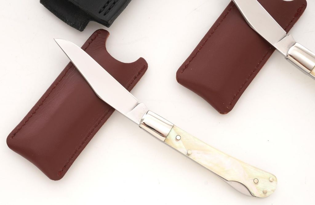 Lot of Three (3) Canal Street Cutlery NRA Edition Knives: 1.) Drop Point Hunter fixed blade knife with original black leather sheath, 3.4" blade, gray synthetic handles with NRA medallion, #021 on the bolster. Knife and sheath are in excellent condition, unused, with a few handling marks on the mirror polished bolster. 2/3.) Lockback folding knives, 3" blades are marked "Life Member", pearl scales with NRA medallion, each with "NRA Life Member" slip case. Knives are in excellent condition, with light handling marks to the bolsters. Est.: $300-$400/lot.