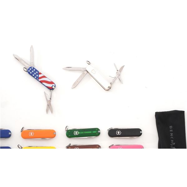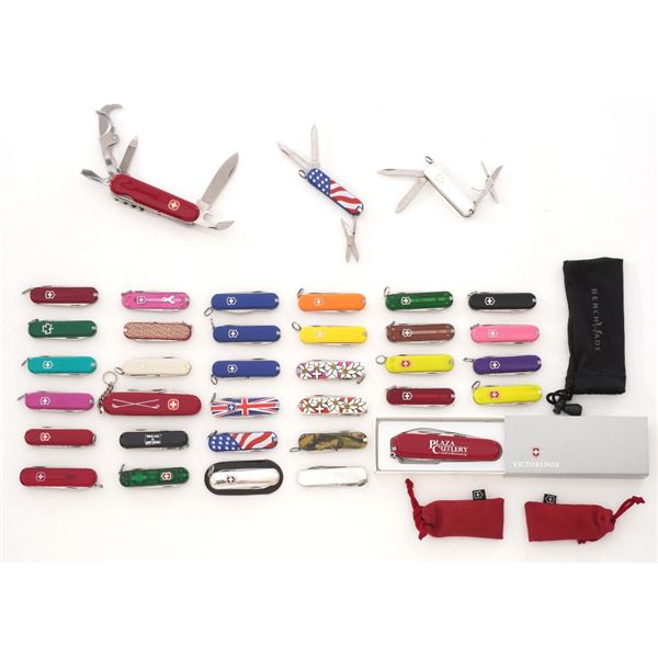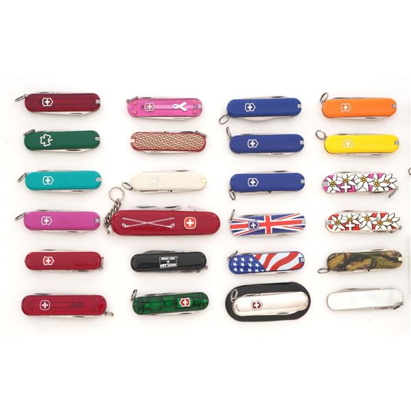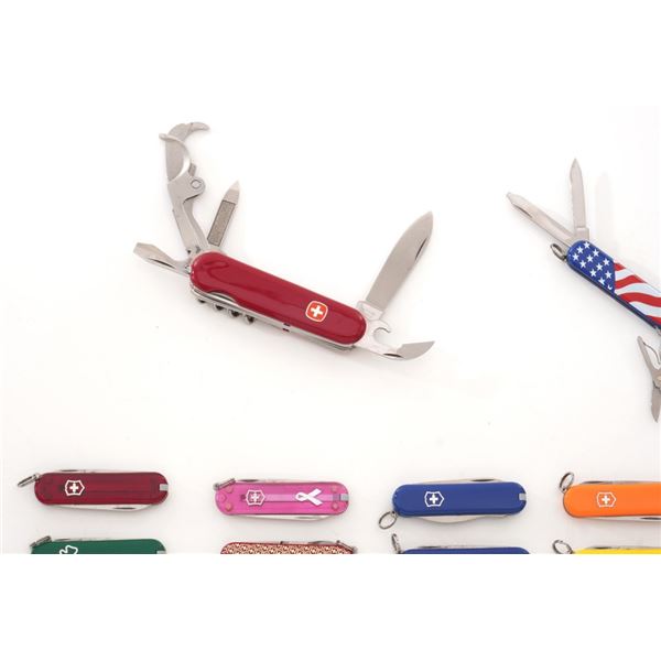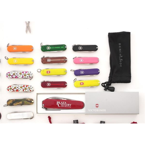 Lot of Thirty-Six (36) Swiss Army Knives, almost all are manufactured by Victorinox and are the Classic SD model with small knife blade, nail file, scissors, toothpick, and tweezers. Three (3) with lights. Featuring a wide variety of handle colors, a few with custom company branding/logos. Includes a medium sized 40th Anniversary Plaza Cutlery branded knife, new in the box. Two (2) medium sized Wenger Delemont multi-function knives. Ranging from lightly used and very good, to new condition. Est.: $200-$400/lot.