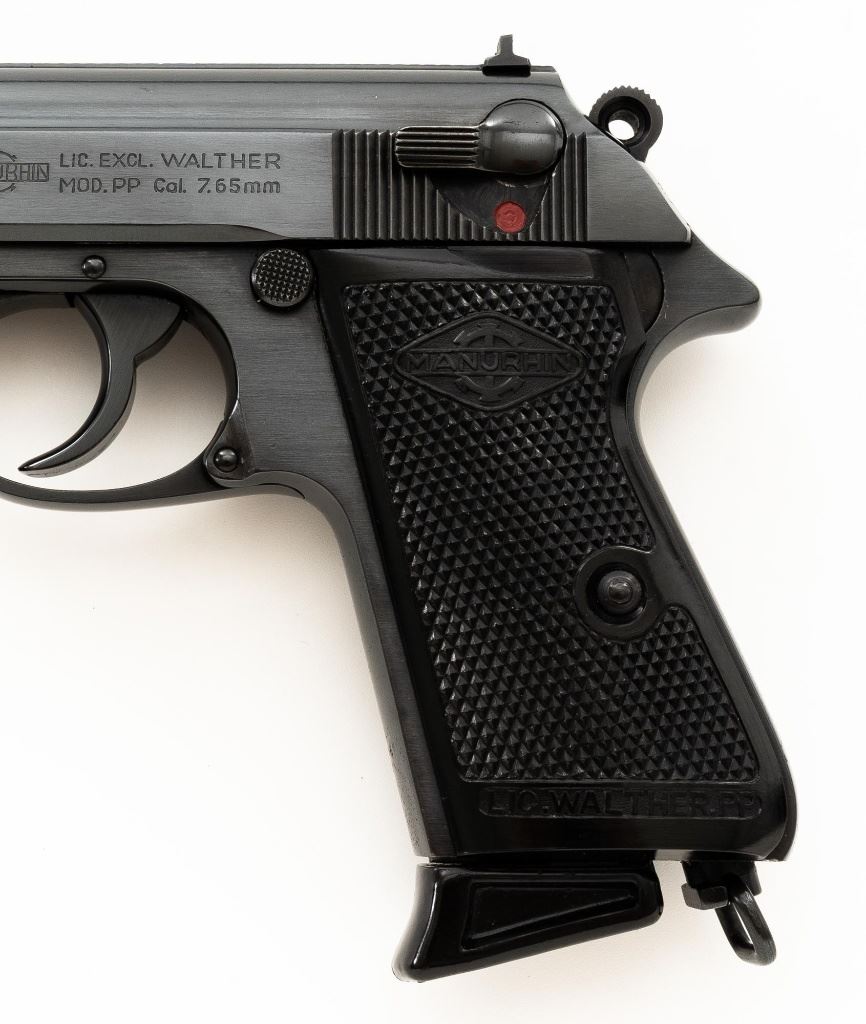 Early French Manurhin Walther Model PP Semi-Automatic Double Action Pistol, #19970, .32 ACP cal., 3.9" barrel, blue finish, checkered composition two-piece Manurhin grips, lanyard loop, low profile blade front and drift adjustable square-notch rear sight. Includes one 8-round Manurhin blue steel magazine with finger extension and factory hardcase. Factory markings are clear, with French proofs on the right side of the frame, slide, and barrel. Pistol is in near excellent overall condition, retaining approx. 97%-98% blue, with a few spots of mild corrosion at the left side of the muzzle. Frame shows some areas of light edge wear. Grips are in excellent condition with sharp checkering detail. Action is crisp. Bore is mirror bright with excellent rifling, showing little use. Est.: $600-$800. (C&R/PPT)