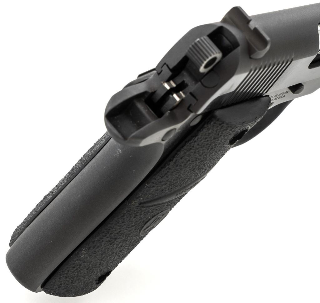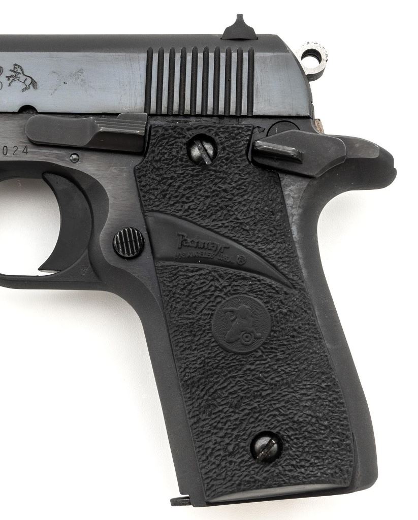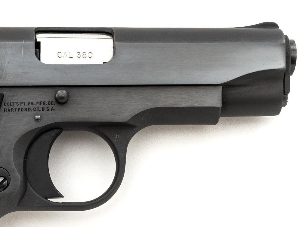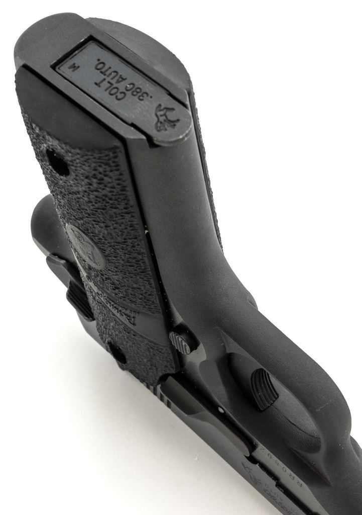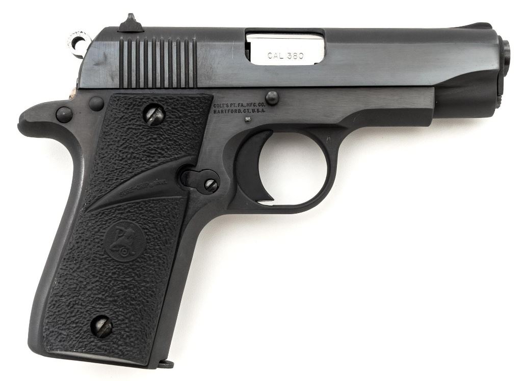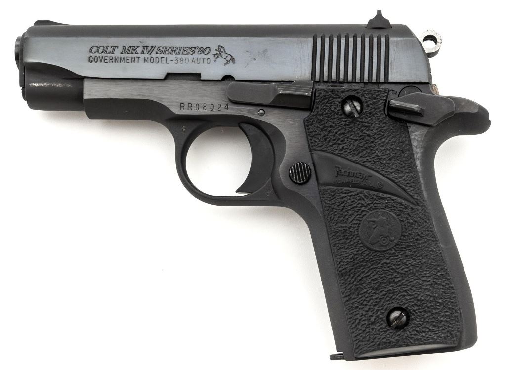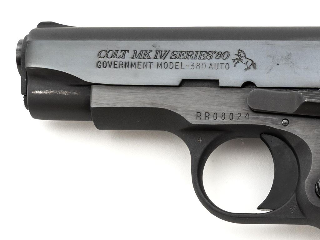 Colt MK IV Series 80 Government Model Semi-Automatic Pistol, #RR08024, .380 ACP cal., 2.75" barrel, blued finish, Pachmayr "Sure-Grip" two-piece stippled black rubber grips, blade front sight, square-notched rear sight, with one 7-round Colt magazine. Mfg'd 1989. Condition is excellent overall, retaining approx. 97%-98% factory blue, with scattered light handling marks to the frame and slide. Factory lettering is crisp. Grips with only a few light handling marks. Action is smooth. Bore is bright with clearly defined rifling. Est.: $600-$800. (Modern/PPT)