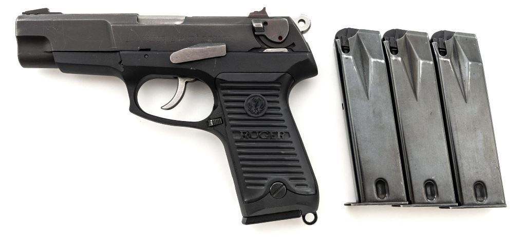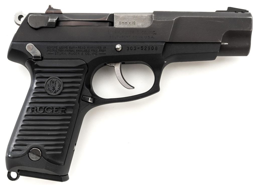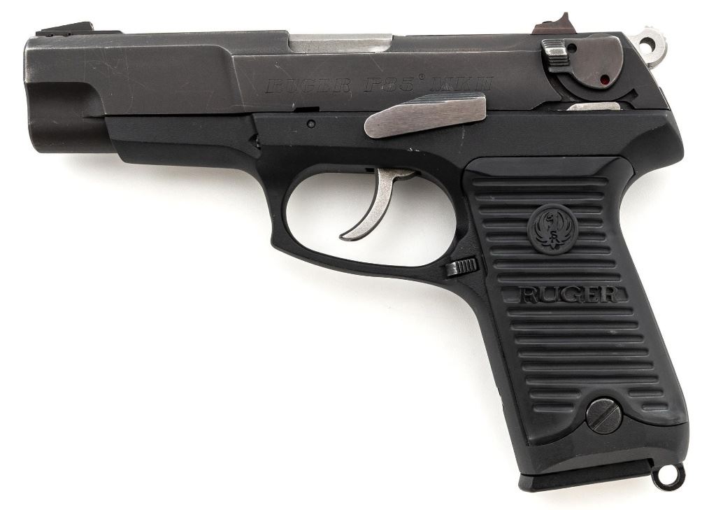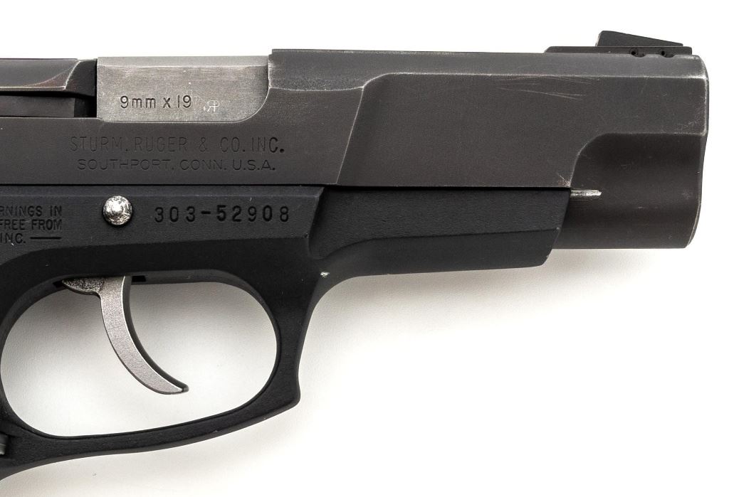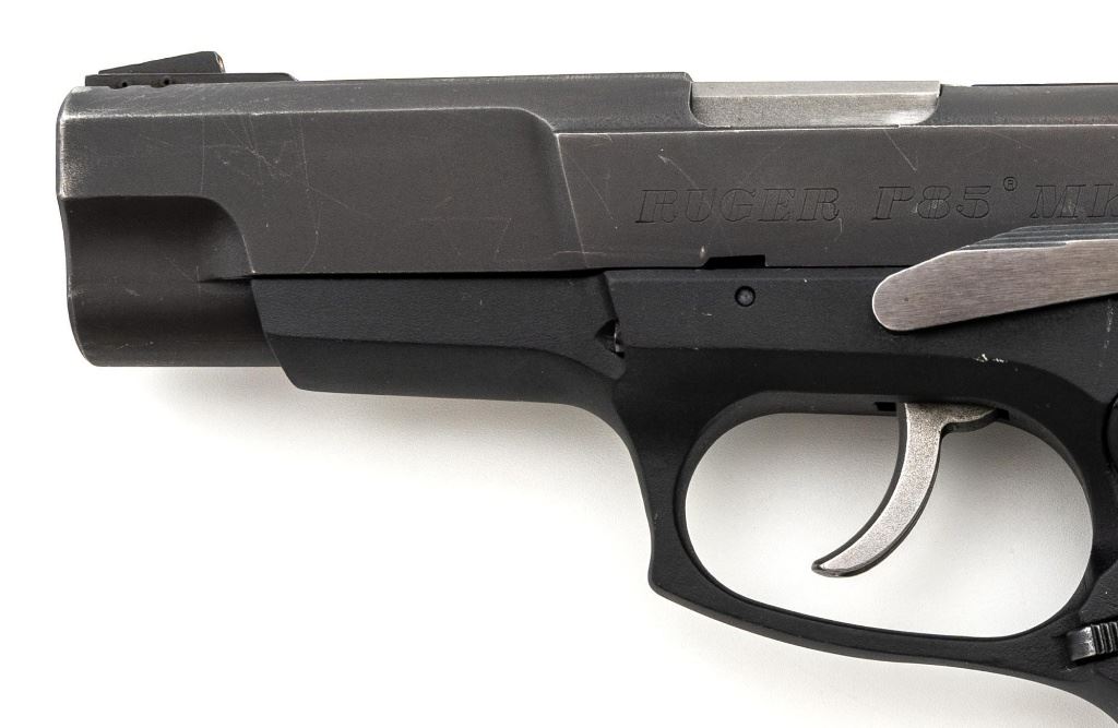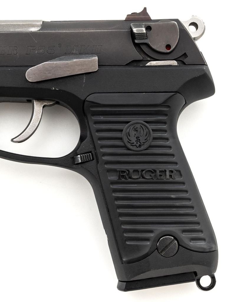 Ruger P85 MK II Semi-Automatic Pistol, #303-52908, 9mm, double/single action, 4.5" barrel, blued slide which has begun to tone to a plum color, black aluminum frame, black plastic Ruger serrated grips, ambidextrous safety/decocker, ambidextrous magazine release, with white 3-dot sights. Mfgd 1991. Includes one Mec-Gar 10-round magazine and three (3) unmarked 15-round magazines. Condition is very good showing finish wear to the decocker, rear sight, and some of the high points. Frame and slide show scattered light handling marks. Action is smooth, bore is bright with strong rifling. Est.: $300-$400. (Modern/PPT) (Magazines with a capacity greater than 10-rounds are not available for sale to CA residents or other states where such items are prohibited.)
