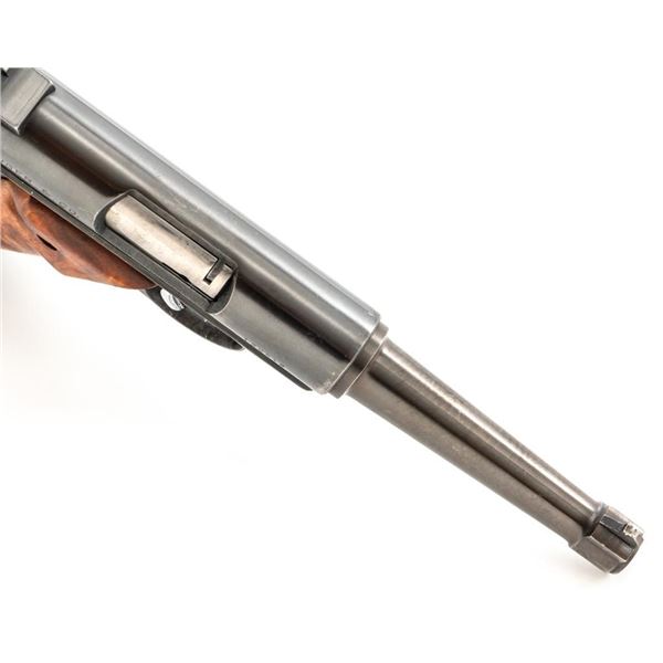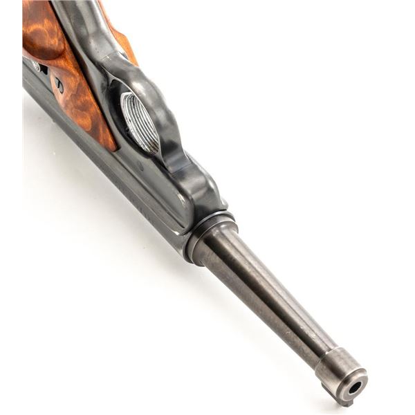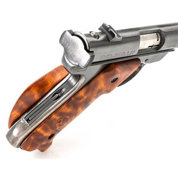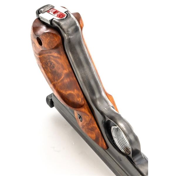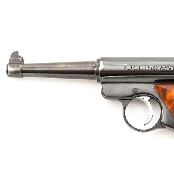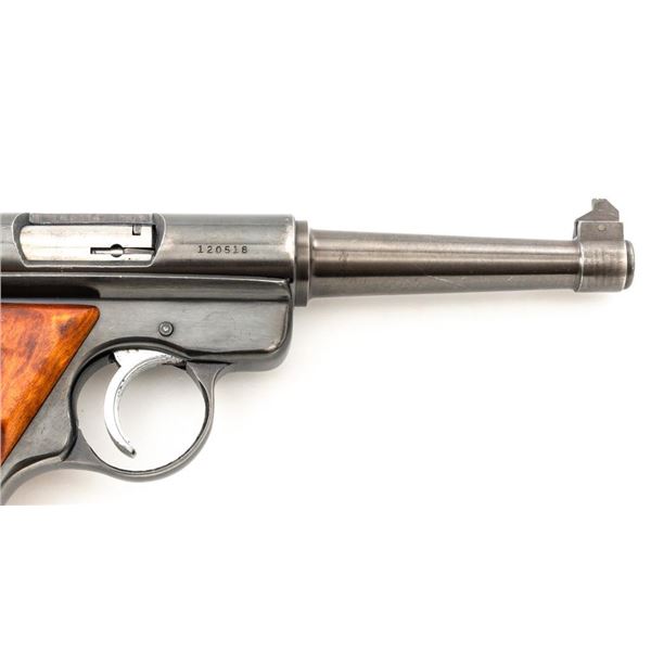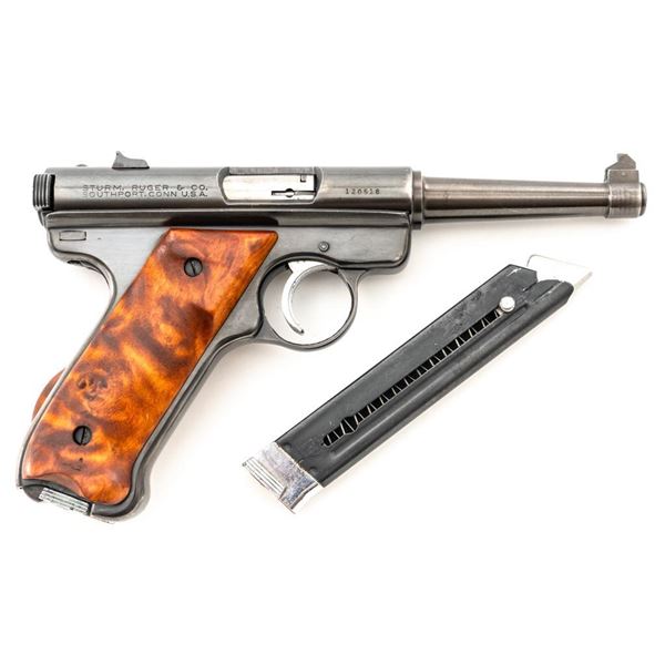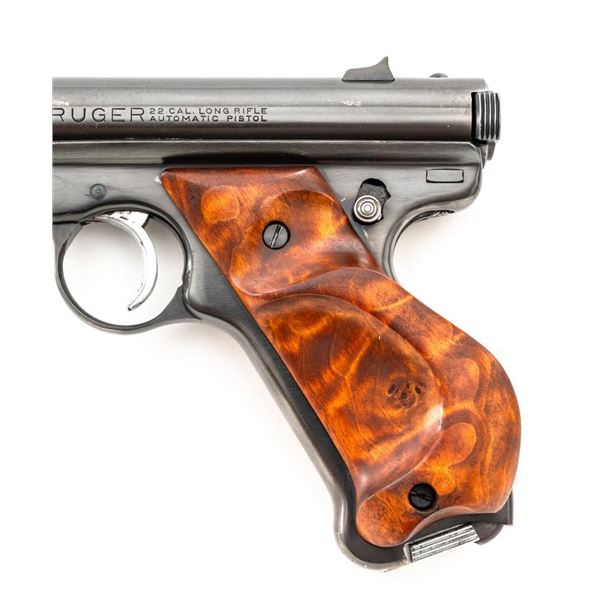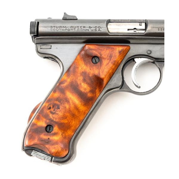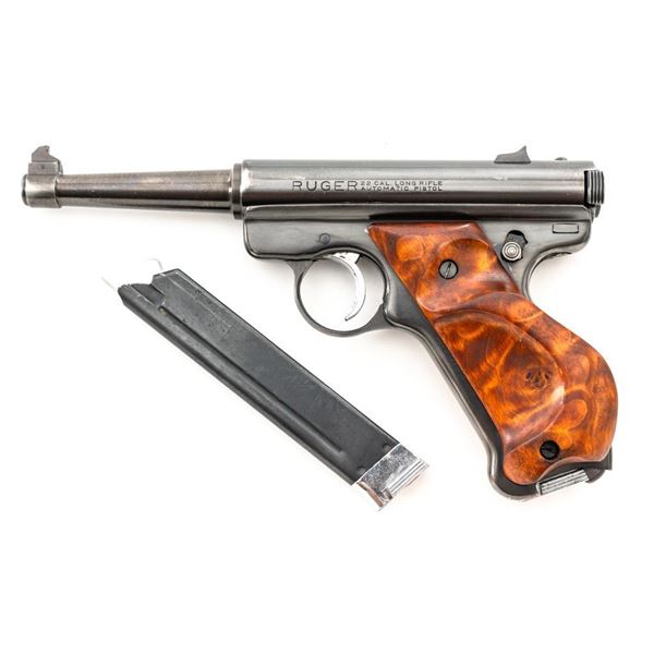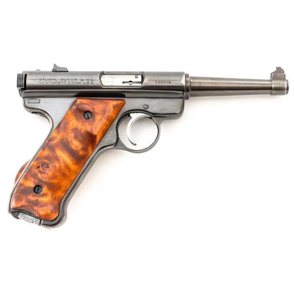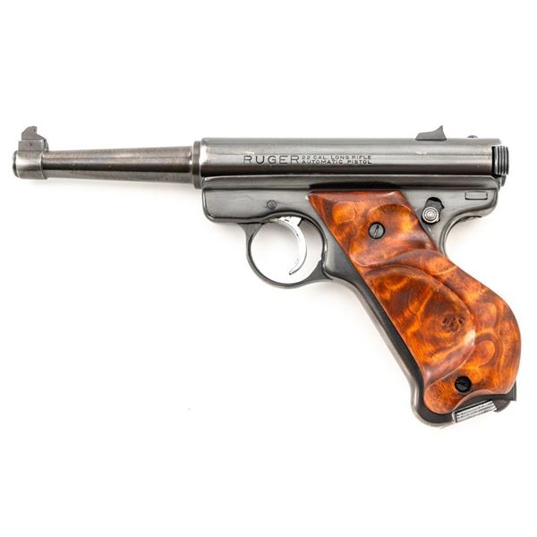 Ruger Standard Model Semi-Automatic Pistol, #120518, .22 LR cal., 4.9" tapered barrel, blued finish, custom smooth burl wood thumbrest grips, Patridge front sight, with square-notched fixed rear sight. Includes two (2) 10-round Ruger magazines. Mfg'd 1958. Overall condition is good, showing signs of moderate handling and range use. Blued surfaces show general thinning/wear and toning. Grips are in very good condition, with light handling wear and a few small nicks. Action is smooth. Bore rates very good overall and is bright with well-defined rifling. Est.: $200-$300. (C&R/PPT)