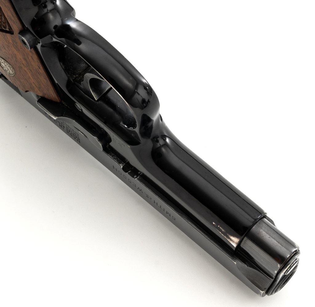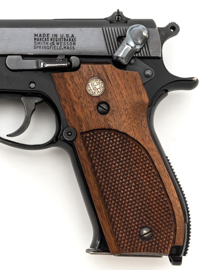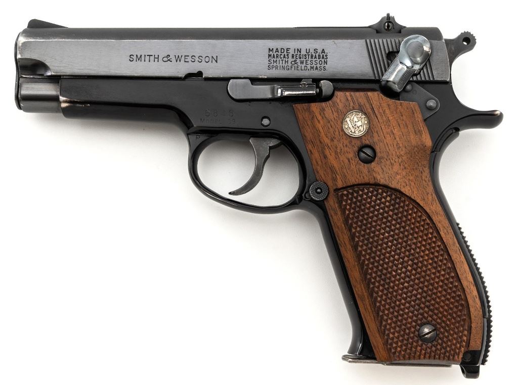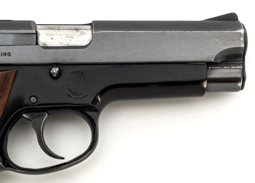 Smith & Wesson Model 39 Semi-Automatic Pistol, #6848, 9mm cal., 4.1" barrel, blue slide, black alloy frame, factory checkered wood grips with silver S&W medallions, long extractor, ramp front sight, and square-notched windage adjustable rear sight with white outline. Mfgd circa. 1959. Includes one 8-round factory magazine. Condition is excellent, retaining approx. 96%-98% factory finish, with wear at the front of the slide and frame accounting for most of the finish loss. Otherwise, metal shows normal intermittent light marks from handling and use. Magazine base plate has faded to a gray. Grips are near excellent, checkering is sharp, right panel has several very small impressions in the wood. Action operates smoothly. Bore is bright with well-defined rifling. Est.: $600-$900. (Modern/PPT)