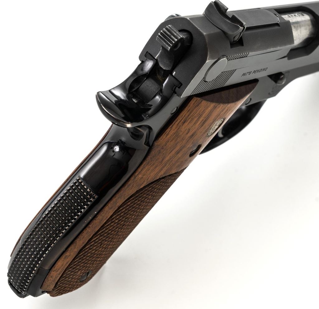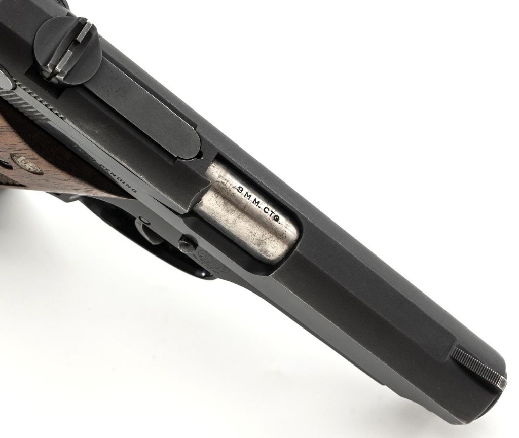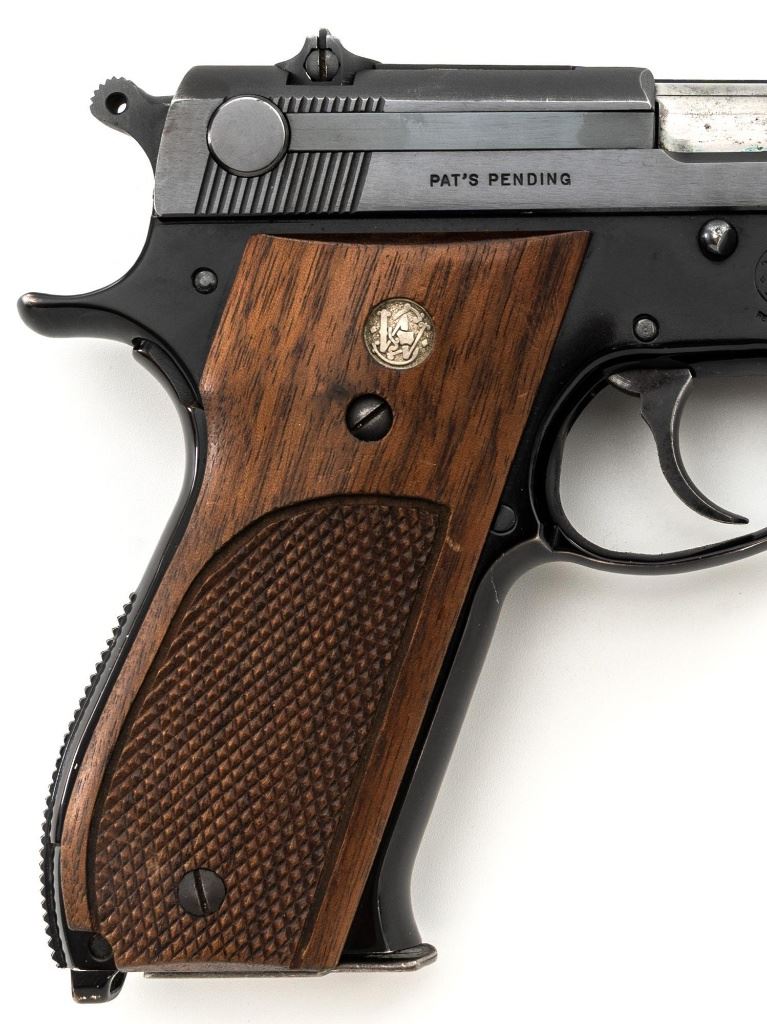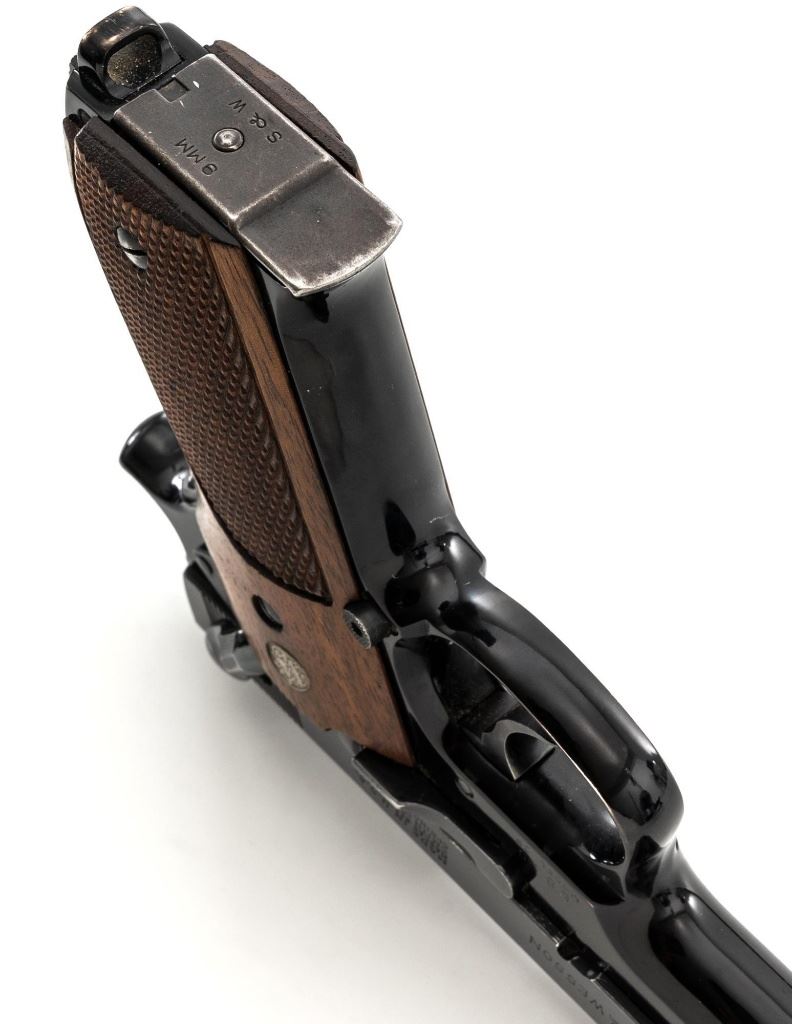 Smith & Wesson Model 39 Semi-Automatic Pistol, #6848, 9mm cal., 4.1" barrel, blue slide, black alloy frame, factory checkered wood grips with silver S&W medallions, long extractor, ramp front sight, and square-notched windage adjustable rear sight with white outline. Mfgd circa. 1959. Includes one 8-round factory magazine. Condition is excellent, retaining approx. 96%-98% factory finish, with wear at the front of the slide and frame accounting for most of the finish loss. Otherwise, metal shows normal intermittent light marks from handling and use. Magazine base plate has faded to a gray. Grips are near excellent, checkering is sharp, right panel has several very small impressions in the wood. Action operates smoothly. Bore is bright with well-defined rifling. Est.: $600-$900. (Modern/PPT)