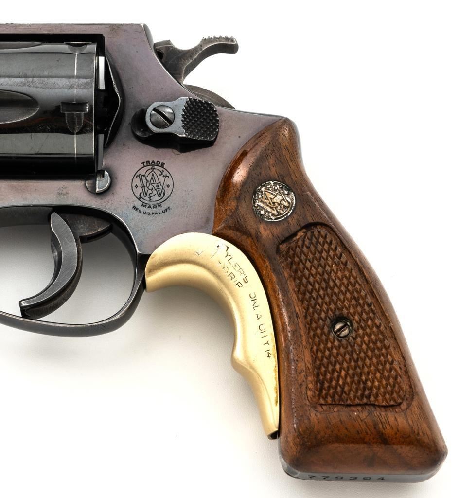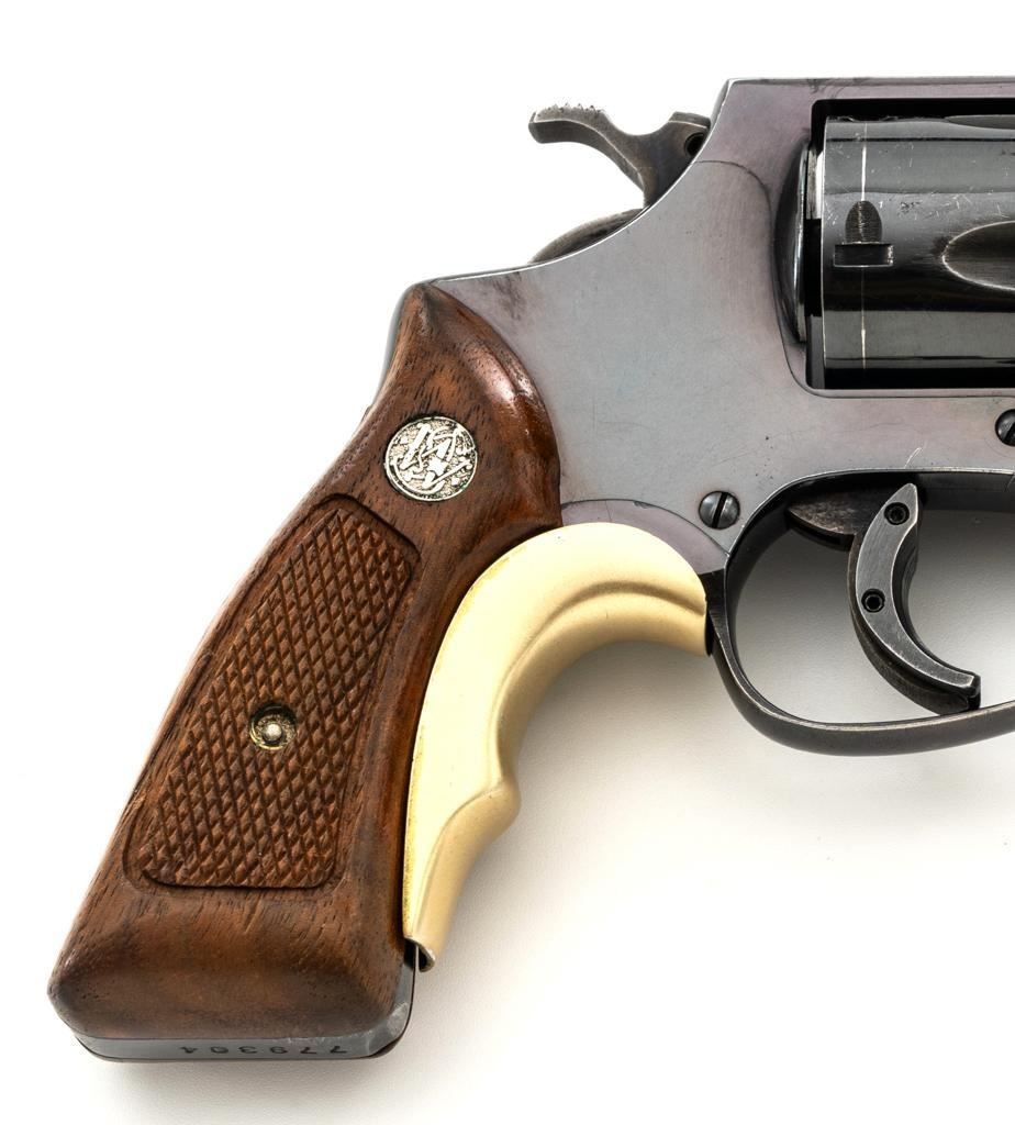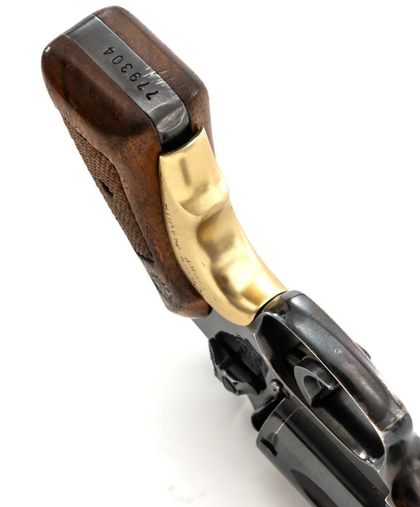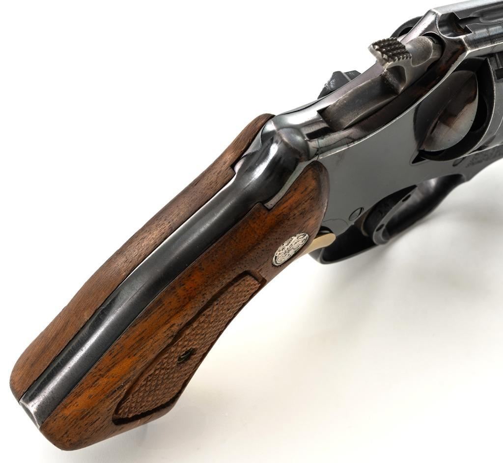 Smith & Wesson Model 36 Chiefs Special No Dash 5-Shot Revolver, #779304, .38 Spl cal., 1.9" pinned barrel, blue finish, checkered walnut two-piece grips with S&W medallions, added grip adapter, serrated blade front sight, fixed square-notch rear sight, color case hardened hammer and trigger, with added trigger shoe. Revolver is in near fine overall condition, retaining approx. 93%-94% factory blue, with holster wear at the muzzle and edges, with scattered light scratches and handling marks. Grips are in very good condition, with some flattening of the checkering, minor indentations, and verdi gris around the medallions. Interior of the right grip panel is stamped with the matching serial number. Action functions smoothly. Bore with well-defined rifling. Est.: $400-$600. (Modern/PPT)