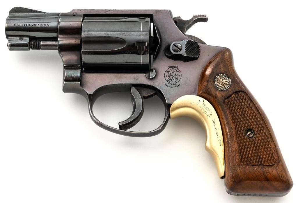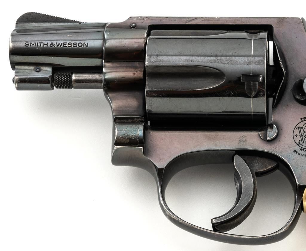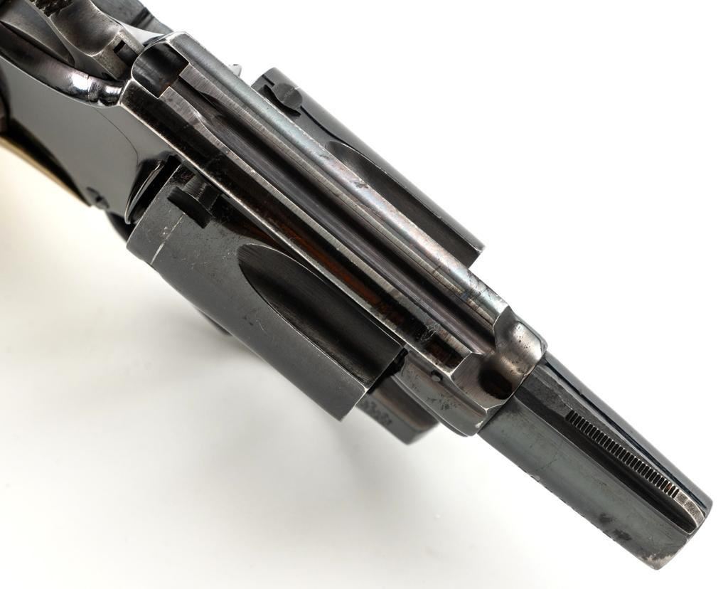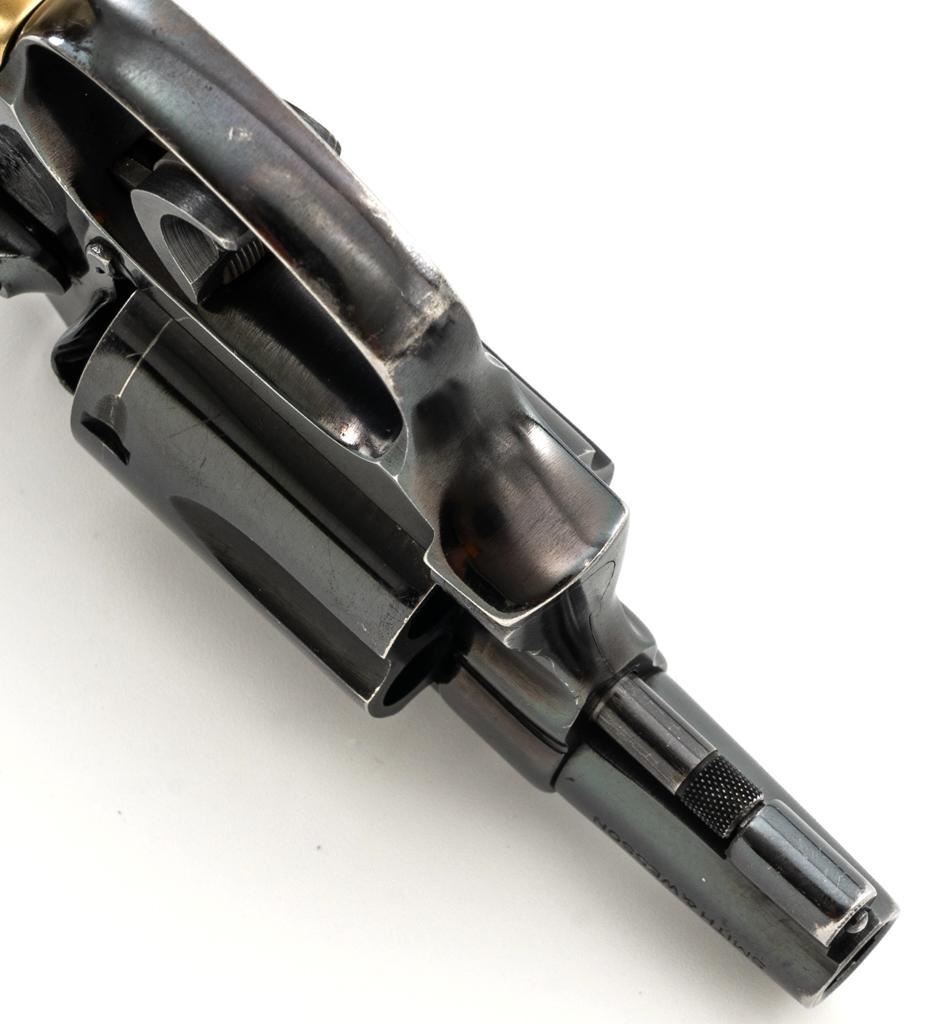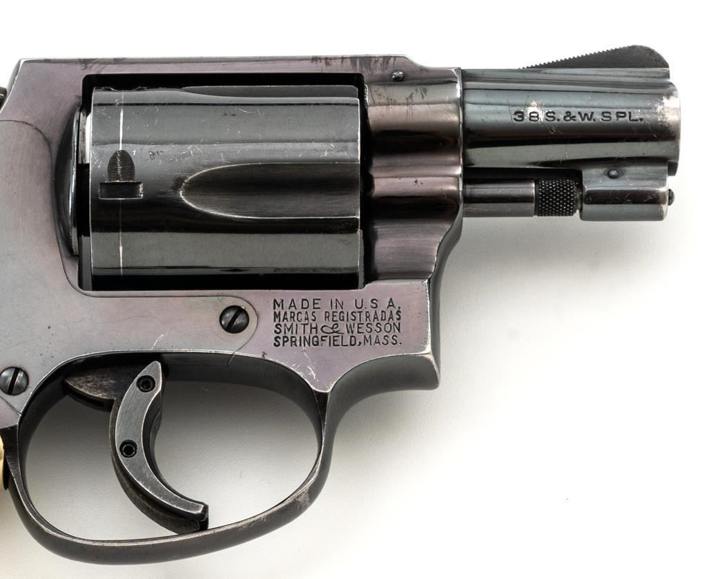 Smith & Wesson Model 36 Chiefs Special No Dash 5-Shot Revolver, #779304, .38 Spl cal., 1.9" pinned barrel, blue finish, checkered walnut two-piece grips with S&W medallions, added grip adapter, serrated blade front sight, fixed square-notch rear sight, color case hardened hammer and trigger, with added trigger shoe. Revolver is in near fine overall condition, retaining approx. 93%-94% factory blue, with holster wear at the muzzle and edges, with scattered light scratches and handling marks. Grips are in very good condition, with some flattening of the checkering, minor indentations, and verdi gris around the medallions. Interior of the right grip panel is stamped with the matching serial number. Action functions smoothly. Bore with well-defined rifling. Est.: $400-$600. (Modern/PPT)