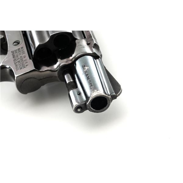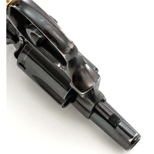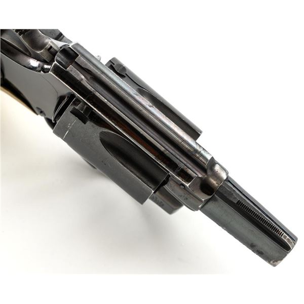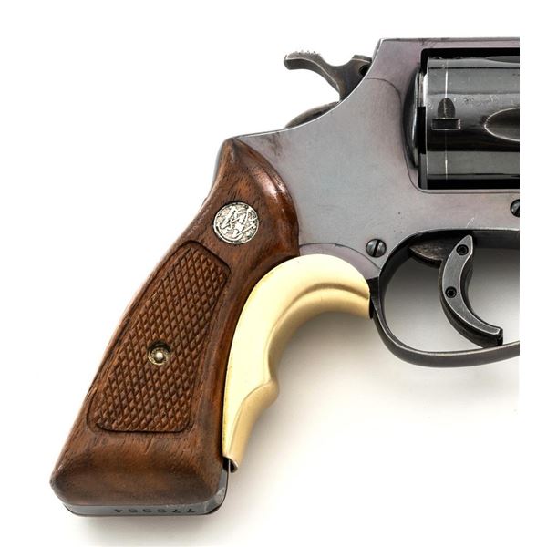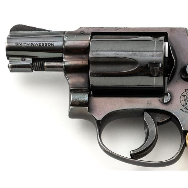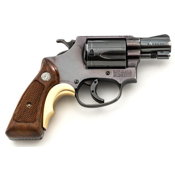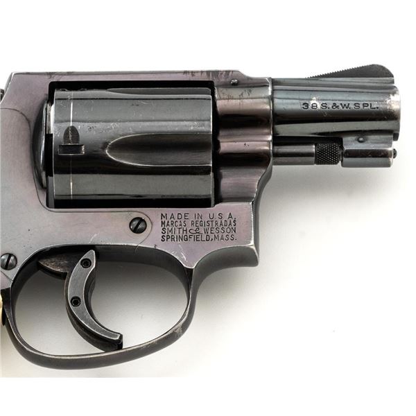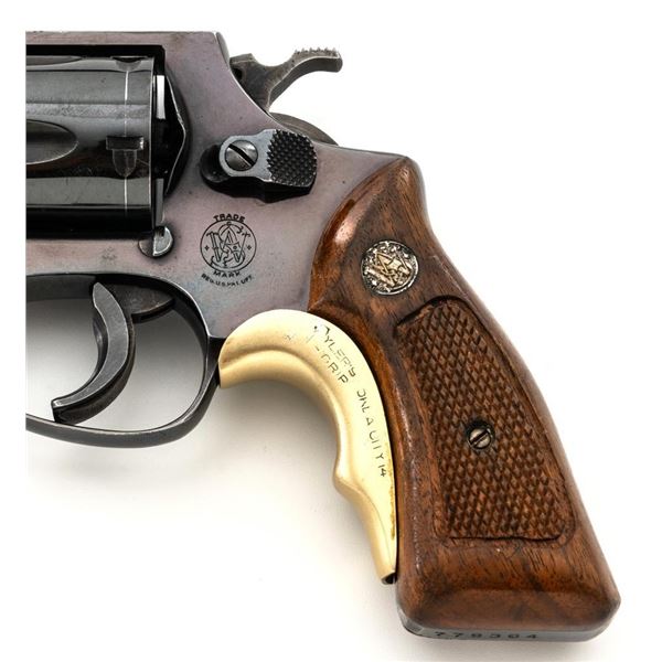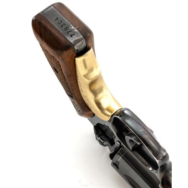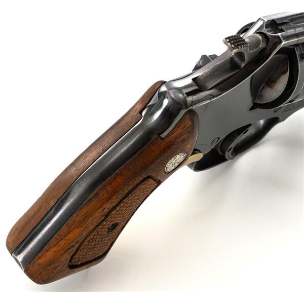 Smith & Wesson Model 36 Chiefs Special No Dash 5-Shot Revolver, #779304, .38 Spl cal., 1.9" pinned barrel, blue finish, checkered walnut two-piece grips with S&W medallions, added grip adapter, serrated blade front sight, fixed square-notch rear sight, color case hardened hammer and trigger, with added trigger shoe. Revolver is in near fine overall condition, retaining approx. 93%-94% factory blue, with holster wear at the muzzle and edges, with scattered light scratches and handling marks. Grips are in very good condition, with some flattening of the checkering, minor indentations, and verdi gris around the medallions. Interior of the right grip panel is stamped with the matching serial number. Action functions smoothly. Bore with well-defined rifling. Est.: $400-$600. (Modern/PPT)