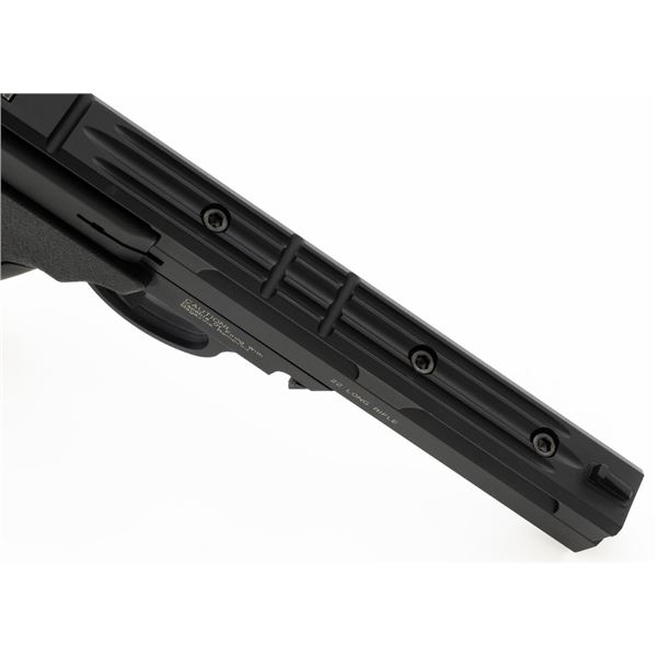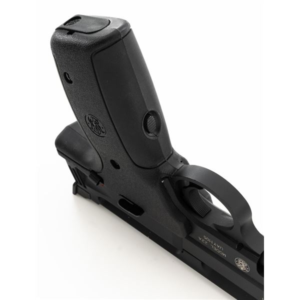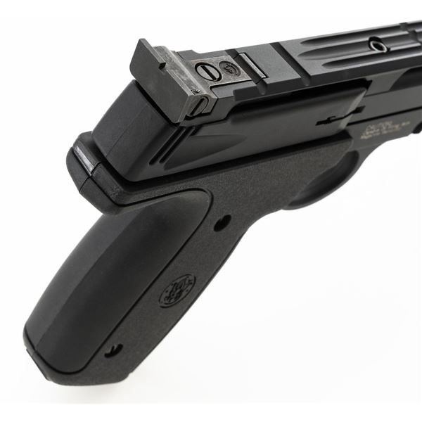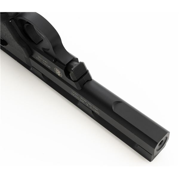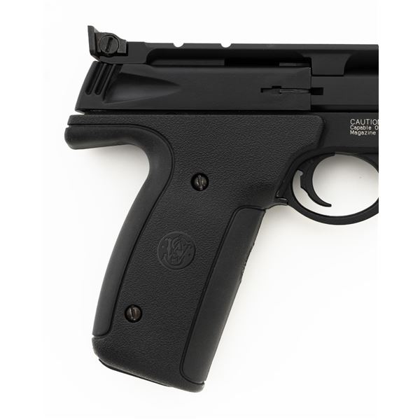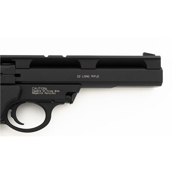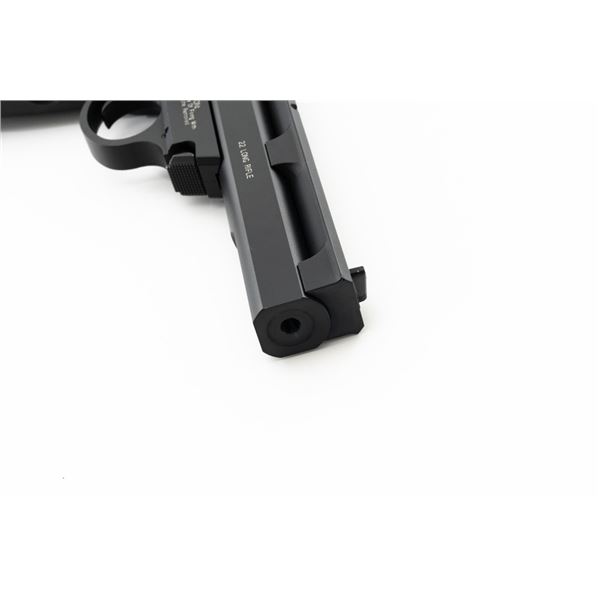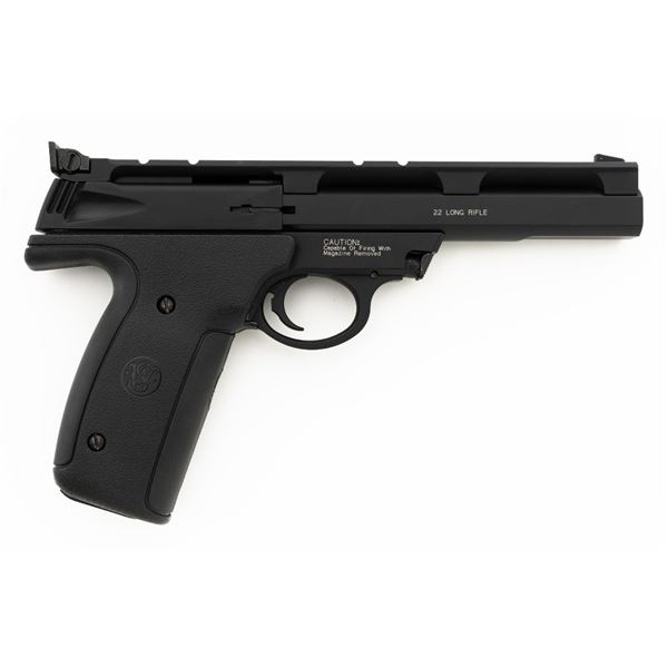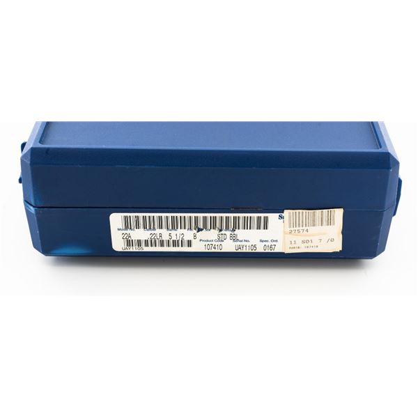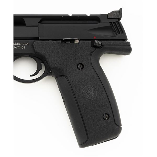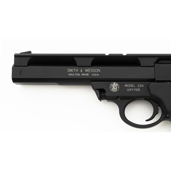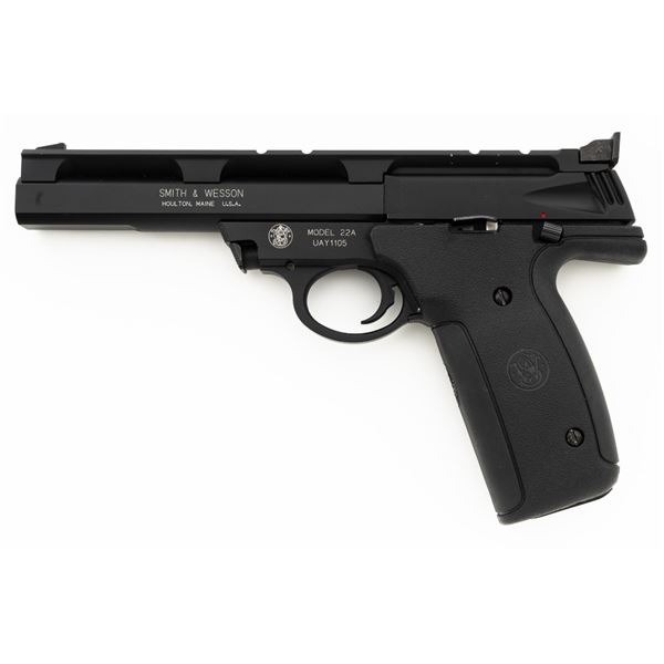 Smith & Wesson Model 22A Semi-Automatic Pistol, #UAY1105, .22 LR cal., 5.5" bull barrel, dark blue finish, black aluminum alloy frame, original two-piece black polymer grips. Pistol features a solid raised rib that is grooved for scope mounts, with integral blade front sight, adjustable square-notched rear sight, with two (2) factory 10-round magazines. In original blue plastic case with matching numbered end label and owner's manual. Condition is excellent, retaining approx.98% factory finish, with only minor handling marks. Grips show minimal wear. Action is smooth, bore is bright with excellent rifling. Est.: $200-$350. (Modern/PPT)