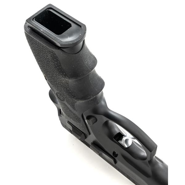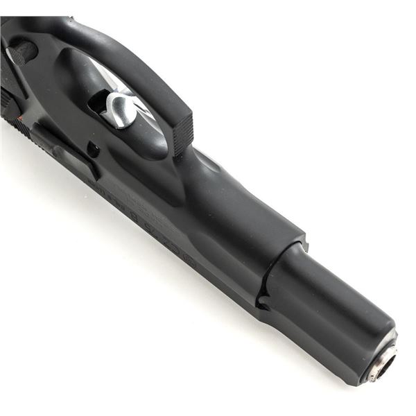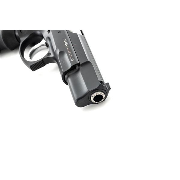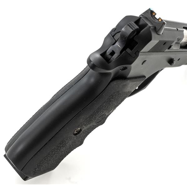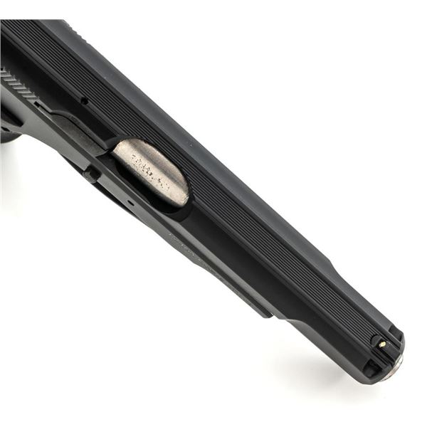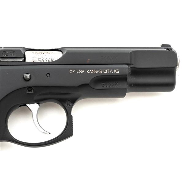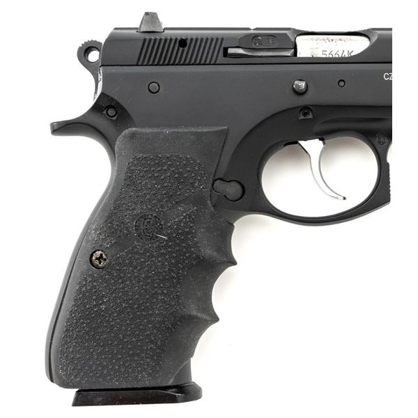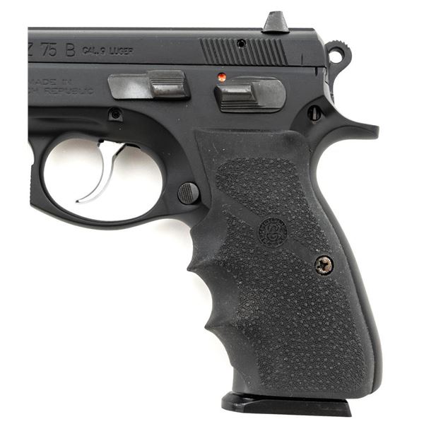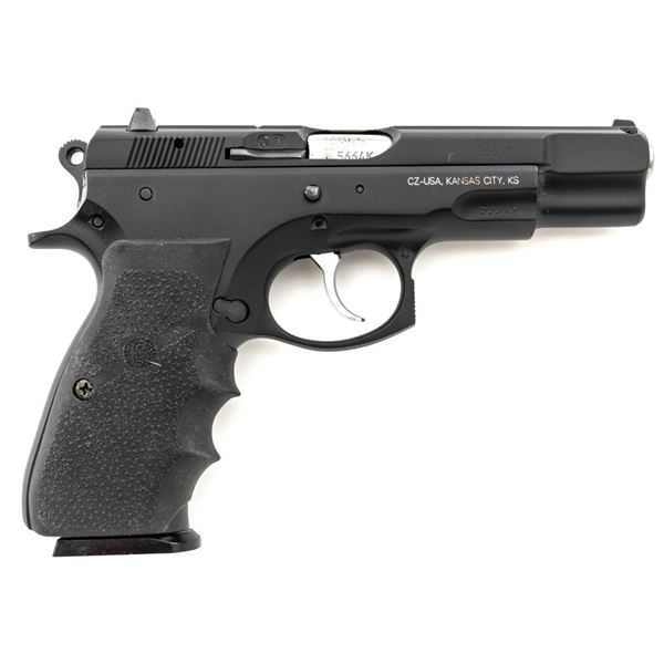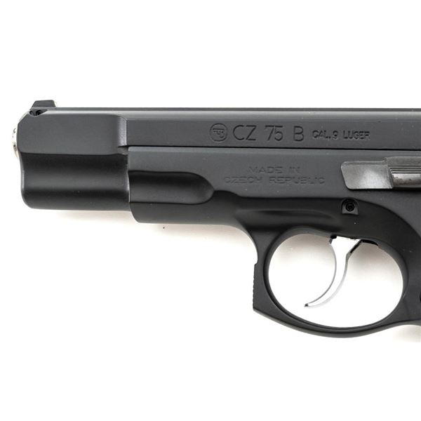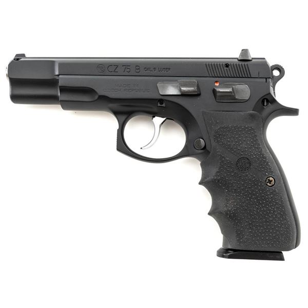CZ Model 75B Semi-Automatic Pistol, #5664K, 9mm cal., 4.6" barrel, black Polycoat finish, Houge black rubber finger groove grips, three-white dot sighting system, and includes two (2) unmarked 10-round blue steel magazines. In factory hard case with matching label, cleaning rod, and brush. Case label is oil stained. Mfg'd 1996. Pistol is in excellent condition with only minor handling marks, and retaining approx. 99% factory finish. Grips are excellent, screws have some light surface rust. Action operates smoothly. Bore is bright with excellent rifling. Est.: $500-$700. (Modern/PPT)