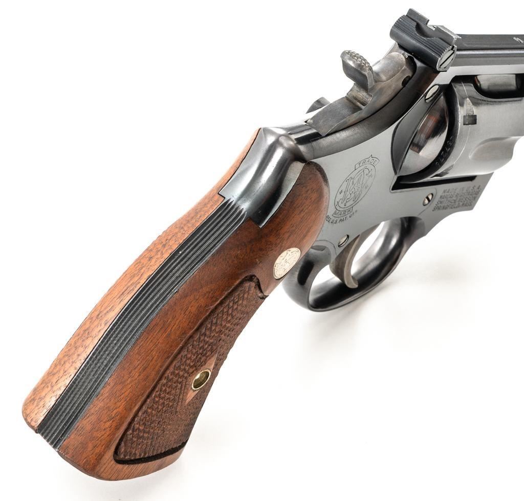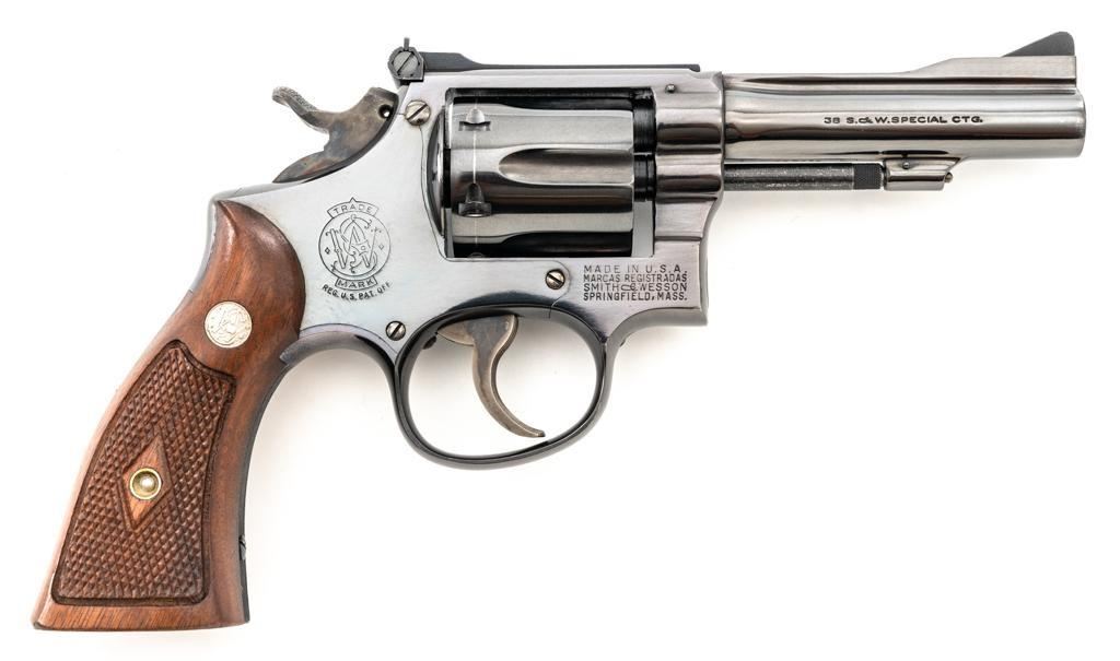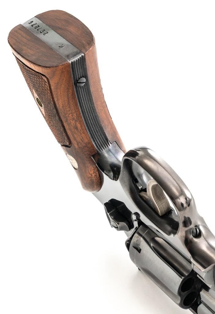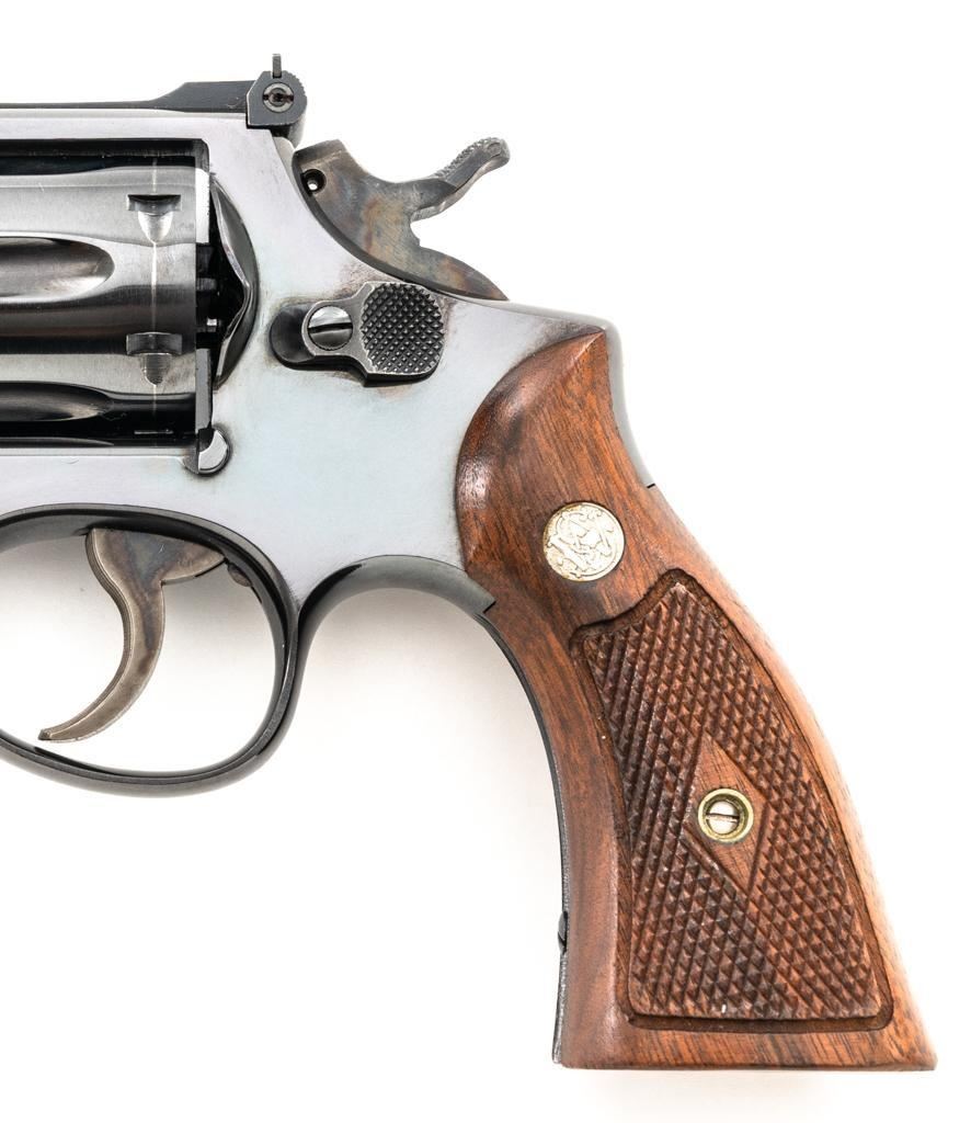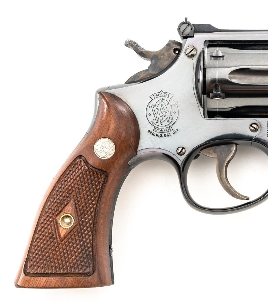 Smith & Wesson K-38 Combat Masterpiece (Pre-Model 15) Double Action Revolver, #K257276, .38 Spl. cal., 4" pinned barrel, bright blue finish, diamond center checkered walnut two-piece Magna grips with S&W medallions, Baughman ramped blade front sight, adjustable micrometer click square-notch rear sight, color case hardened hammer and factory ribbed trigger. All matching visible serial numbers. Mfgd 1956. Revolver is in excellent overall condition, retaining approx. 97%-98% factory finish, with light wear at the muzzle and minor handling marks. Leading edge of the cylinder shows minor wear and a faint index line at the rear. Factory markings are crisp. Grips are excellent with sharp checkering detail, matching serial number is stamped in the interior of the right panel. Action functions well and locks up securely. Bore is bright with well-defined rifling. Est.: $700-$900. (C&R)