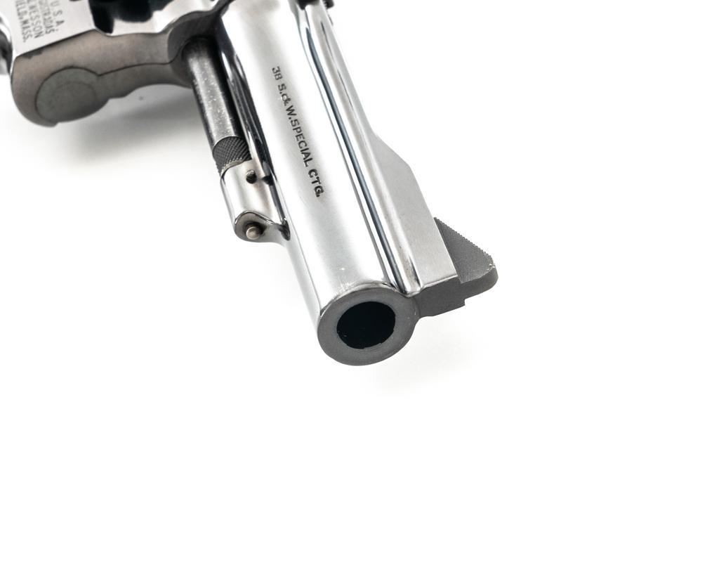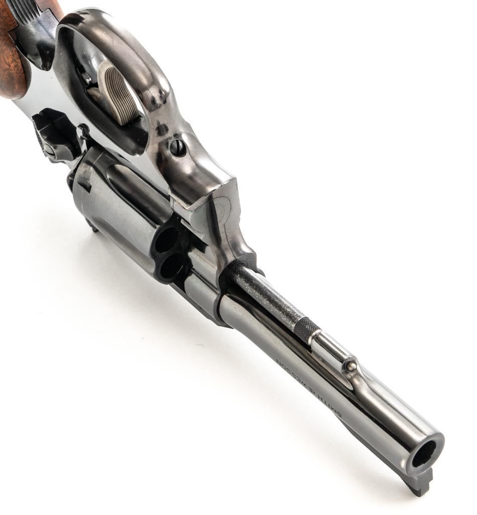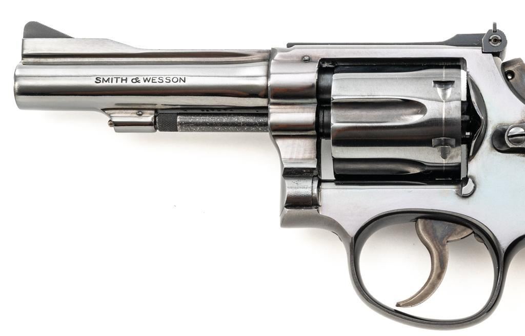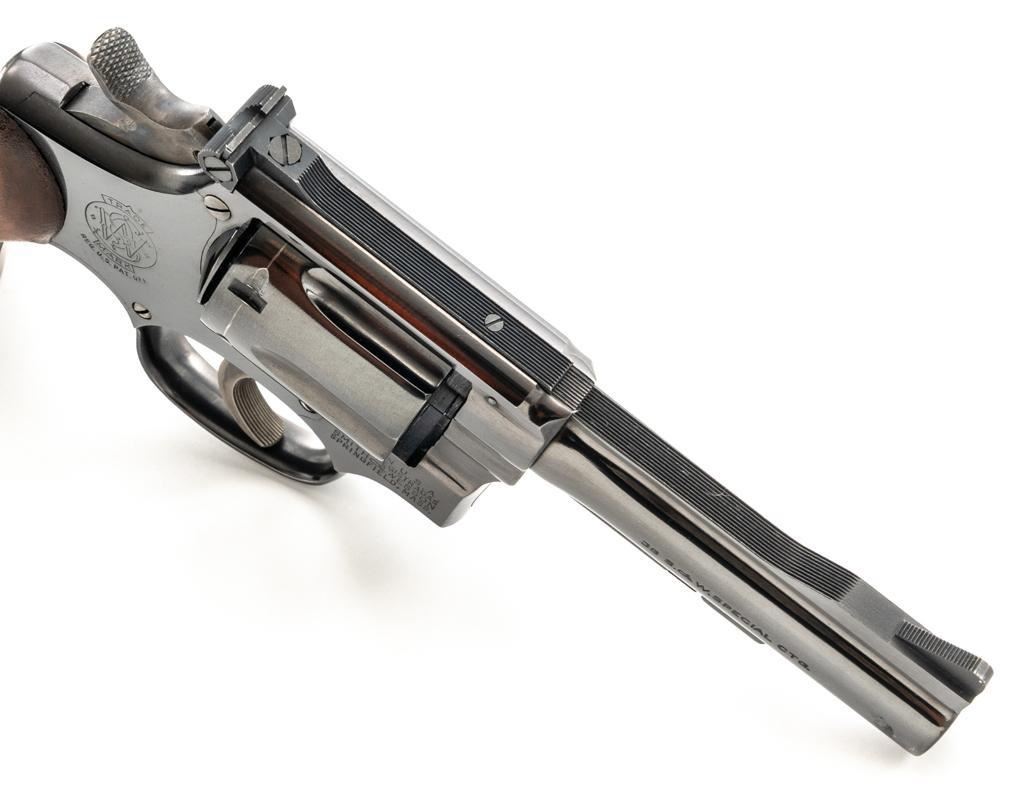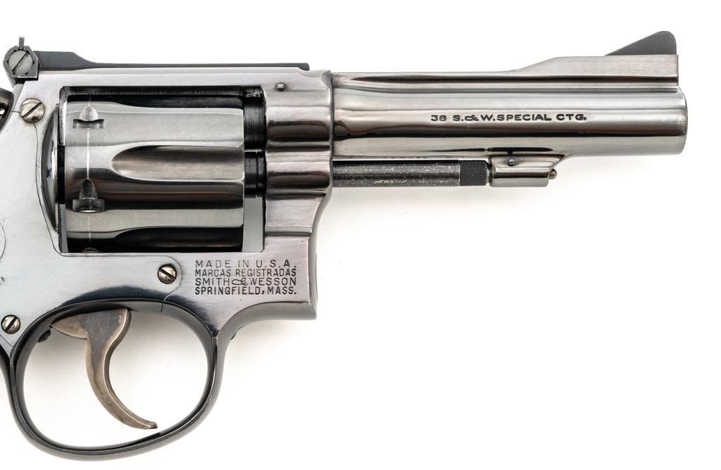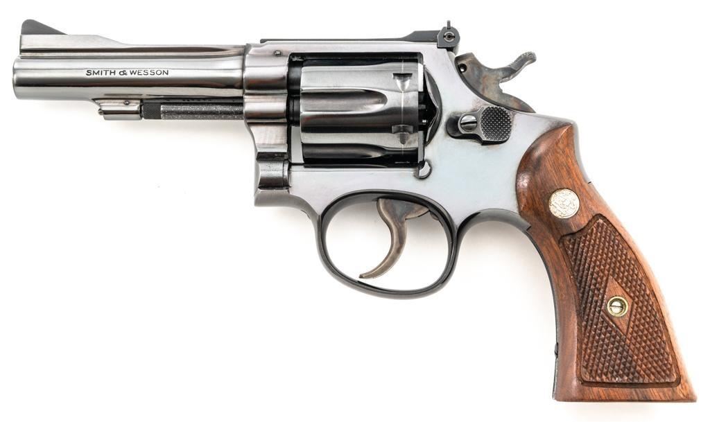 Smith & Wesson K-38 Combat Masterpiece (Pre-Model 15) Double Action Revolver, #K257276, .38 Spl. cal., 4" pinned barrel, bright blue finish, diamond center checkered walnut two-piece Magna grips with S&W medallions, Baughman ramped blade front sight, adjustable micrometer click square-notch rear sight, color case hardened hammer and factory ribbed trigger. All matching visible serial numbers. Mfgd 1956. Revolver is in excellent overall condition, retaining approx. 97%-98% factory finish, with light wear at the muzzle and minor handling marks. Leading edge of the cylinder shows minor wear and a faint index line at the rear. Factory markings are crisp. Grips are excellent with sharp checkering detail, matching serial number is stamped in the interior of the right panel. Action functions well and locks up securely. Bore is bright with well-defined rifling. Est.: $700-$900. (C&R)