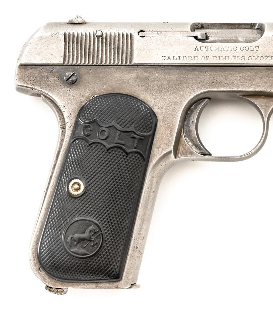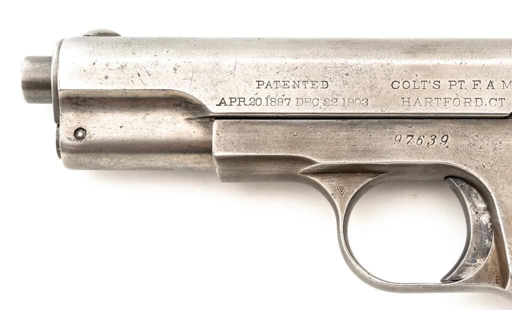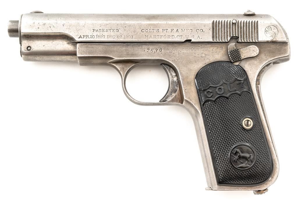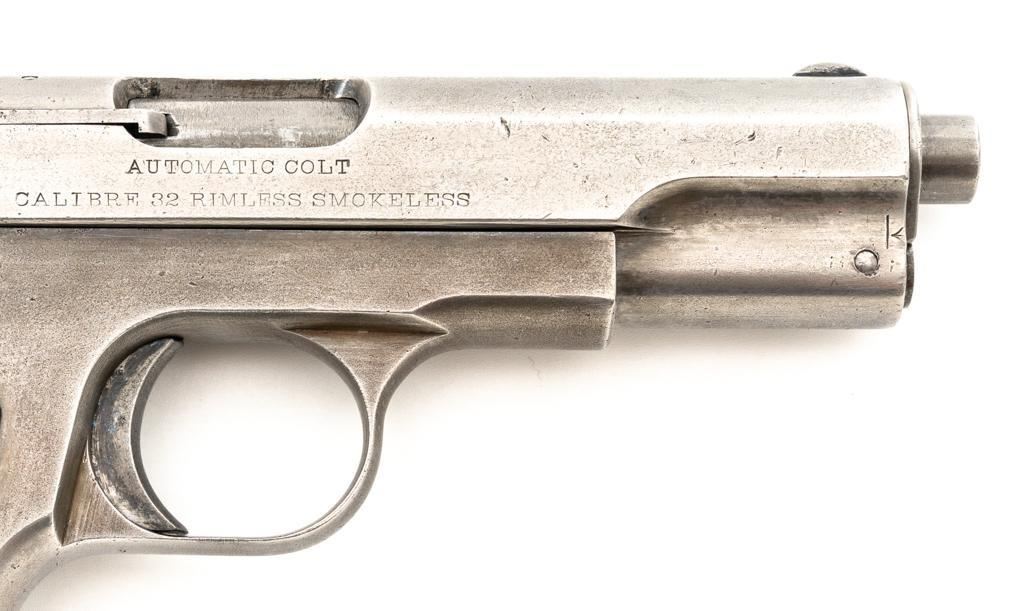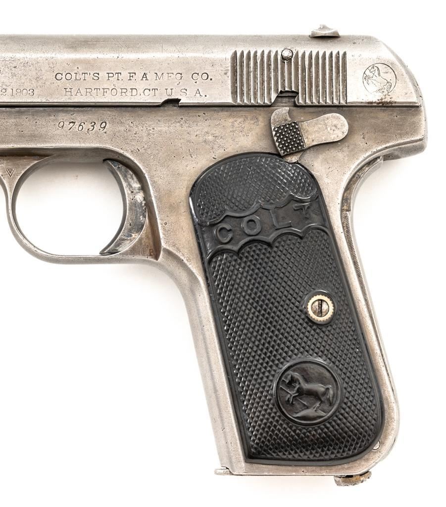 Colt Model 1903 Pocket Hammerless Type II Semi-Automatic Pistol, #97639, .32 ACP cal., 4" barrel, no finish, factory early style checkered two-piece hard rubber grips, half-moon blade front sight, and "U"-notched rear sight. Standard markings for this model are correct. Includes one unmarked blued steel magazine. Mfgd 1910. Pistol is fair to good overall, no finish remains, now an even gray color across the metal surfaces, mixed with areas of mild patina. Factory marking are clear. Grips are very good, showing moderate age and handling wear, no chips, or cracks. Action is crisp and functions properly. Bore is fair to good, with visible rifling, and scattered areas of light erosion. Est.: $300-$400. (C&R/PPT)