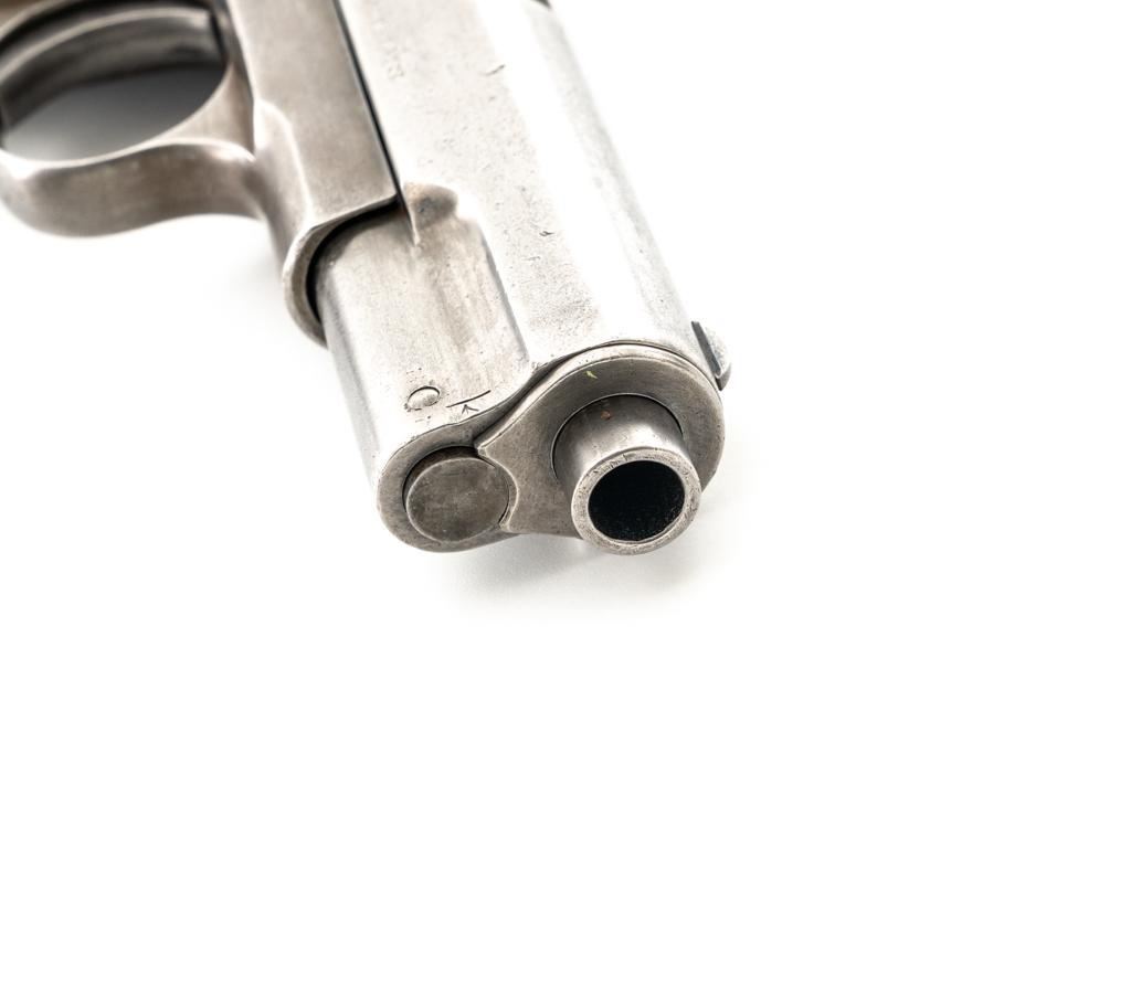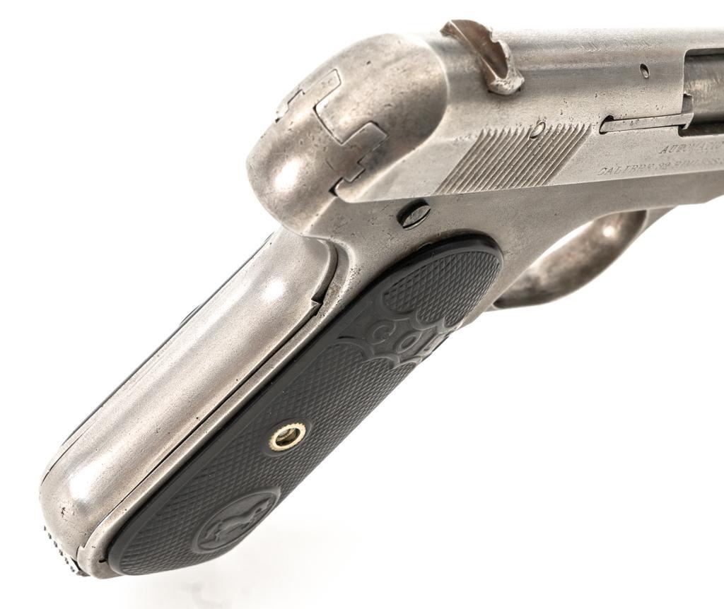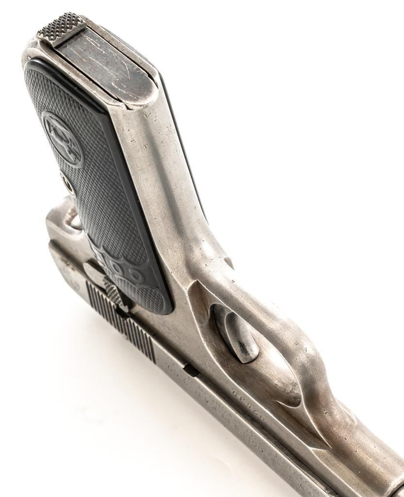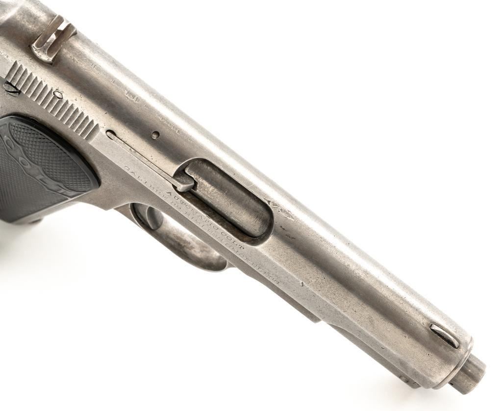 Colt Model 1903 Pocket Hammerless Type II Semi-Automatic Pistol, #97639, .32 ACP cal., 4" barrel, no finish, factory early style checkered two-piece hard rubber grips, half-moon blade front sight, and "U"-notched rear sight. Standard markings for this model are correct. Includes one unmarked blued steel magazine. Mfgd 1910. Pistol is fair to good overall, no finish remains, now an even gray color across the metal surfaces, mixed with areas of mild patina. Factory marking are clear. Grips are very good, showing moderate age and handling wear, no chips, or cracks. Action is crisp and functions properly. Bore is fair to good, with visible rifling, and scattered areas of light erosion. Est.: $300-$400. (C&R/PPT)