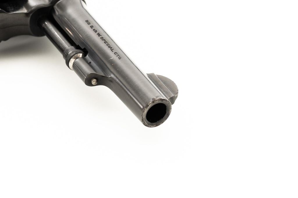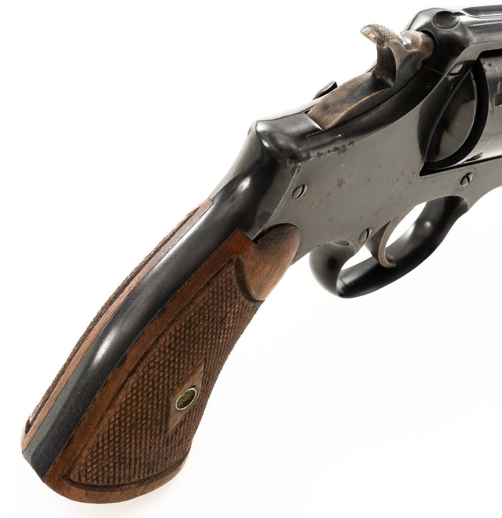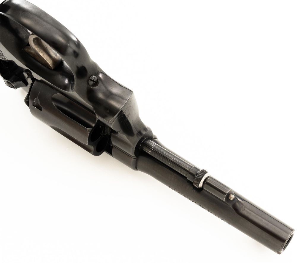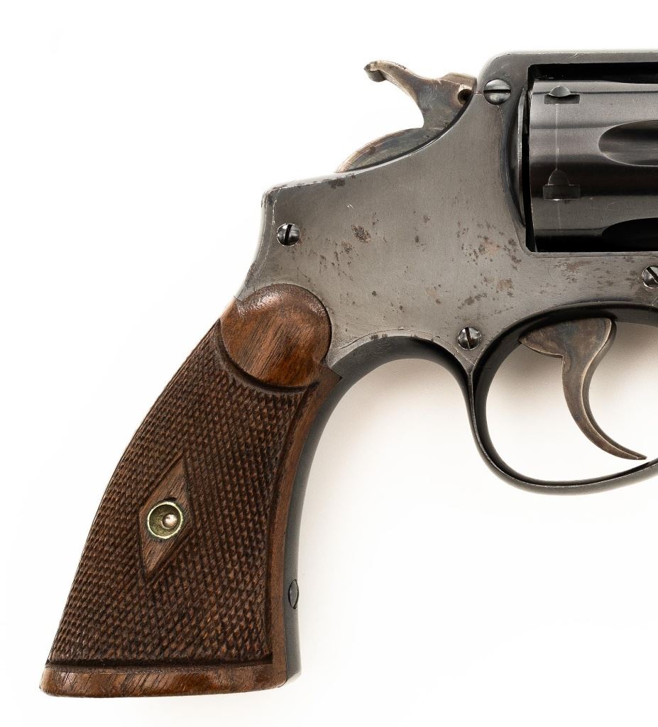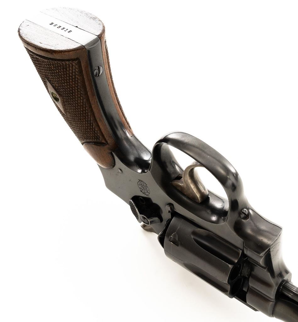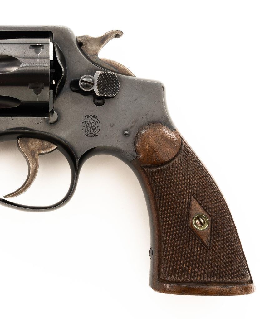 Smith & Wesson Model of 1905 Military & Police (4th Change) Double Action Revolver, #363518, .38 Spl. cal., 4" pinned barrel, blue finish, checkered walnut diamond center two-piece grips, color case hardened hammer and trigger, blade front sight, and fixed square-notch rear sight. Mfgd circa early 1920s. Revolver is in near fine overall condition, retaining approx. 93%-94% flaking factory finish, with minor marks along the barrel, and edgewear. Frame shows flaking finish, worse on the right side, with areas of surface erosion. Hammer and trigger show muted color case hardening. Grips with sharp checkering detail, light indentations at the base, and the matching serial number written on the interior of the right panel. Action functions well and locks up securely. Bore is very good with some light frosting, and clear rifling. Est.: $300-$500. (C&R)