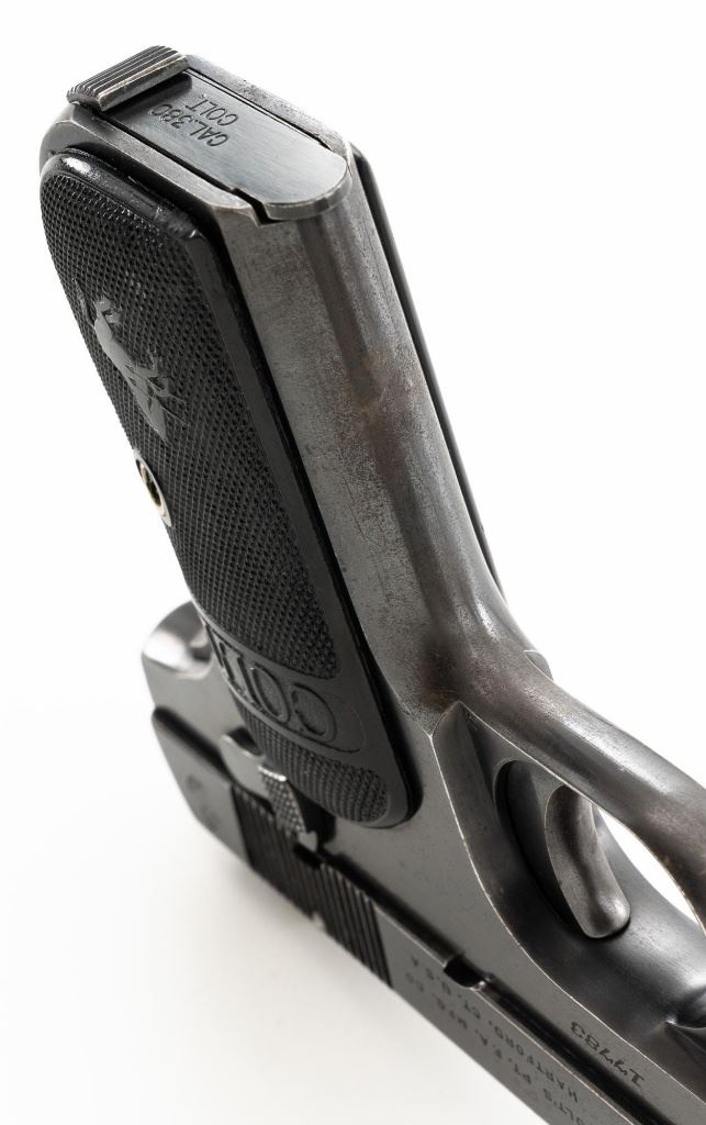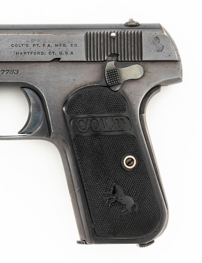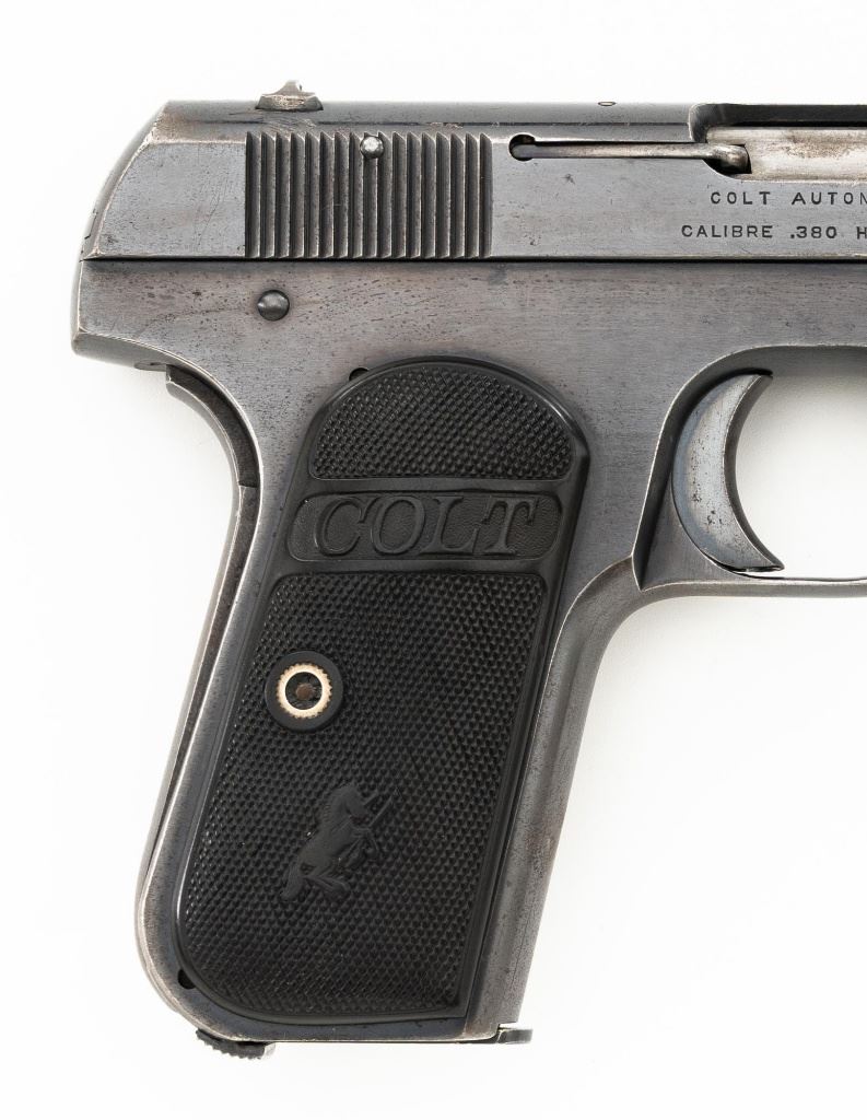 Colt Model 1908 Type III Pocket Hammerless Semi-Automatic Pistol, #17783, .380 ACP cal., 3.75" barrel, blued finish, checkered hard rubber Colt grips, modified blade front sight, rear sight with small "U"-notched groove. Standard markings for this model are correct. Includes one blue steel magazine, base is marked "CAL. 380/COLT". Mfgd 1914. Pistol is in fine overall condition, retaining approx. 90% original blue, with moderate edgewear, wear and frosting to front and backstrap. Factory markings are clear. Grips shows light handling wear. Front sight has been modified to a target style shape. Action is crisp. Bore is good, with light frosting, and defined rifling. Est.: $700-$900. (C&R/PPT)