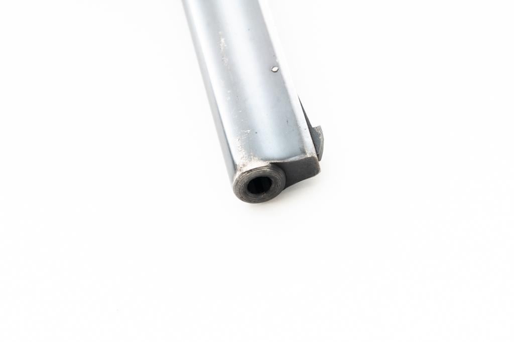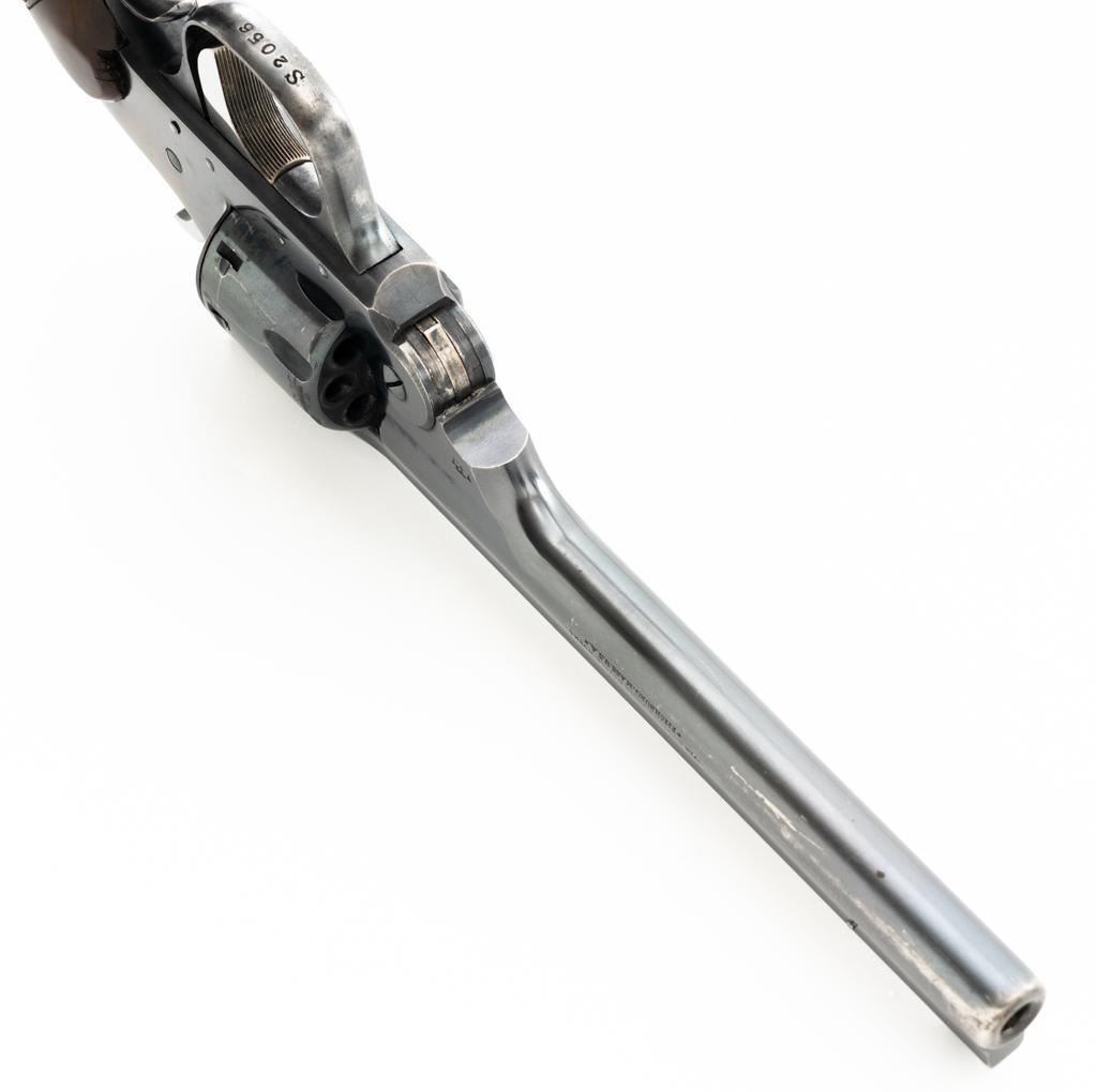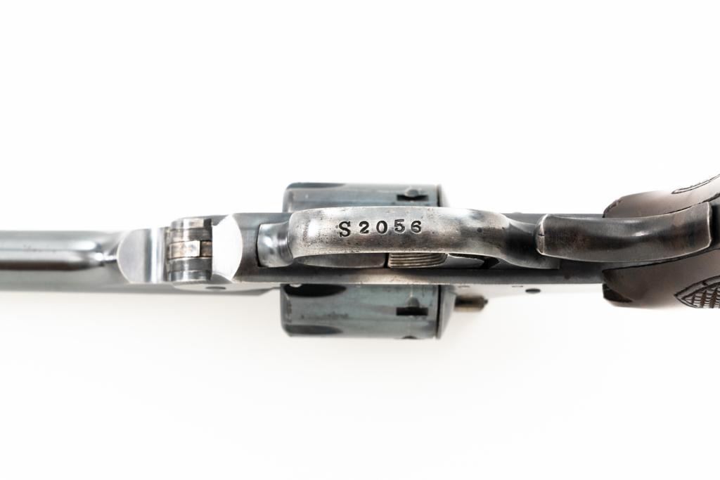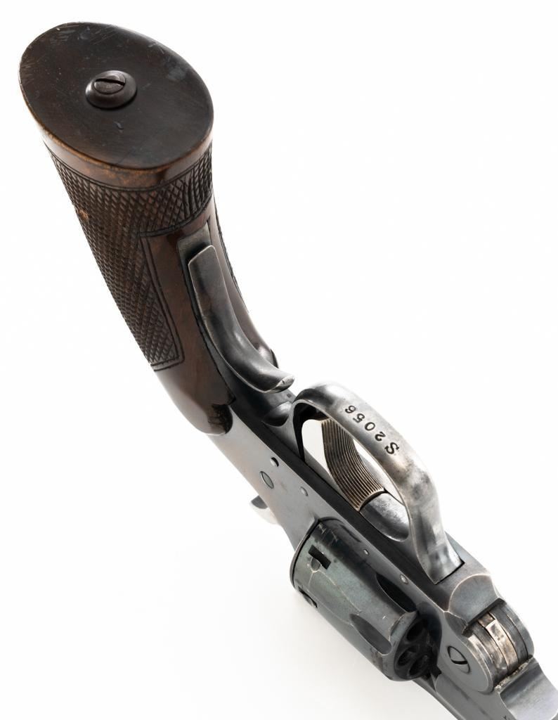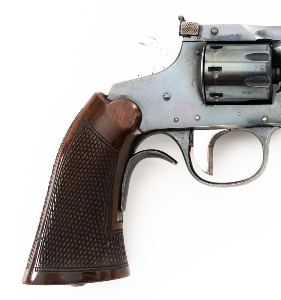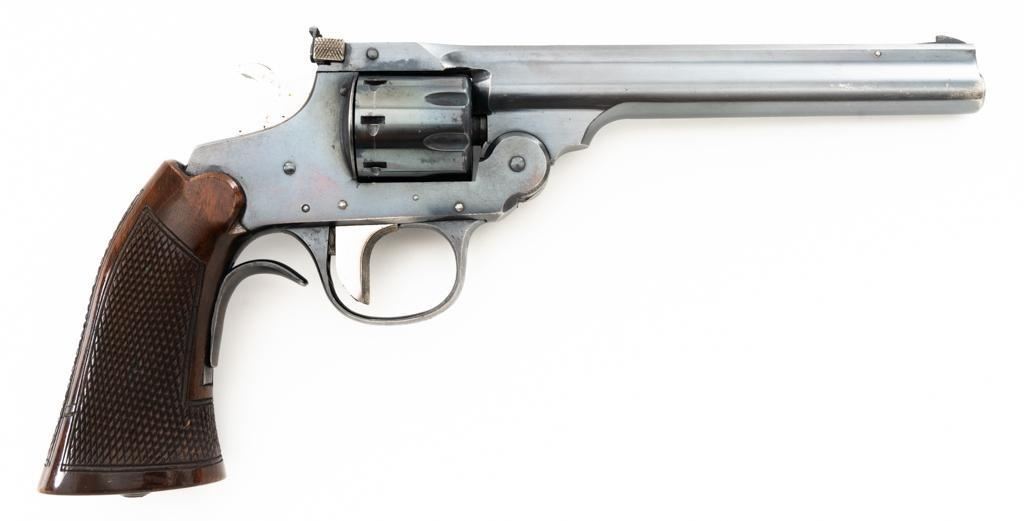 Iver Johnson Champion Model 822 8-Shot Single Action Top-Break Target Revolver, #S2056, .22 LR cal., 6" ribbed barrel, blue finish, checkered hardwood oversize one-piece grip with blue steel finger rest, adjustable blade front and adjustable square-notch rear sights, polished bright hammer and trigger. Mfgd circa 1939-1947. Revolver is in near fine overall condition, retaining approx. 85%-90% thinning finish, scratches and loss of finish along the barrel, particularly on the underside. Cylinder shows leading edgewear. Rear of the frame is drifting to plum with age. Hammer and trigger have been polished to bright white on the sides. Grips are in very good condition, with smoothing of the checkering, mars, and a larger indentation on the left side. Action functions well and locks up securely. Bore is very good with well-defined rifling. Est.: $200-$400. (C&R/PPT)