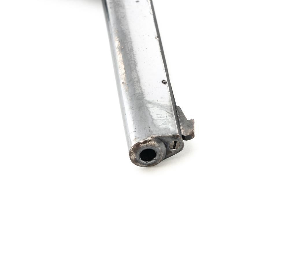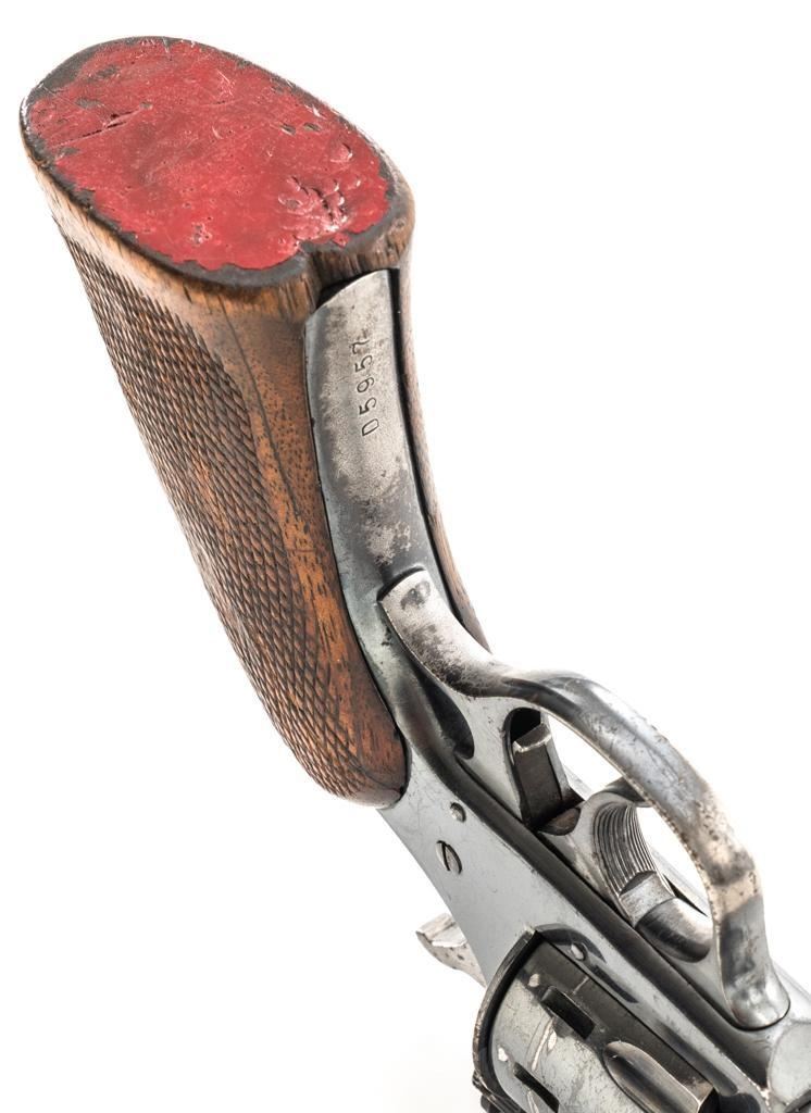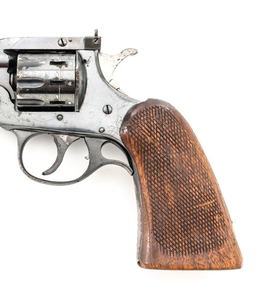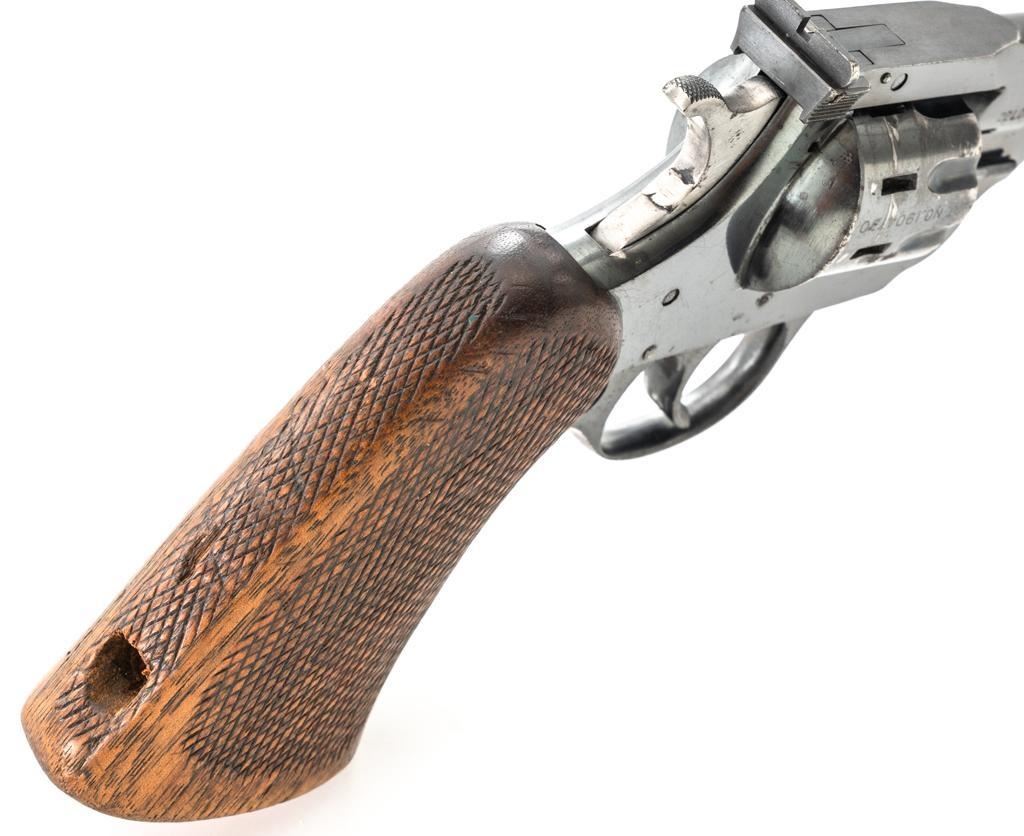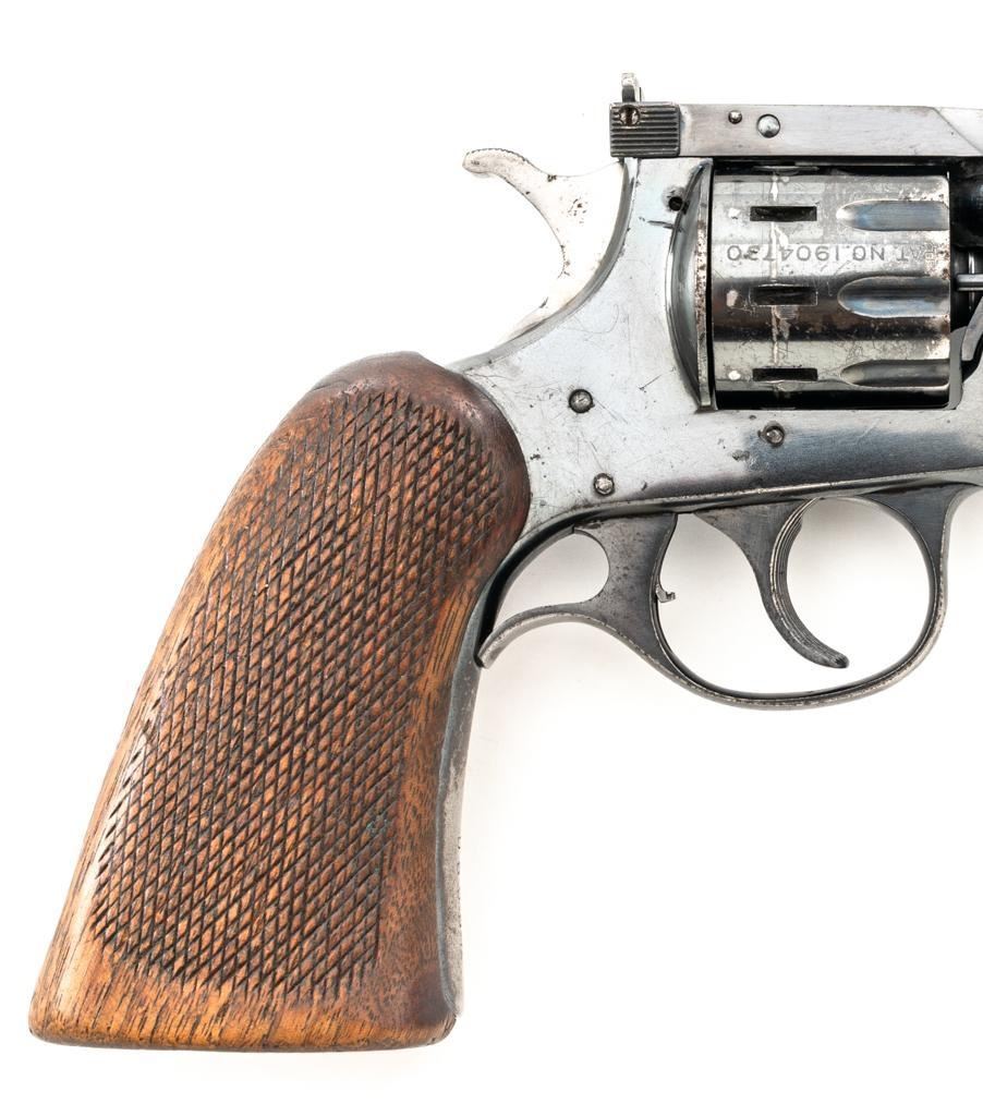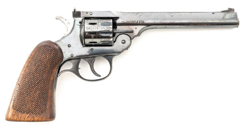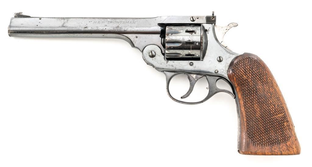 Early H&R Model 999 Sportsman 1st Model Double Action Top-Break Revolver, #D5957, .22 LR cal., 9-shot fluted cylinder, 6" round barrel with full-length rib, blue finish, checkered walnut oversize one-piece grip, pinned Patridge front sight, adjustable square-notch rear sight, finger rest trigger guard, with frame mounted firing pin. Mfgd circa 1932-33. Revolver is in near fine overall condition, retaining approx. 92%-93% factory blue, with some edgewear, scattered scratches, marks from handling and use. There is also some light corrosion around edge of the recoil shield. Grips are in good condition, with smoothing of the checkering, indentations, and the base painted red. Action functions smoothly and locks up securely. Bore is very good with clearly defined rifling. Early production models used the "D" prefix until 1933 to denote double action. Est.: $250-$400. (C&R)