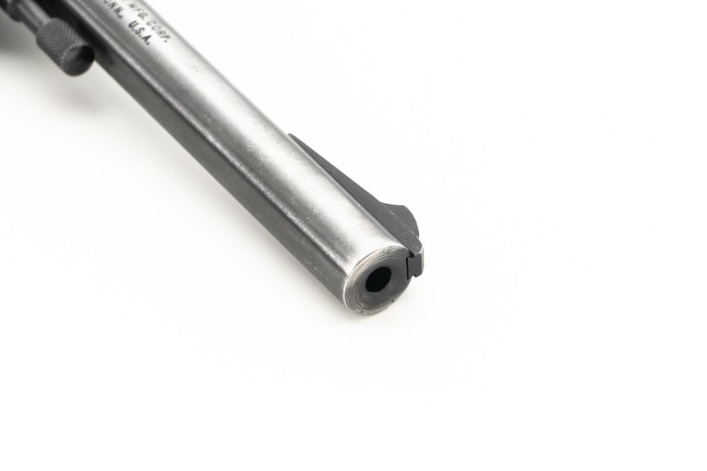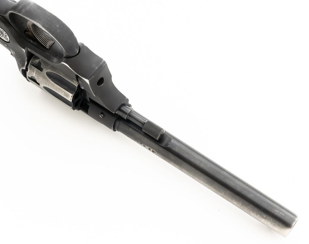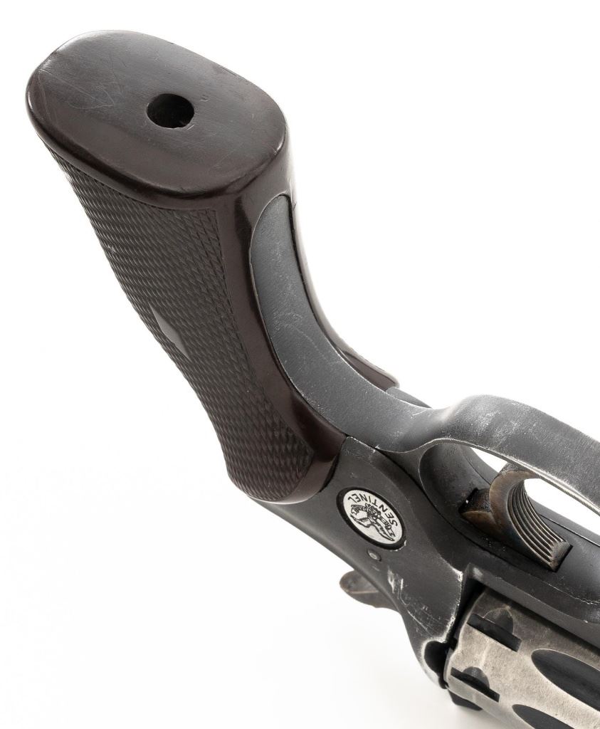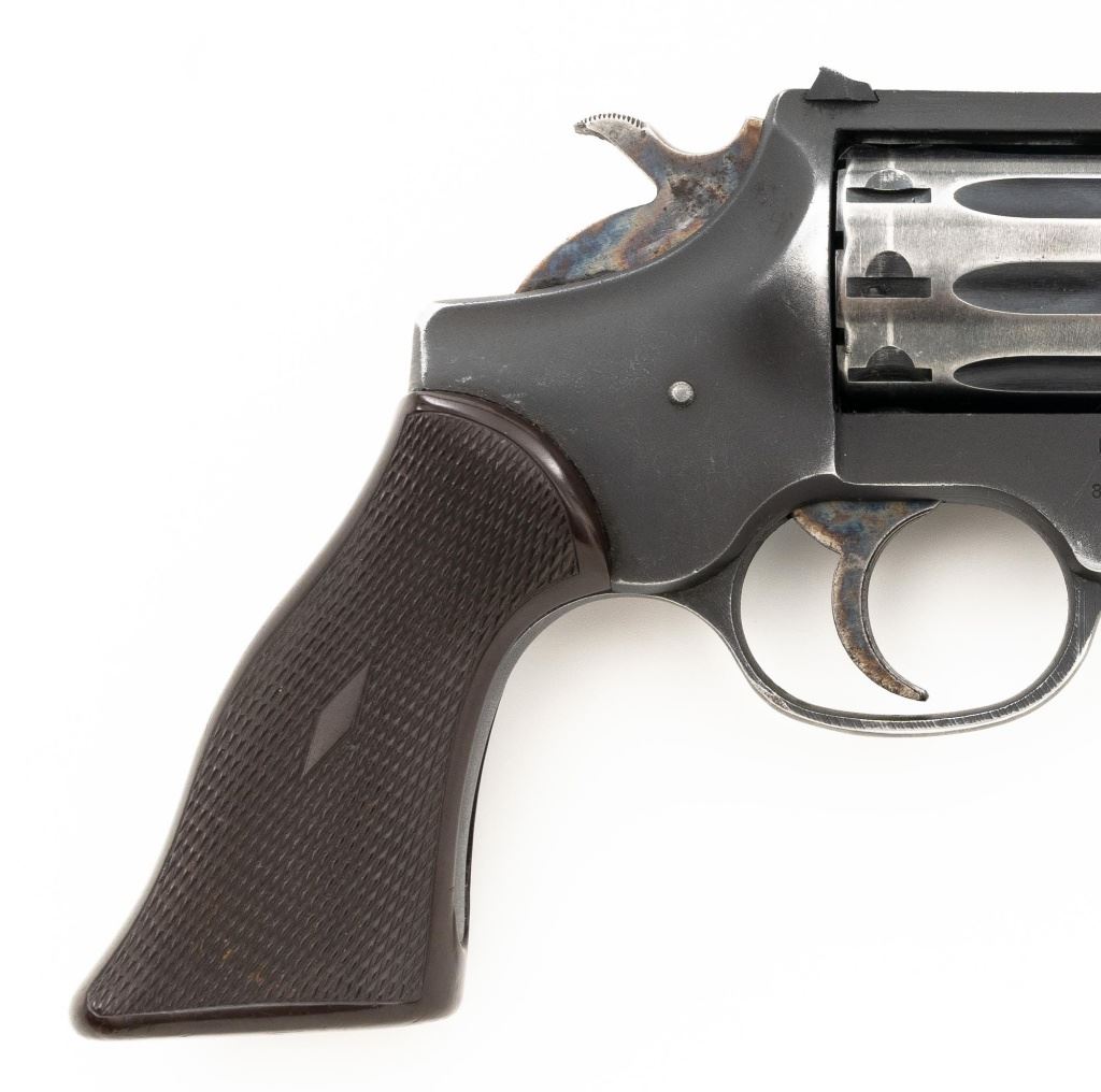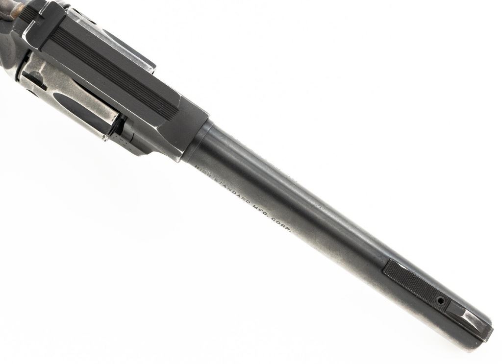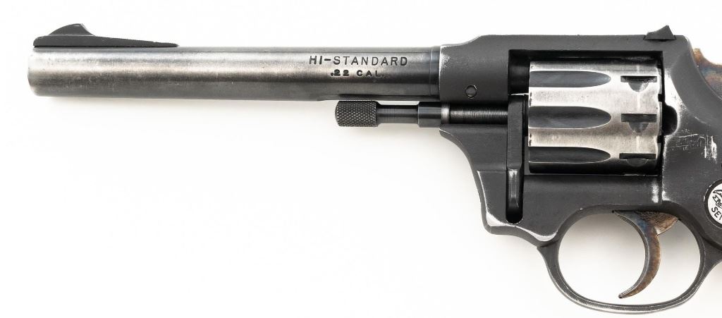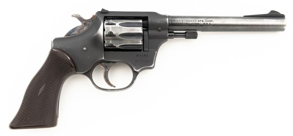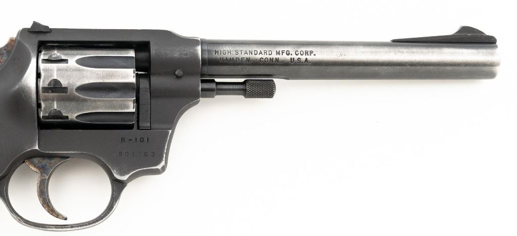High Standard Sentinel R-101 9-Shot Double Action Revolver, #801363, .22 S-L- LR cal., 6" barrel, blue finish, aluminum alloy frame, checkered Bakelite High Standard grips, ramped blade front sight, and fixed square-notch rear sight. Mfgd 1967. Revolver is in very good overall condition, retaining approx. 80%-85% thinning factory finish, showing general thinning and wear. Grips show a little smoothing to the checkering detail. Action functions intermittently and needs repair/adjustment. Bore is very good, showing some minor frosting and erosion, with clearly defined rifling. Est.: $200-$300. (C&R/PPT)
