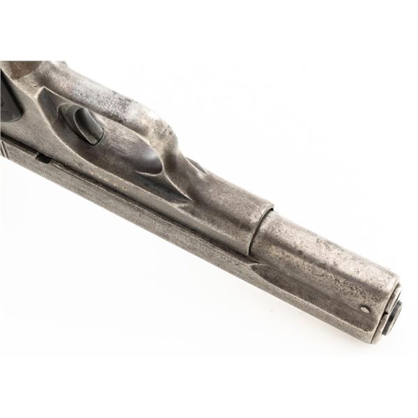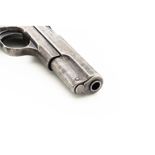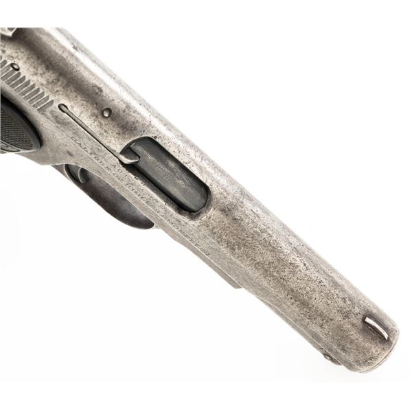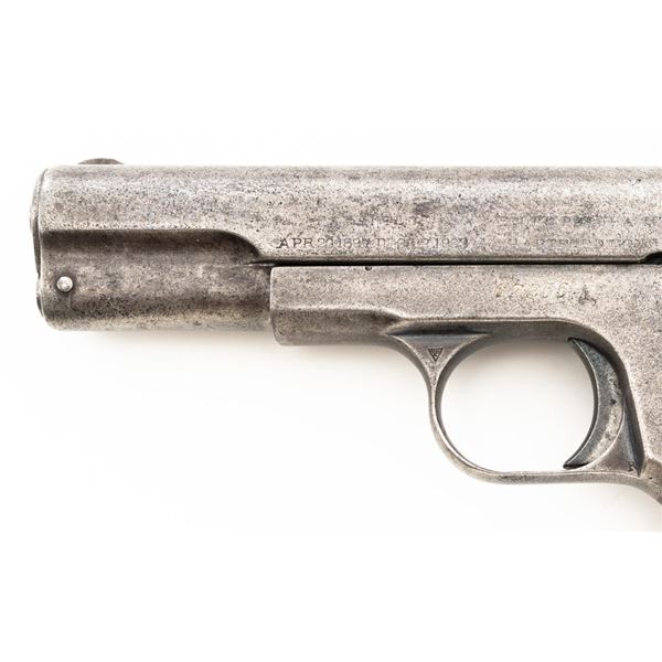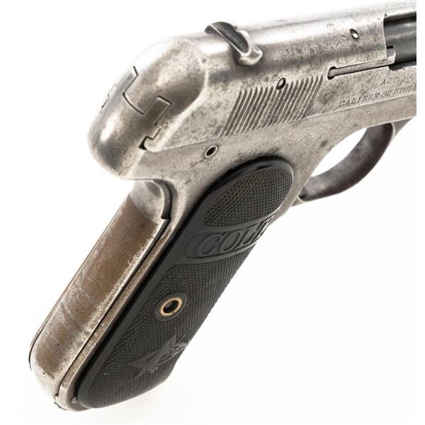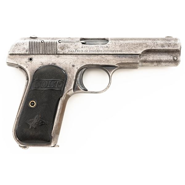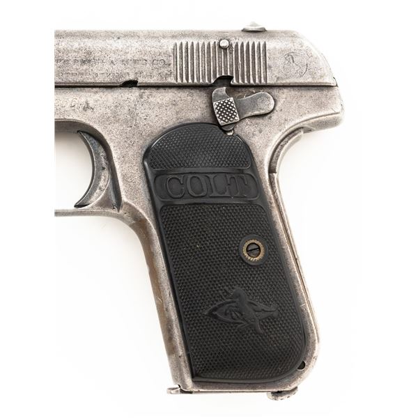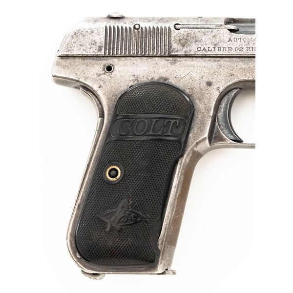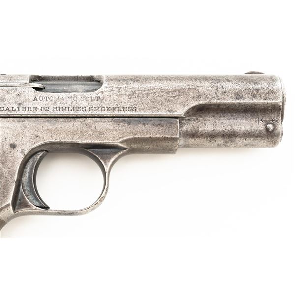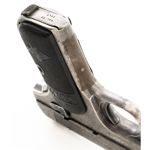 Colt Model 1903 Type I Pocket Hammerless Semi-Automatic Pistol, #67255, .32 ACP cal., 4" barrel with bushing, blue finish, fire blued trigger and safety, checkered hard rubber two-piece Colt grips, blade front sight, and fixed "U"-notch rear sight, with one 7-round blue steel magazine. Magazine base is marked "CAL. 32 / COLT". Mfgd 1907. Pistol is in good overall condition, with the metal surfaces having gone to an even gray patina, with areas of light erosion and fine pinprick pitting. Frame with traces of original blue finish in the protected areas, with some light rust on the front and backstrap. Trigger and safety display traces of original fire blued finish in the protected areas. Grips are in fair condition with smoothing of the checkering and a 1.75" vertical chip missing at the front of the right panel. Action functions well. Bore is good, with moderate frosting in grooves, and clearly defined rifling. Est.: $300-$400. (C&R/PPT)