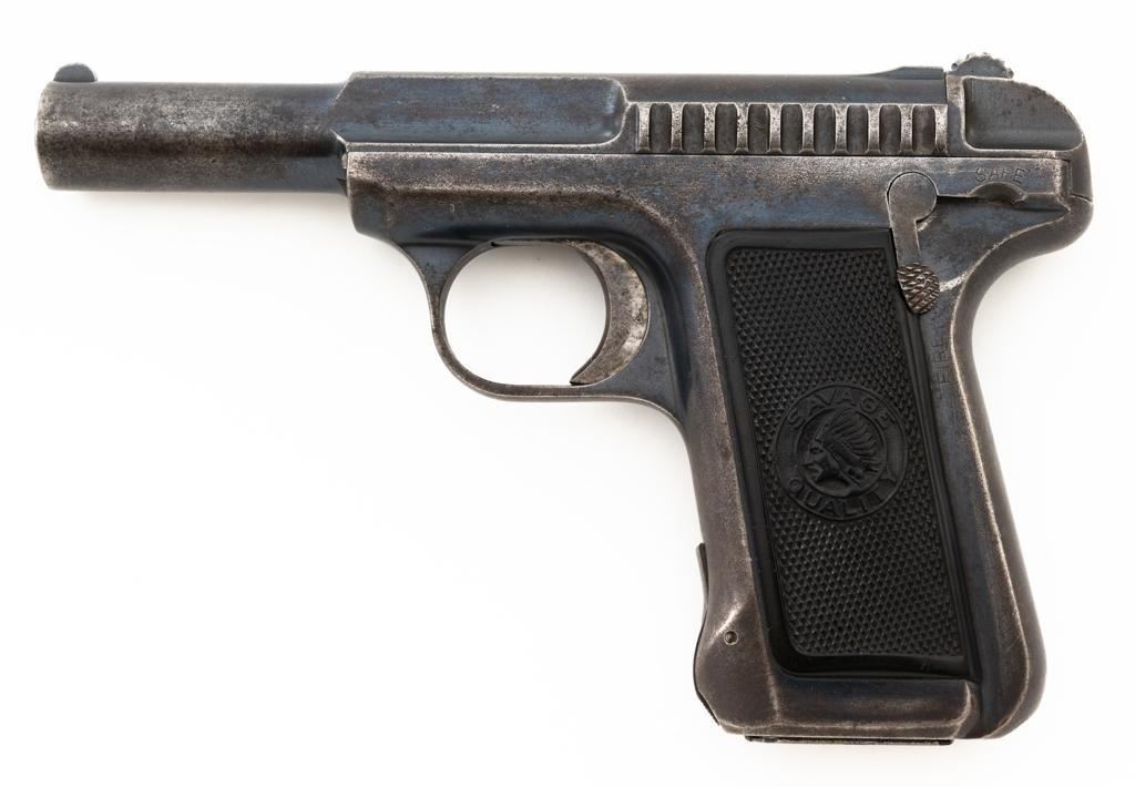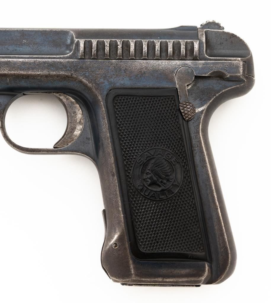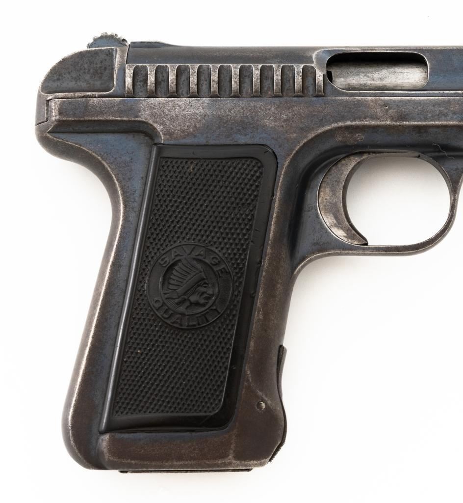 Savage Model 1907 Semi-Automatic Pistol, #182734, .32 ACP cal., 3.75" barrel, blue finish, checkered two-piece hard rubber "Savage Quality" marked grips, blade front sight, fixed "U"-notch rear sight, color case hardened trigger and magazine release, with one 10-round unmarked blue steel magazine. Mfgd 1917. Pistol is in very good overall condition, retaining approx. 60%-65% thinning factory finish, with areas of thinning and wear, and scattered mild surface erosion. Factory markings are clear. Grips are in fine condition, with areas of smoothing and minor marks, displaying sharp "SAVAGE QUALITY" logos with a crisp brave figure. Action functions well. Bore is bright with well-defined rifling. Est.: $250-$400. (C&R/PPT)