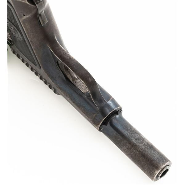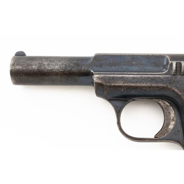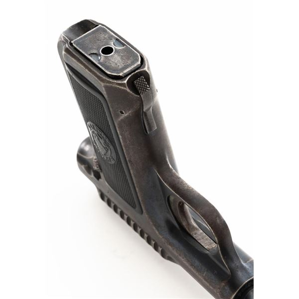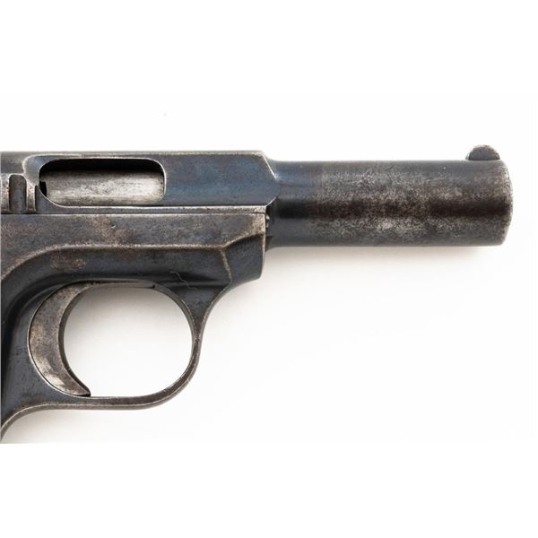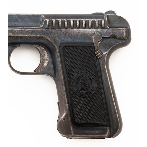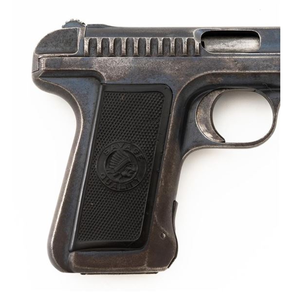 Savage Model 1907 Semi-Automatic Pistol, #182734, .32 ACP cal., 3.75" barrel, blue finish, checkered two-piece hard rubber "Savage Quality" marked grips, blade front sight, fixed "U"-notch rear sight, color case hardened trigger and magazine release, with one 10-round unmarked blue steel magazine. Mfgd 1917. Pistol is in very good overall condition, retaining approx. 60%-65% thinning factory finish, with areas of thinning and wear, and scattered mild surface erosion. Factory markings are clear. Grips are in fine condition, with areas of smoothing and minor marks, displaying sharp "SAVAGE QUALITY" logos with a crisp brave figure. Action functions well. Bore is bright with well-defined rifling. Est.: $250-$400. (C&R/PPT)
