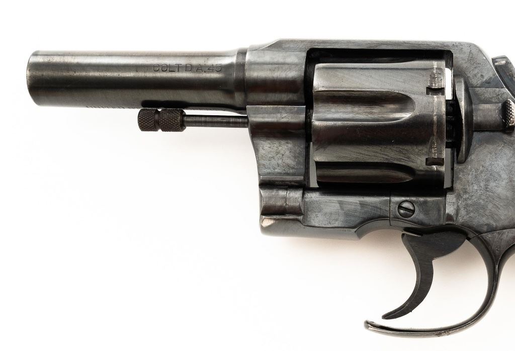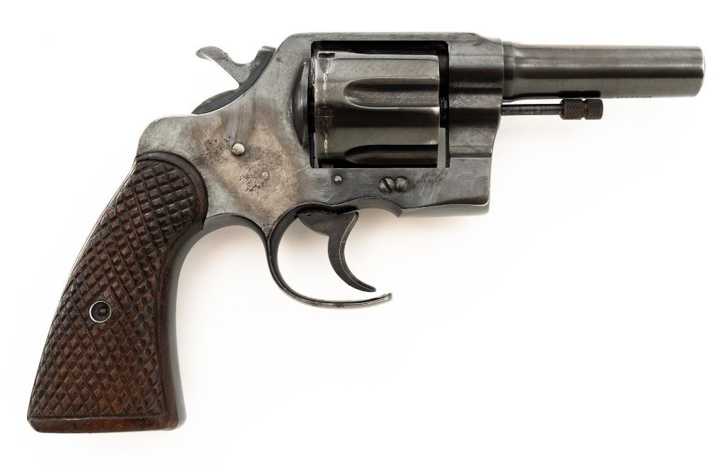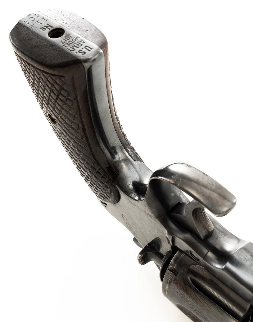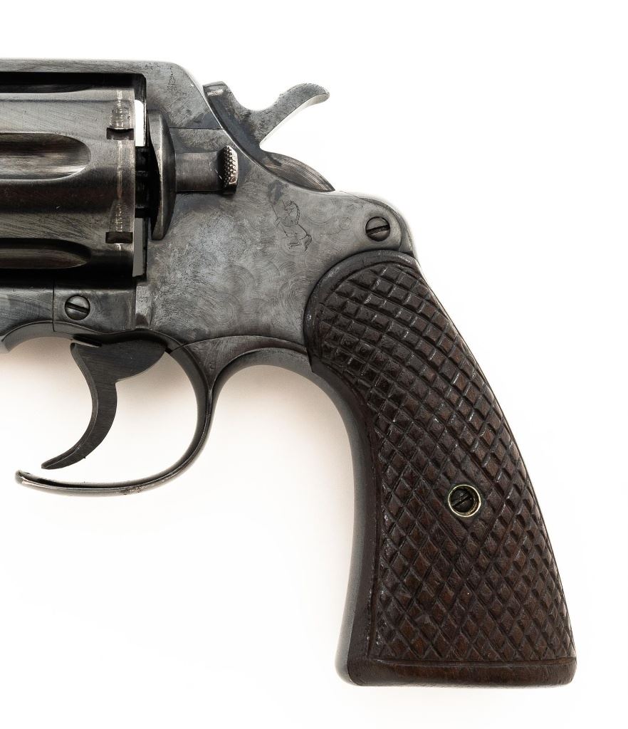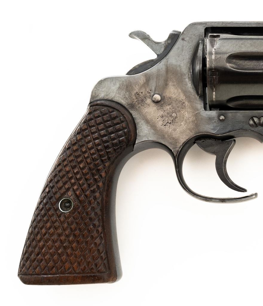 Custom Colt New Service Model 1917 Army Double Action Revolver, #262776, .45 ACP cal., 3.75" shortened barrel, blue finish, hand checkered walnut two-piece grips, missing lanyard ring, front sight removed, fixed "U"-notch rear sight, "Fitz Special" style cut trigger guard, with polished engine turned finish on frame. "(Rampant Colt)" still visible at the left rear of the frame. Barrel address is nearly polished out. Mfgd 1920. Revolver is in very good condition as customized and refinished, retaining approx. 85%-90% reblued finish. Frame has been engine turned with light pitting on the right side and some signs of aggressive cleaning. Hand checkered grips are in fine condition and appear to be original to the revolver with the matching serial number written in pencil on the interior of both panels. Action functions well and locks up securely. Bore is good with moderate erosion and frosting, displaying defined rifling. Est.: $600-$800. (C&R/PPT)