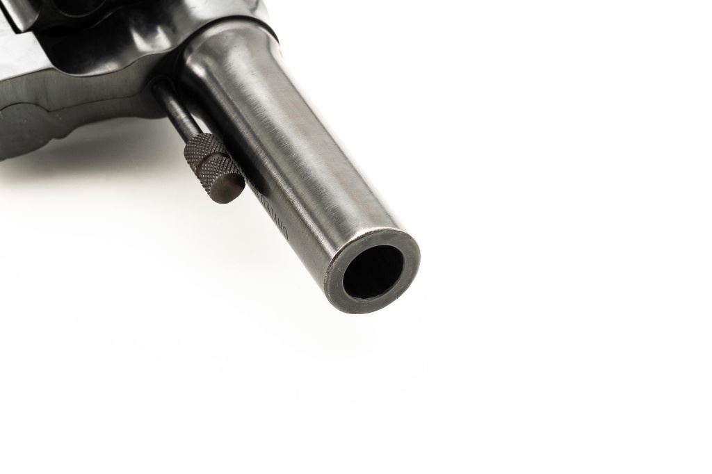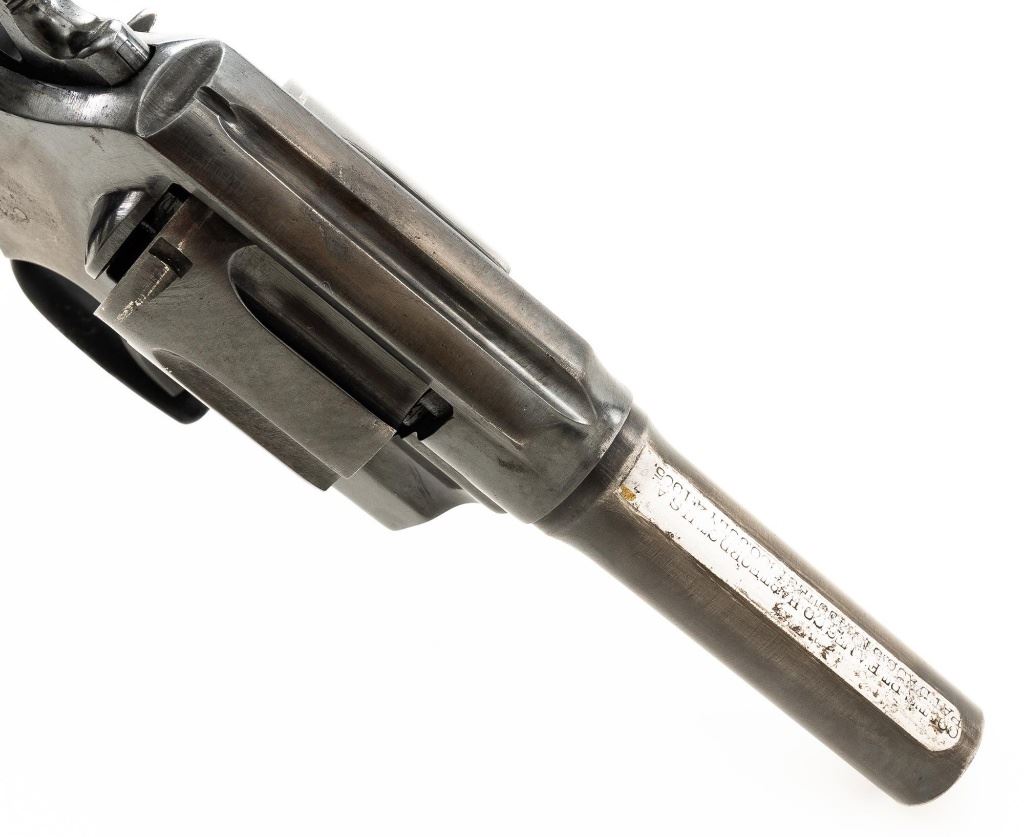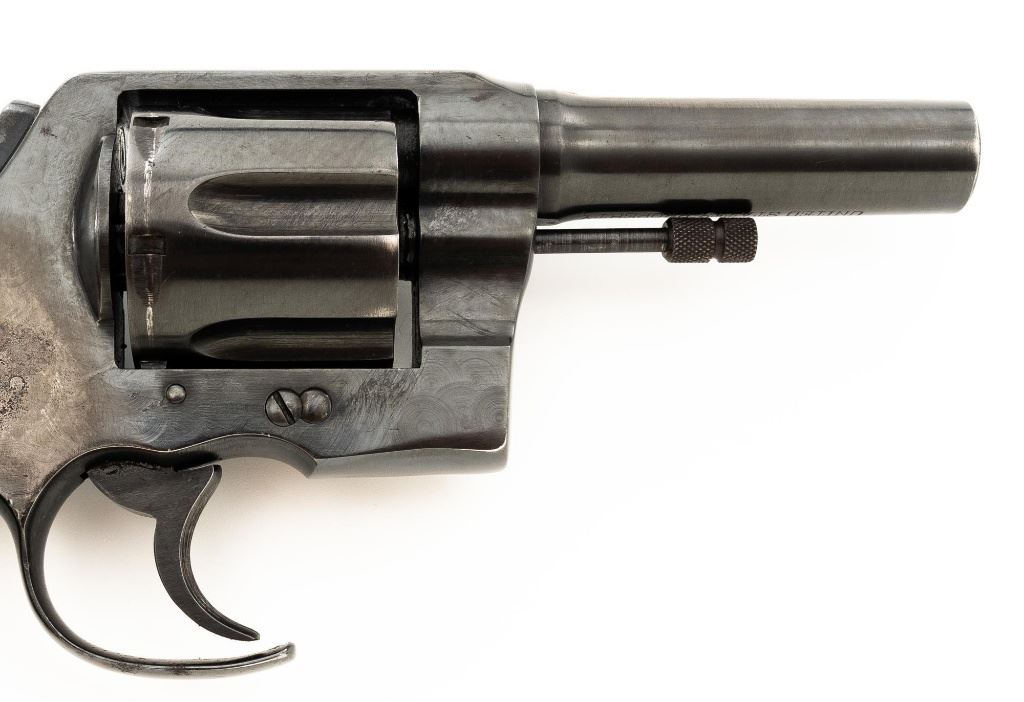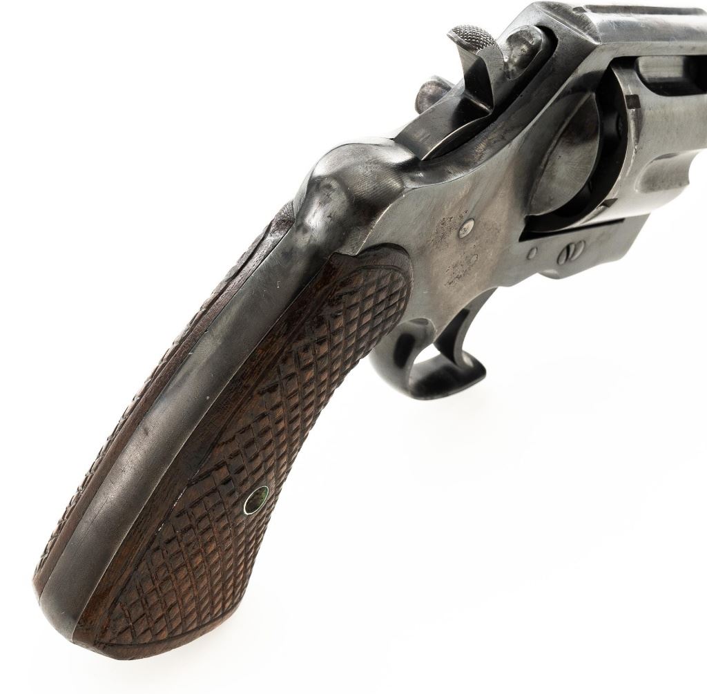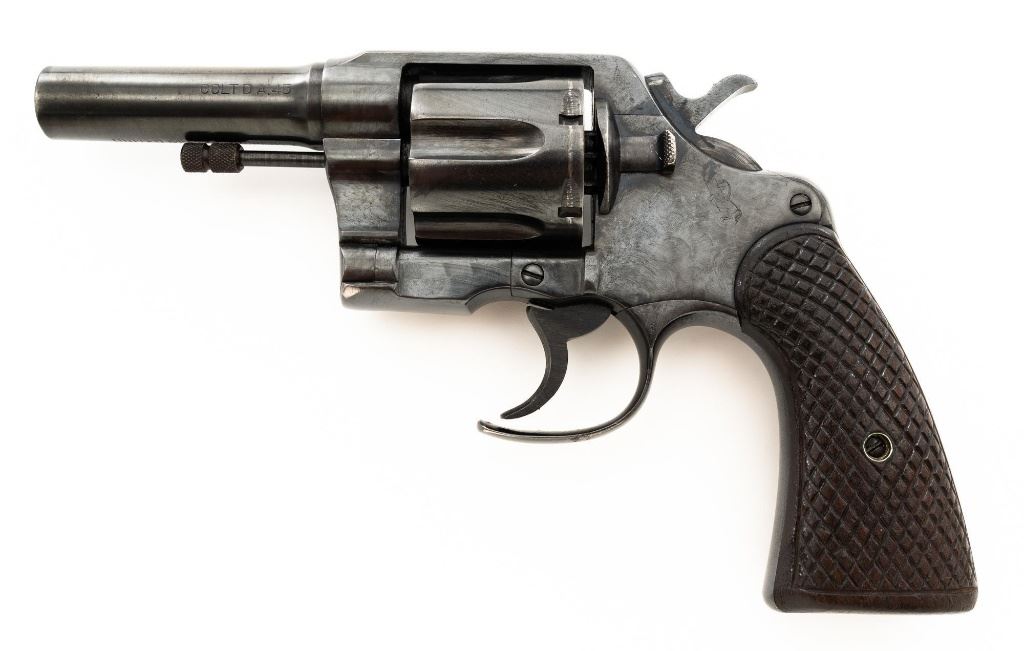 Custom Colt New Service Model 1917 Army Double Action Revolver, #262776, .45 ACP cal., 3.75" shortened barrel, blue finish, hand checkered walnut two-piece grips, missing lanyard ring, front sight removed, fixed "U"-notch rear sight, "Fitz Special" style cut trigger guard, with polished engine turned finish on frame. "(Rampant Colt)" still visible at the left rear of the frame. Barrel address is nearly polished out. Mfgd 1920. Revolver is in very good condition as customized and refinished, retaining approx. 85%-90% reblued finish. Frame has been engine turned with light pitting on the right side and some signs of aggressive cleaning. Hand checkered grips are in fine condition and appear to be original to the revolver with the matching serial number written in pencil on the interior of both panels. Action functions well and locks up securely. Bore is good with moderate erosion and frosting, displaying defined rifling. Est.: $600-$800. (C&R/PPT)