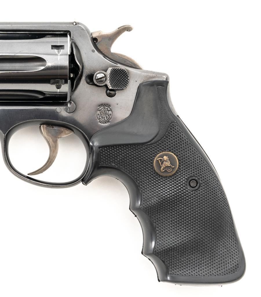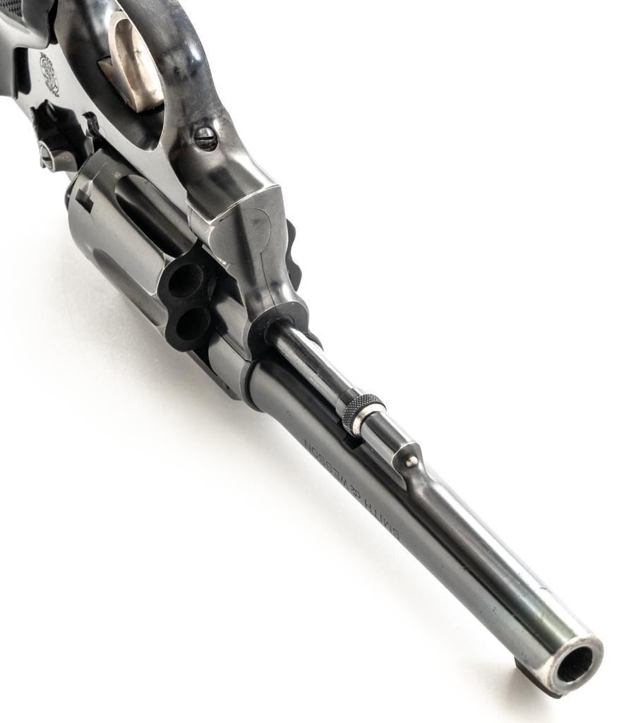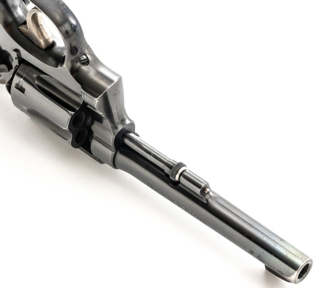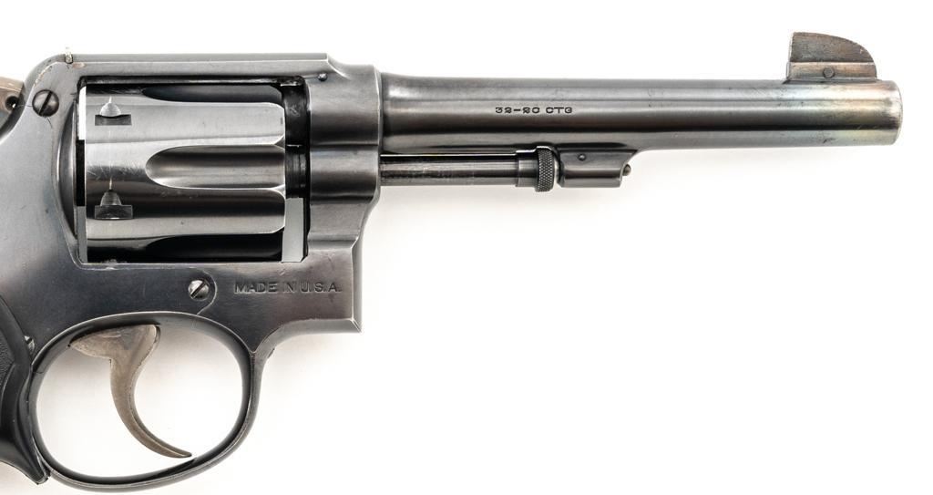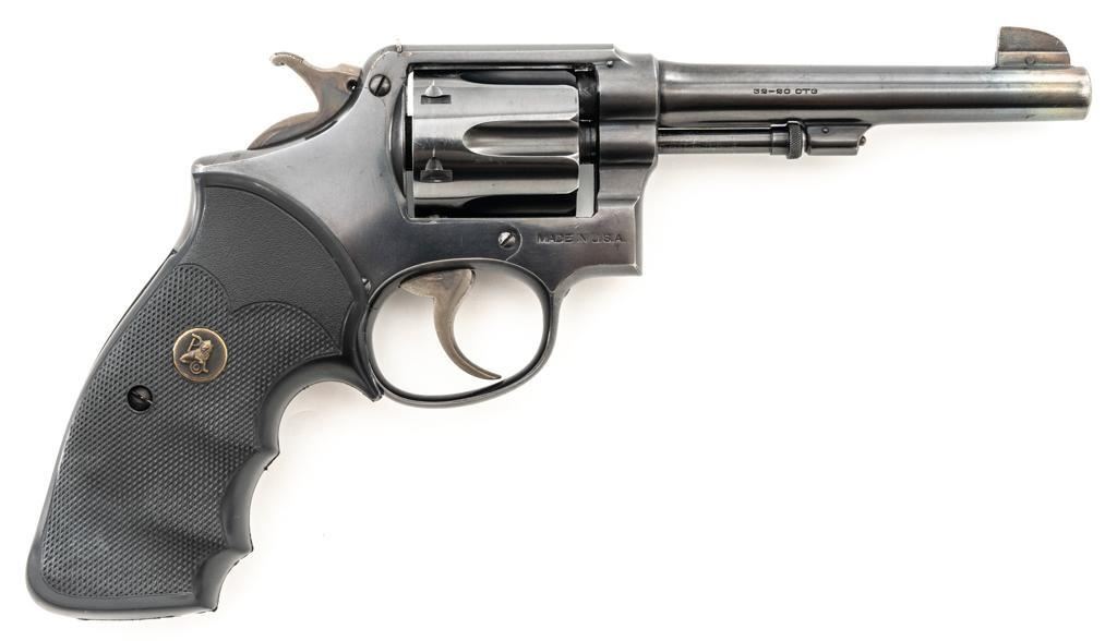 Smith & Wesson Model of 1905 Hand Ejector (4th Change) Double Action Revolver, #118834, .32-20 cal., 5" pinned barrel, blue finish, checkered rubber Pachmayr "Gripper" two-piece grips, color case hardened hammer and trigger, pinned blade front sight, and fixed square-notch rear sight. Revolver is in fine overall condition, retaining approx. 94%-95% thinning factory finish with wear at the muzzle, scratches and marks on the barrel where the front sight was replaced. Frame shows high point edgewear and minor marks. Grips show moderate age ad wear. Action cycles smoothly and locks up securely. Bore is very good with defined rifling. Est.: $300-$500. (C&R/PPT)