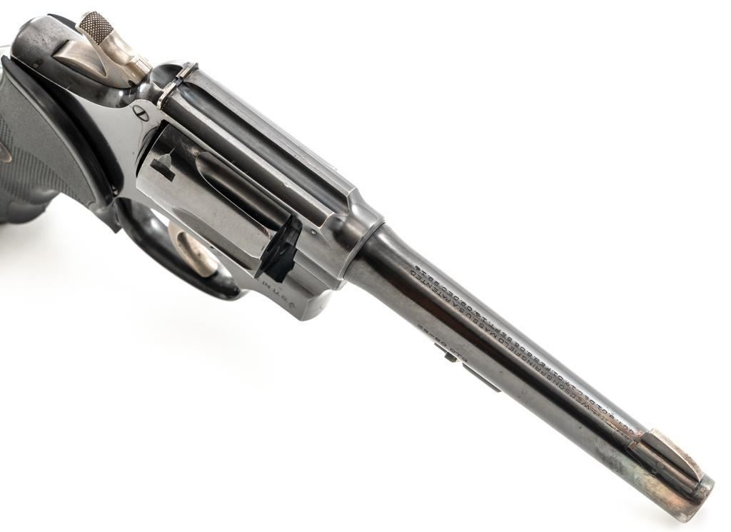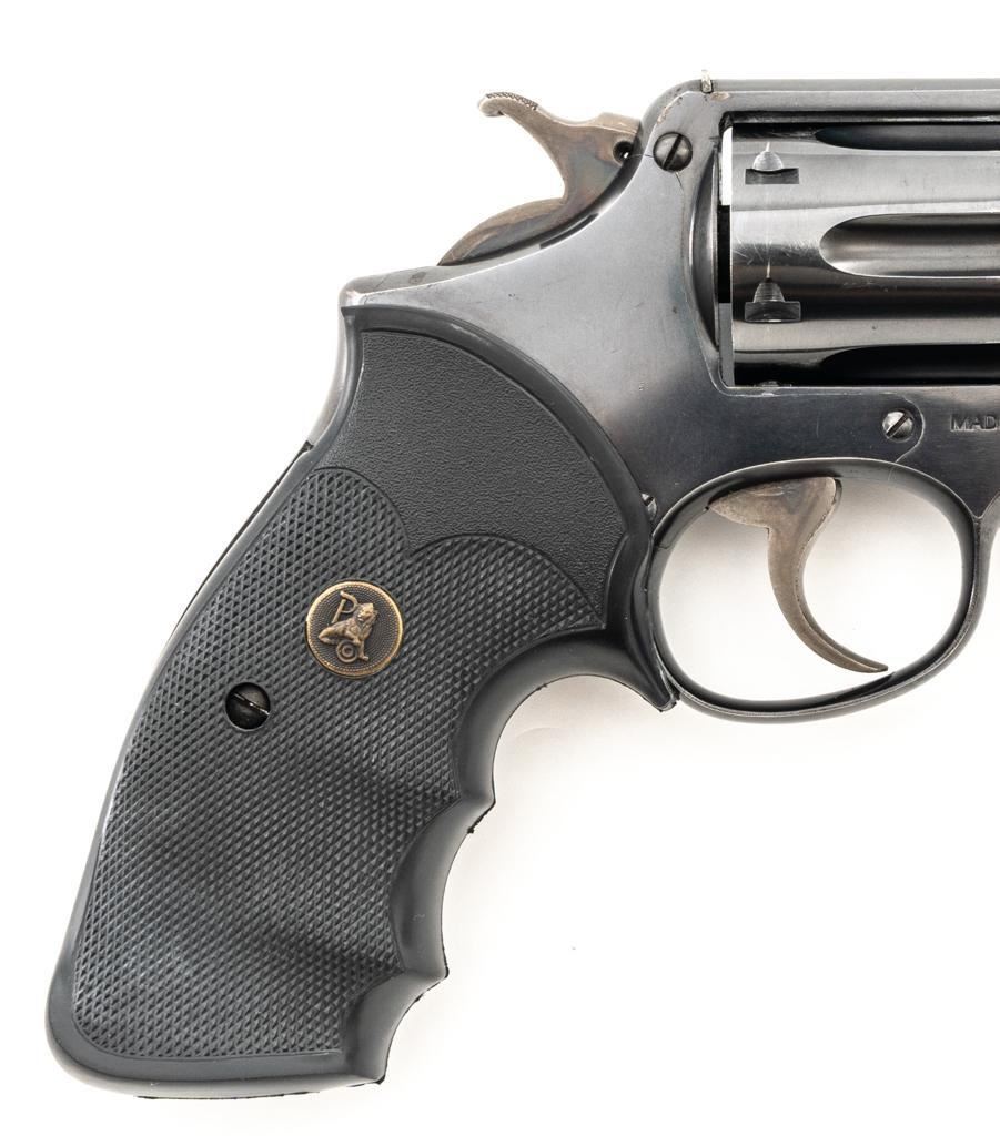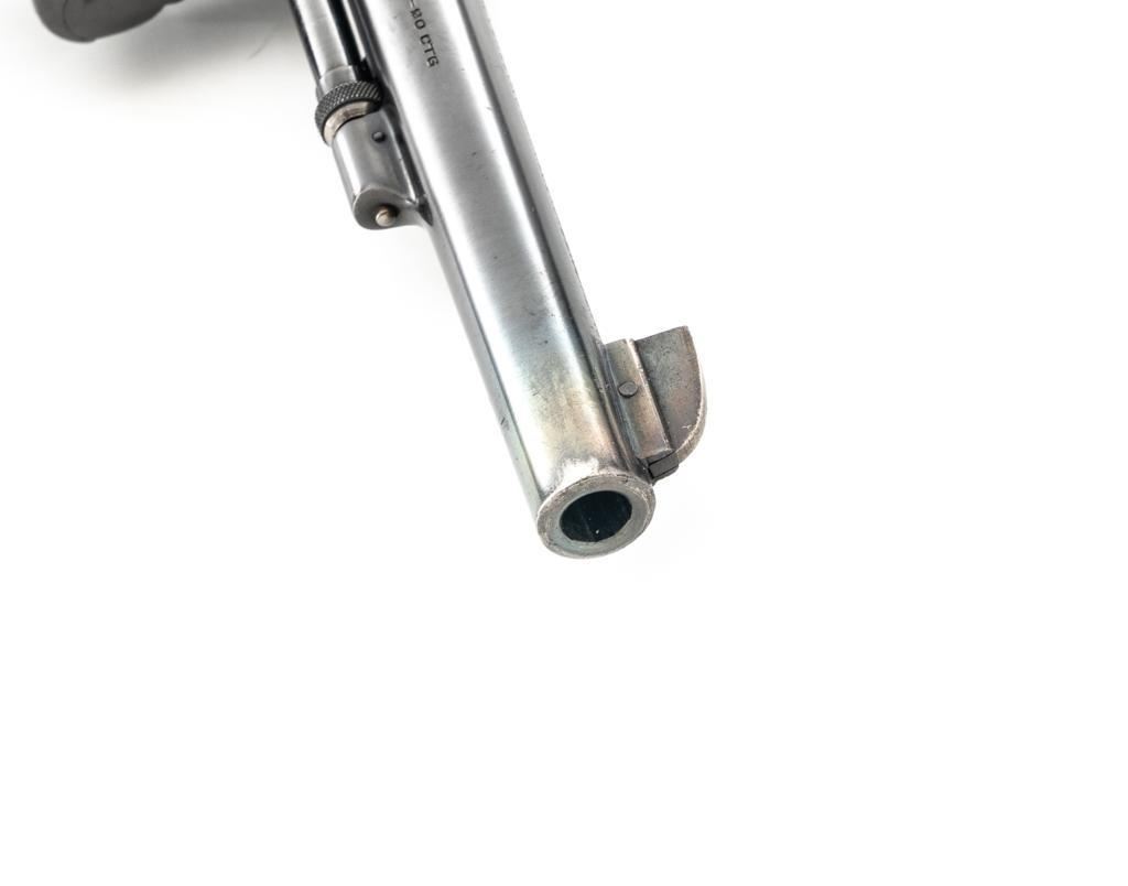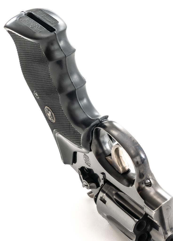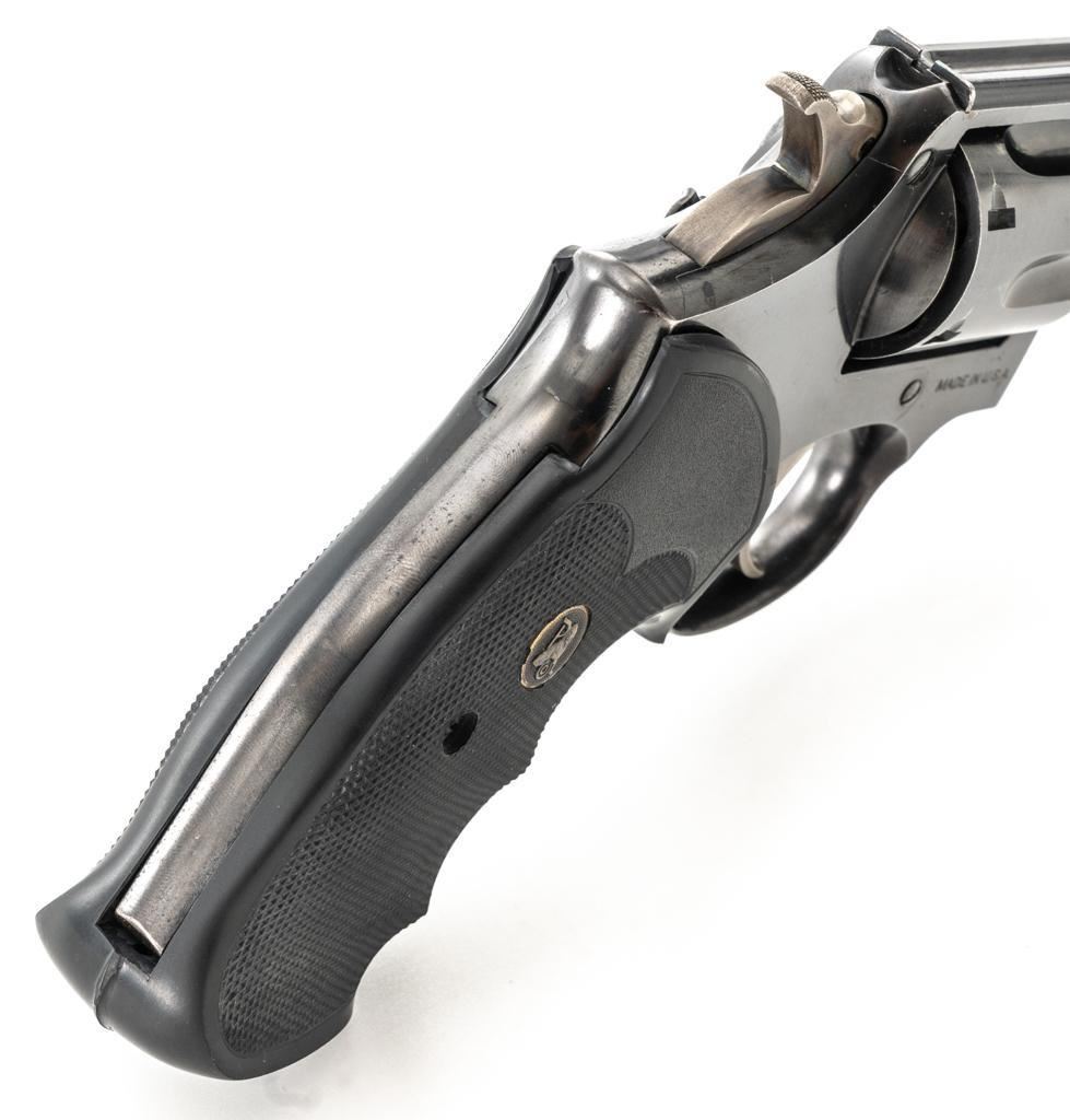 Smith & Wesson Model of 1905 Hand Ejector (4th Change) Double Action Revolver, #118834, .32-20 cal., 5" pinned barrel, blue finish, checkered rubber Pachmayr "Gripper" two-piece grips, color case hardened hammer and trigger, pinned blade front sight, and fixed square-notch rear sight. Revolver is in fine overall condition, retaining approx. 94%-95% thinning factory finish with wear at the muzzle, scratches and marks on the barrel where the front sight was replaced. Frame shows high point edgewear and minor marks. Grips show moderate age ad wear. Action cycles smoothly and locks up securely. Bore is very good with defined rifling. Est.: $300-$500. (C&R/PPT)