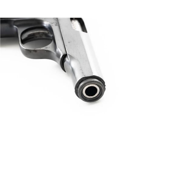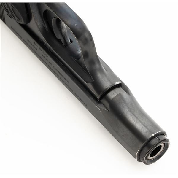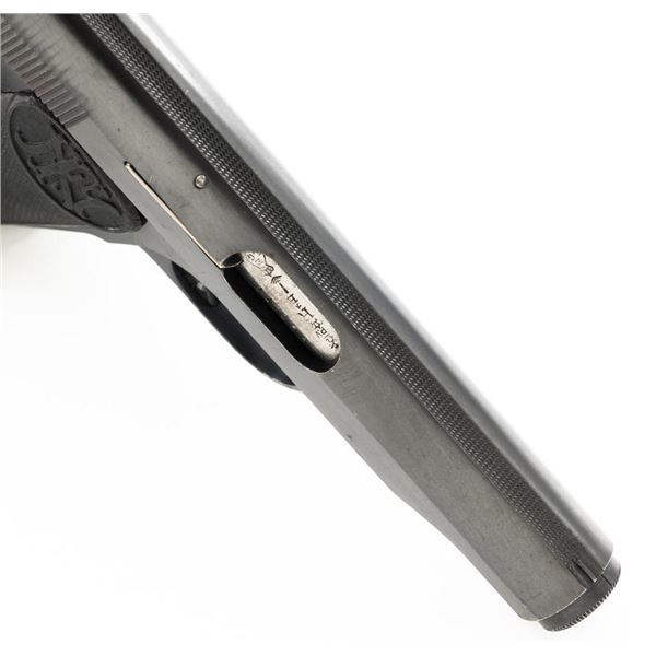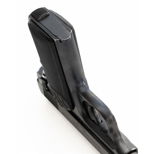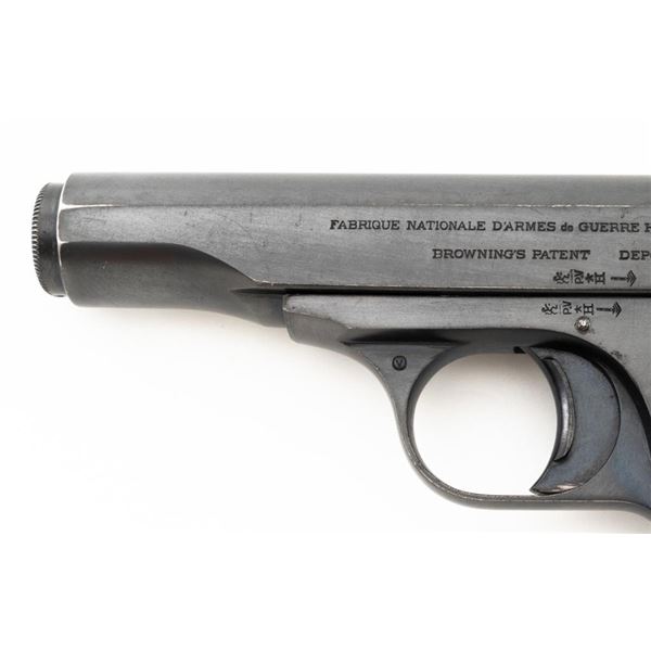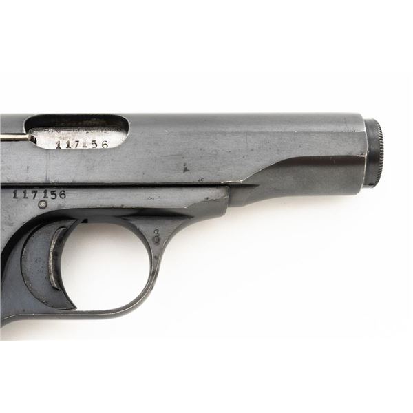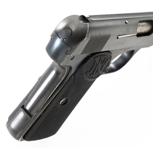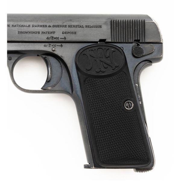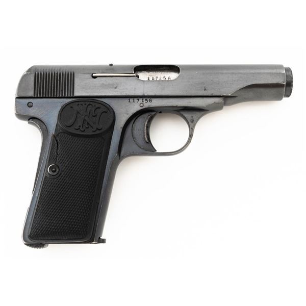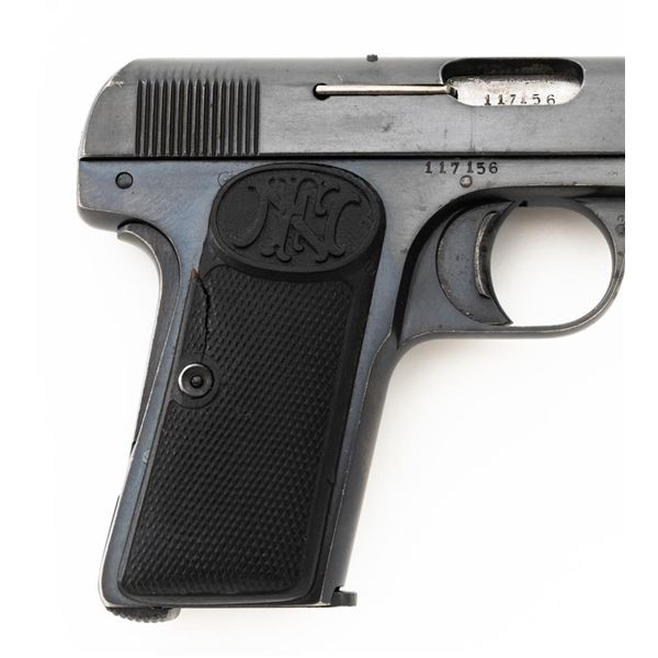 FN Model 1910 Semi-Automatic Pistol, #117156, .32 ACP cal., 3.5" barrel, blued finish, black plastic grips embossed with "FN" logos on each side, low profile blade front sight, and fixed rear sight with "U"-notched groove. Includes one blued steel magazine with "FN" logo on the right side. Pistol is marked "FABRIQUE NATIONALE DARMES de GUERRE HERSTAL BELGIQUE/BROWNINGS PATENT DEPOSE" on left side of the slide. There are Belgian proof and inspection stamps on the frame, slide, and barrel. Matching numbers on frame and barrel. Condition overall is fine, retaining approx. 87%-90% blue, showing toning and light handling wear. Left grip is excellent. Right grip with a crack extending upward from the screw. Action operates smoothly. Bore is bright with very good, clearly defined rifling. Est.: $350-$500. (C&R/PPT)