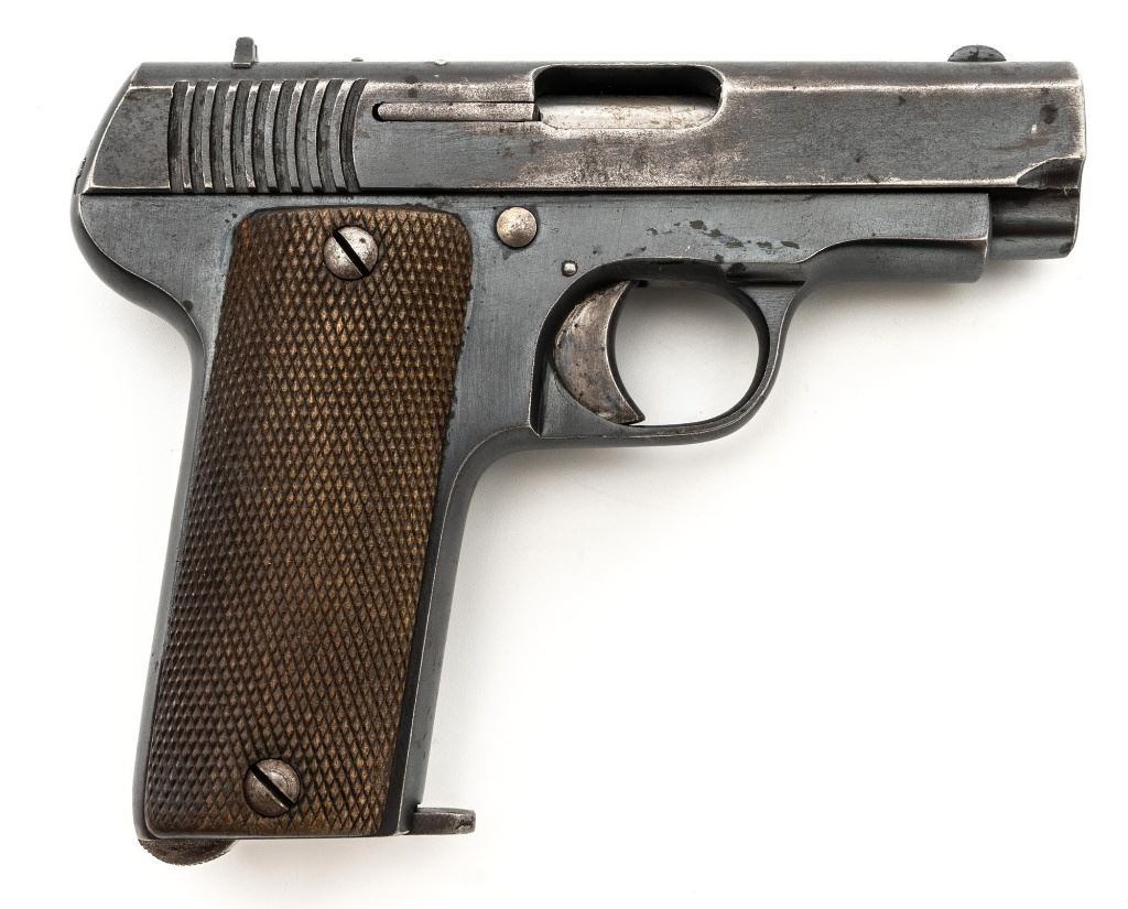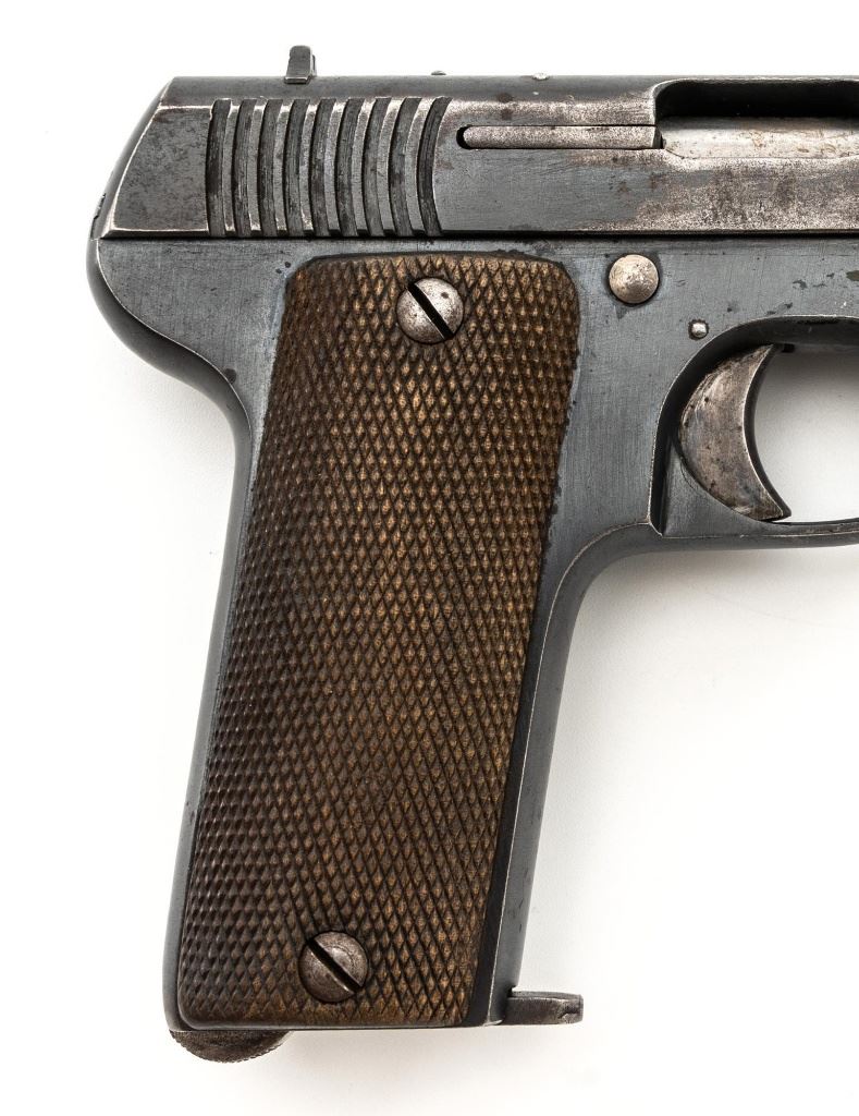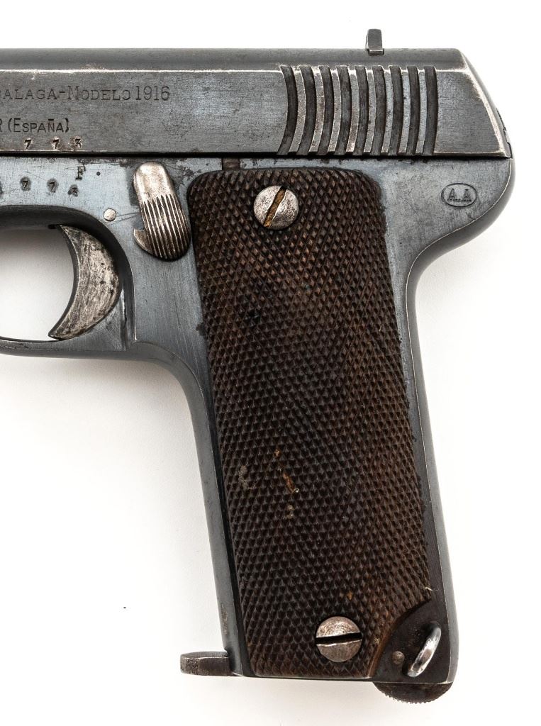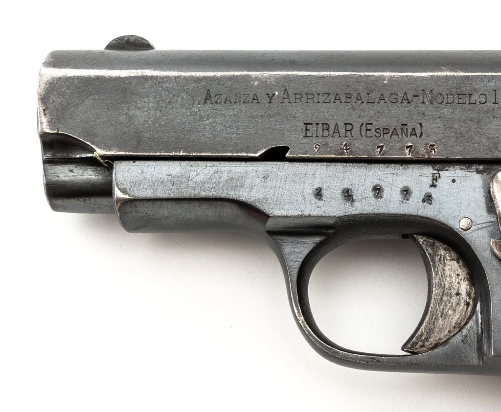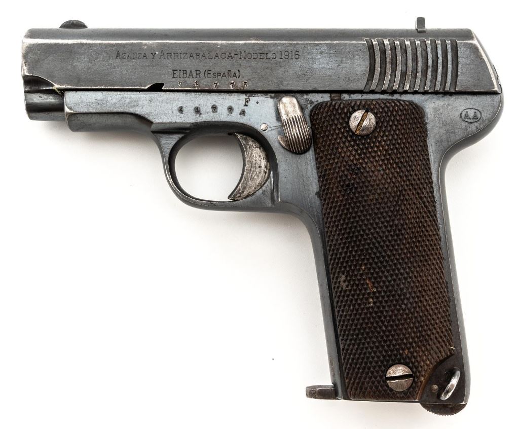 French Military Marked Spanish Model 1916 Ruby Semi-Automatic Pistol, #24773, .32 ACP cal., 3.5" barrel, blued finish, checkered hardwood grips, blade front sight, fixed rear sight with "V"-notched groove, and fixed lanyard loop at left side of the frame. Includes one blued steel magazine, stamped "A.A" on the floorplate, with a "(sunburst symbol)" on the spine. Pistol is marked "AZANZA Y ARRIZABALAGA-MODELO 1916/EIBAR(ESPANA)" on left side of the slide. Marked "A.A" on left side of the frame. There are two French "(military stars)" stamped on the bottom of the frame. No visible import marks. Condition overall is good, retaining approx. 60% blue, showing general age and handling wear. Grips are very good, with handling marks, mainly to the left side. Action operates smoothly. Bore is bright with good, defined rifling. Est.: $250-$400. (C&R/PPT)